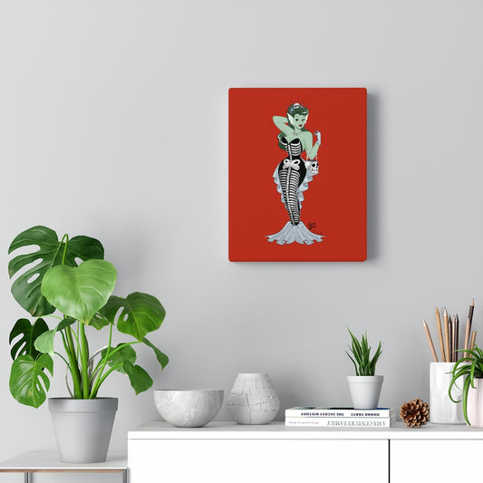 Skeleton Mermaid Babe - 8"x10" Canvas - RED