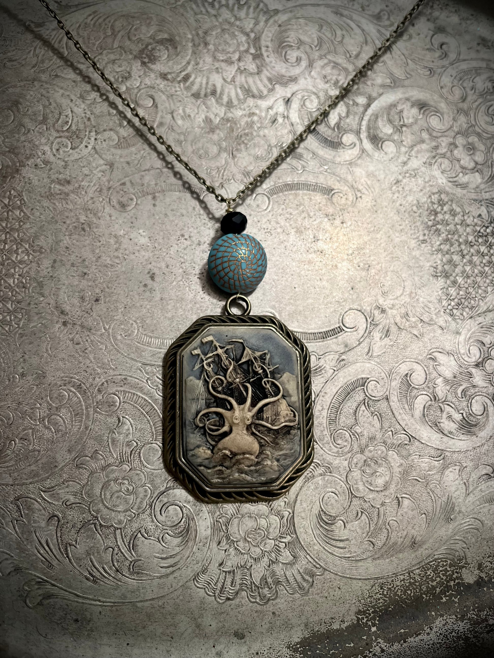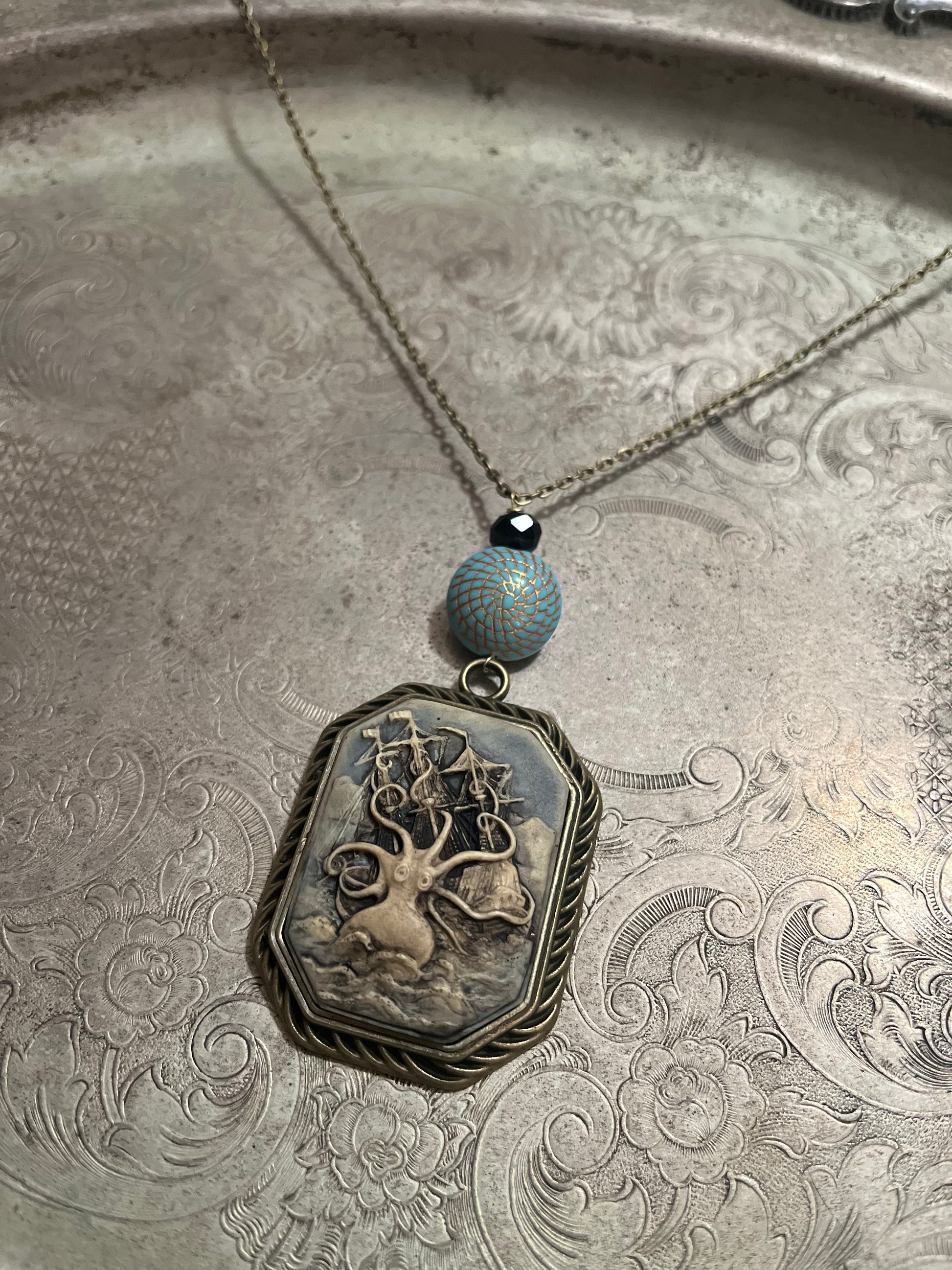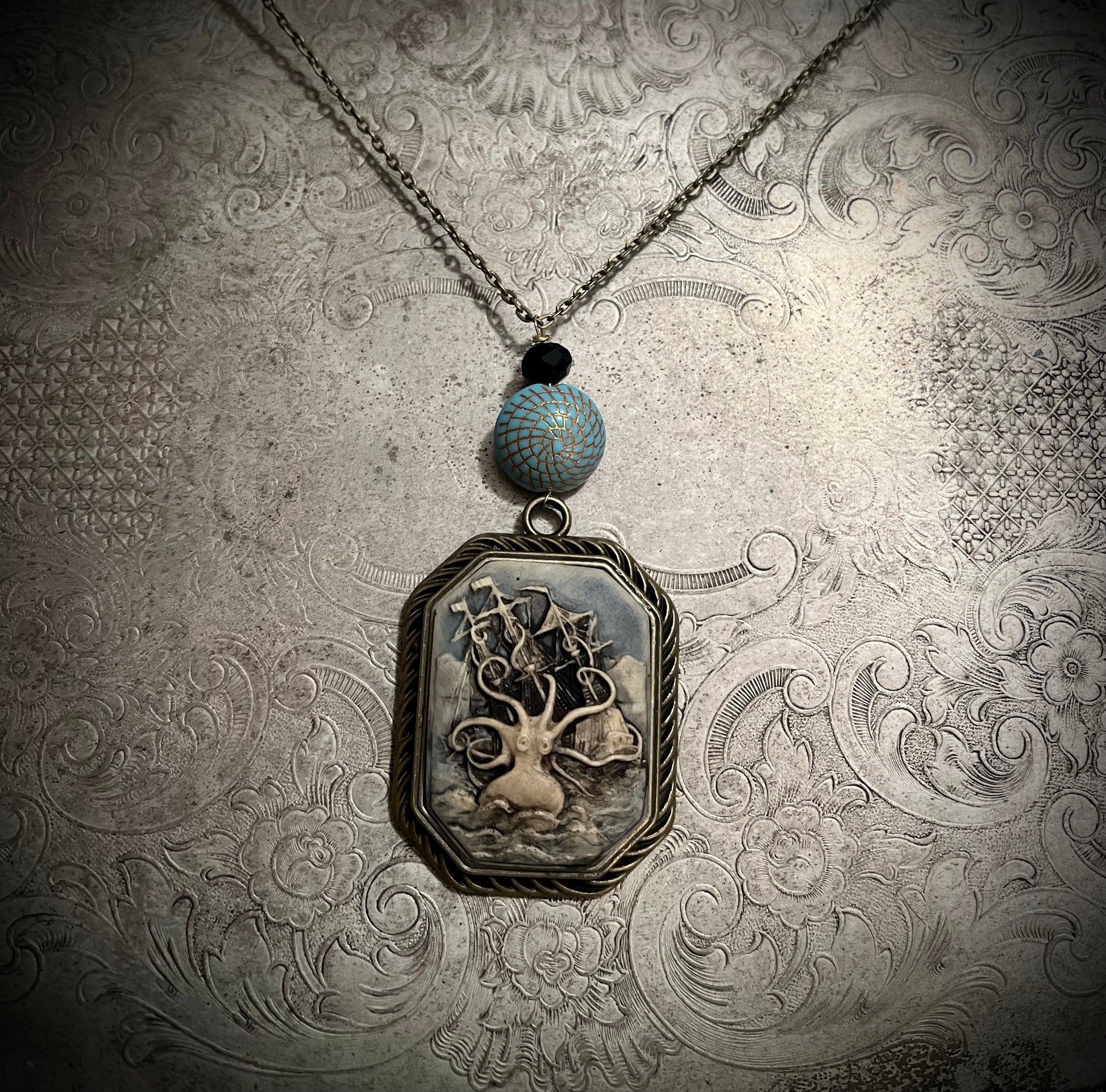 Hand antiqued resin Kraken taking down a ship cameo necklace with an antiqued brass bezel setting and resin & glass wire wrapped beads.