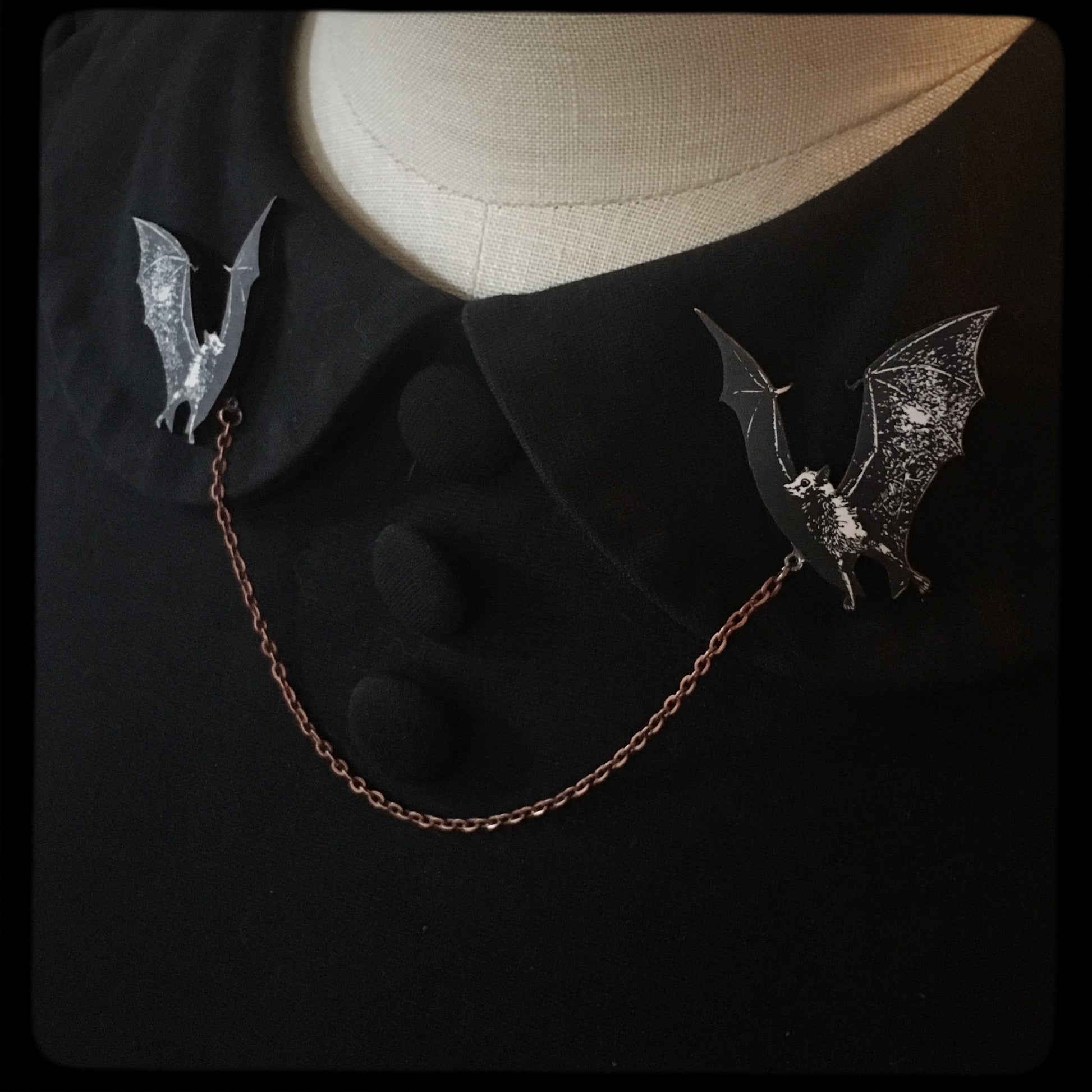 The Bats can be worn on your collar as pictured, or you can wear them a variety of other ways such as: sweater guard pins, jacket pins, scarf pins - on a tee -lots of options!