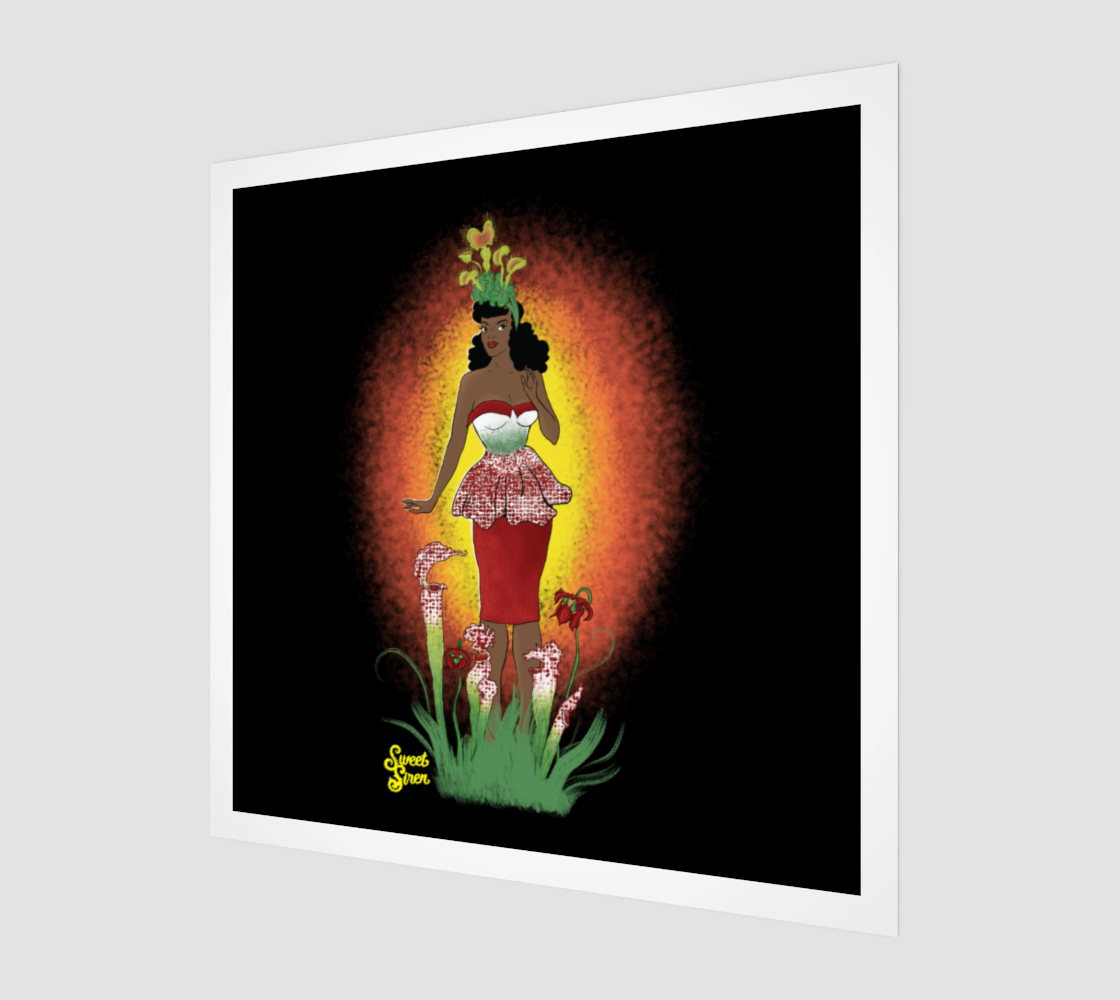 Carnivorous plants take over this gorgeous design! A beautiful lady with Venus Fly Traps growing out of her hair wrap, large overgrown Pitcher Plants sprouting up out of the ground all around her and the pattern of the Pitcher Plants delicately reflected on her vintage outfit.