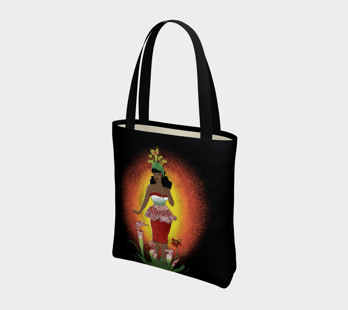 A beautiful lady with Venus Fly Traps growing out of her hair wrap, large overgrown Pitcher Plants sprouting up out of the ground all around her and the pattern of the Pitcher Plants delicately reflected on her vintage outfit.