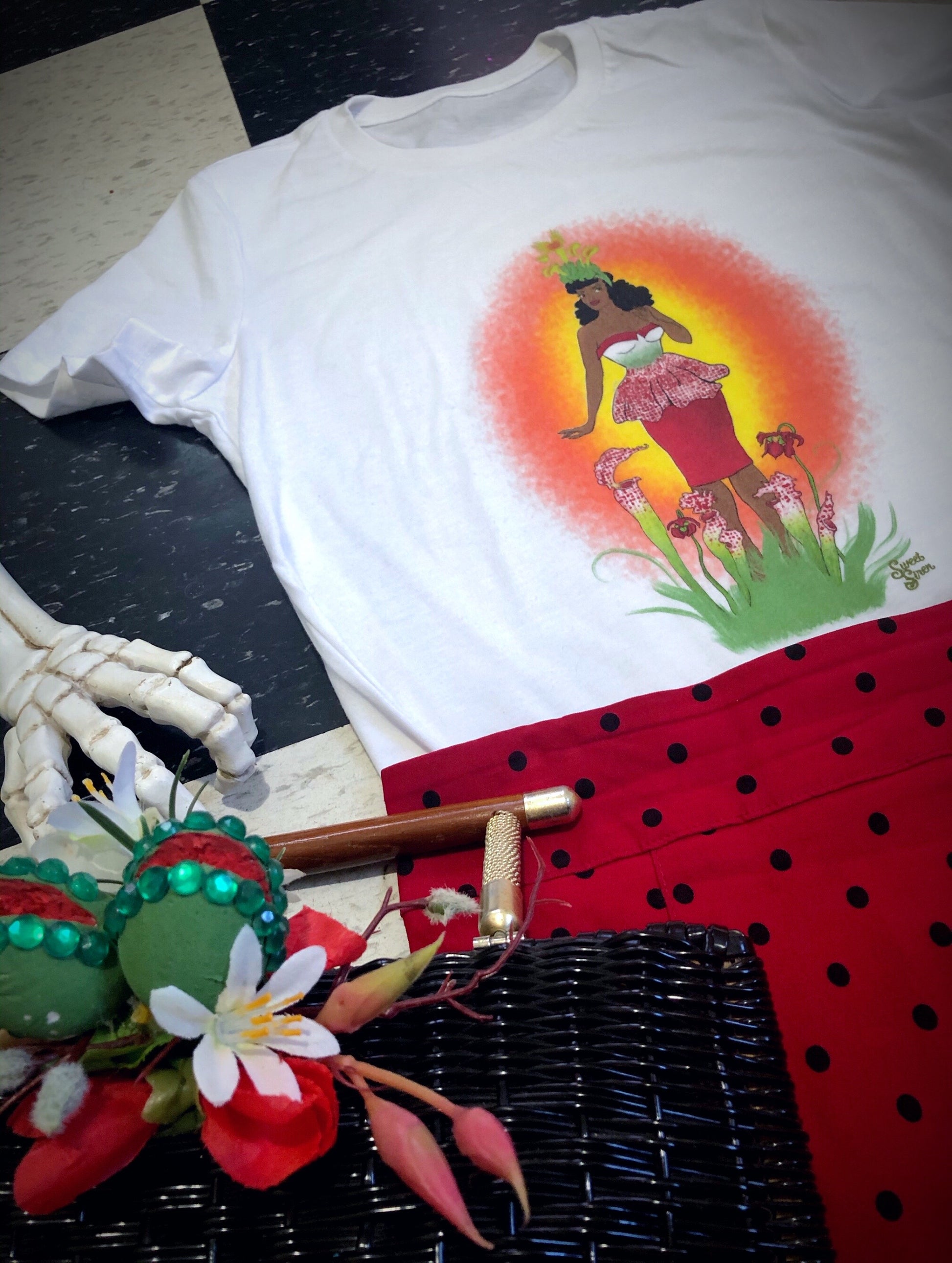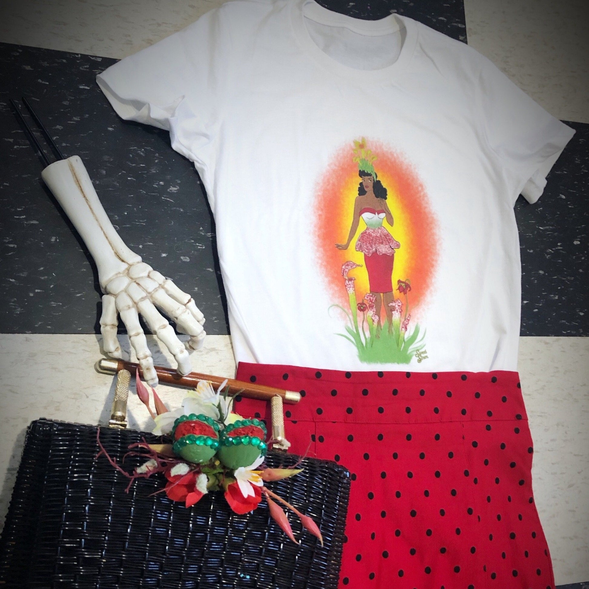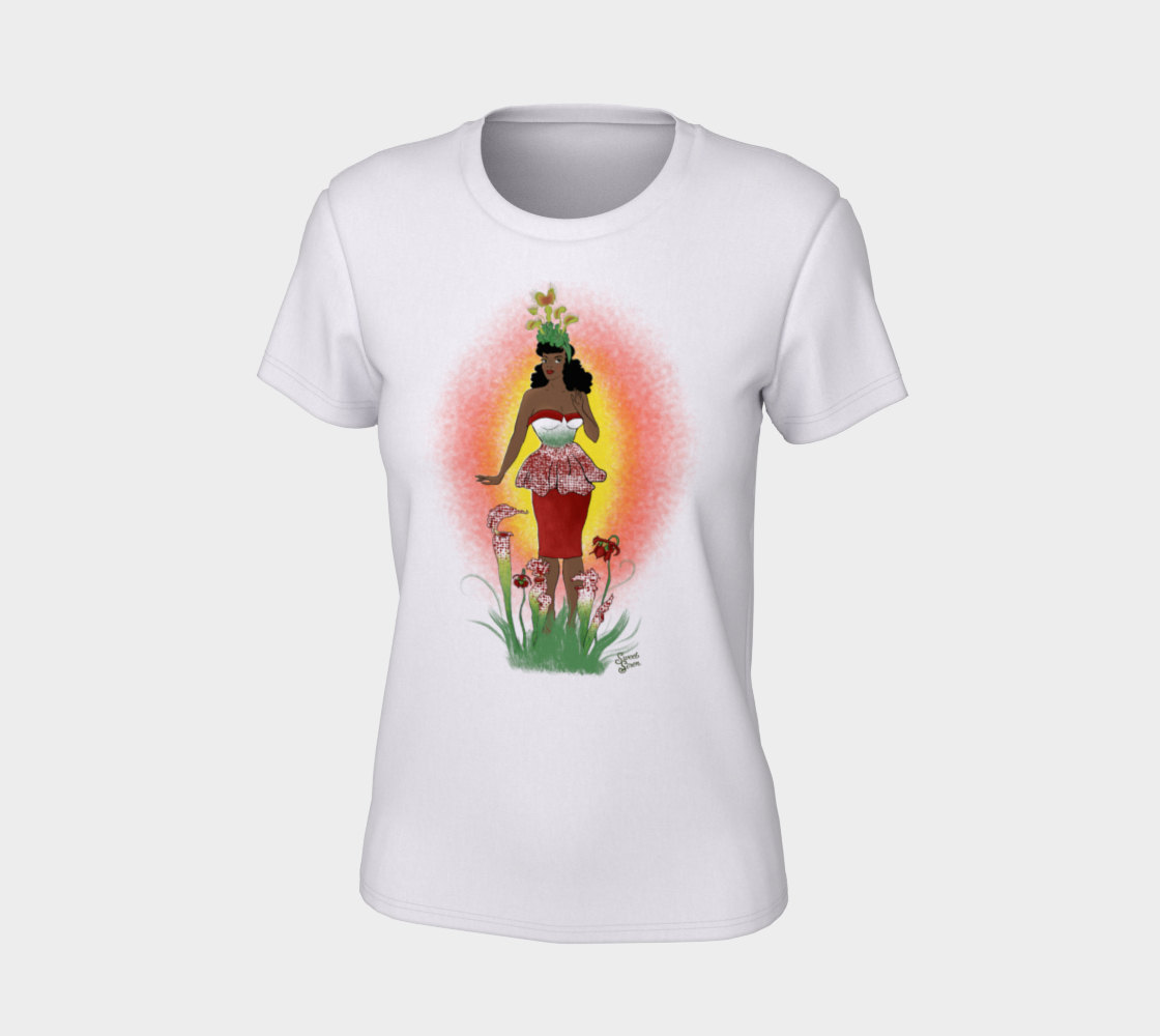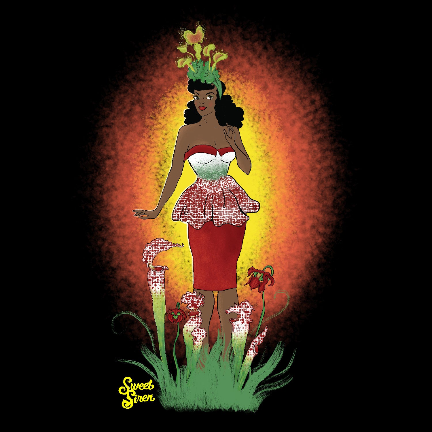 A beautiful lady with Venus Fly Traps growing out of her hair wrap, large overgrown Pitcher Plants sprouting up out of the ground all around her and the pattern of the Pitcher Plants delicately reflected on her vintage outfit.