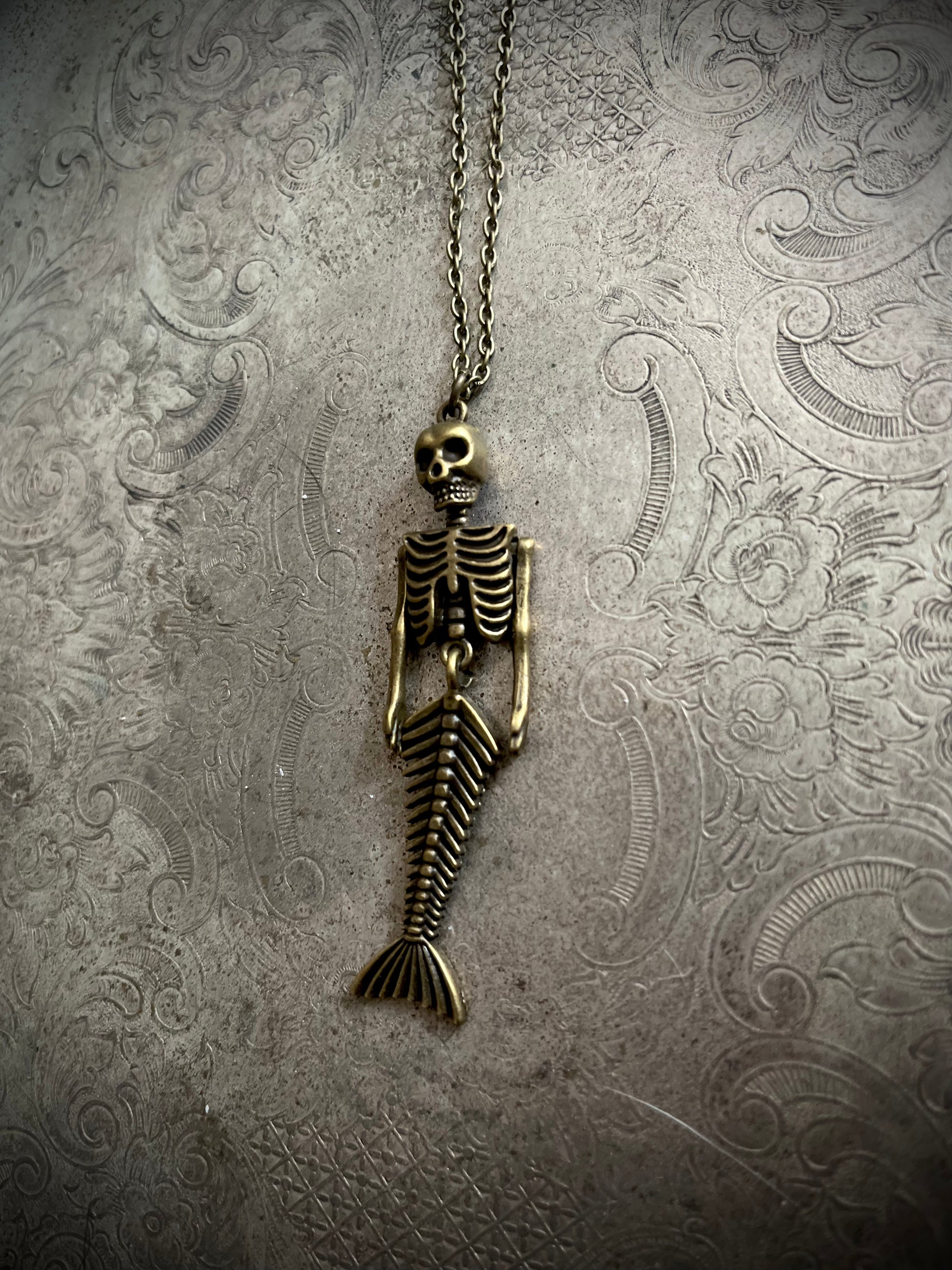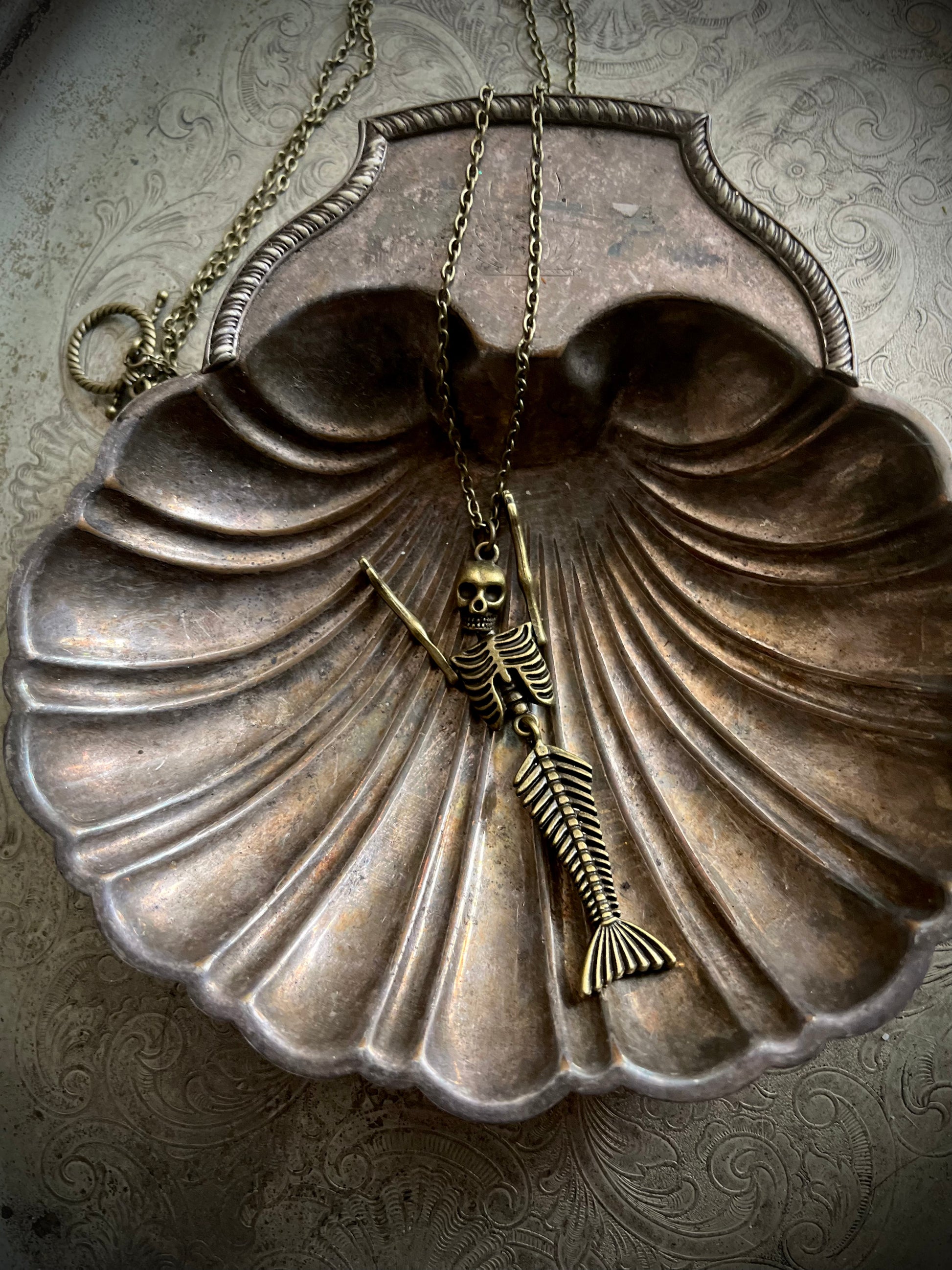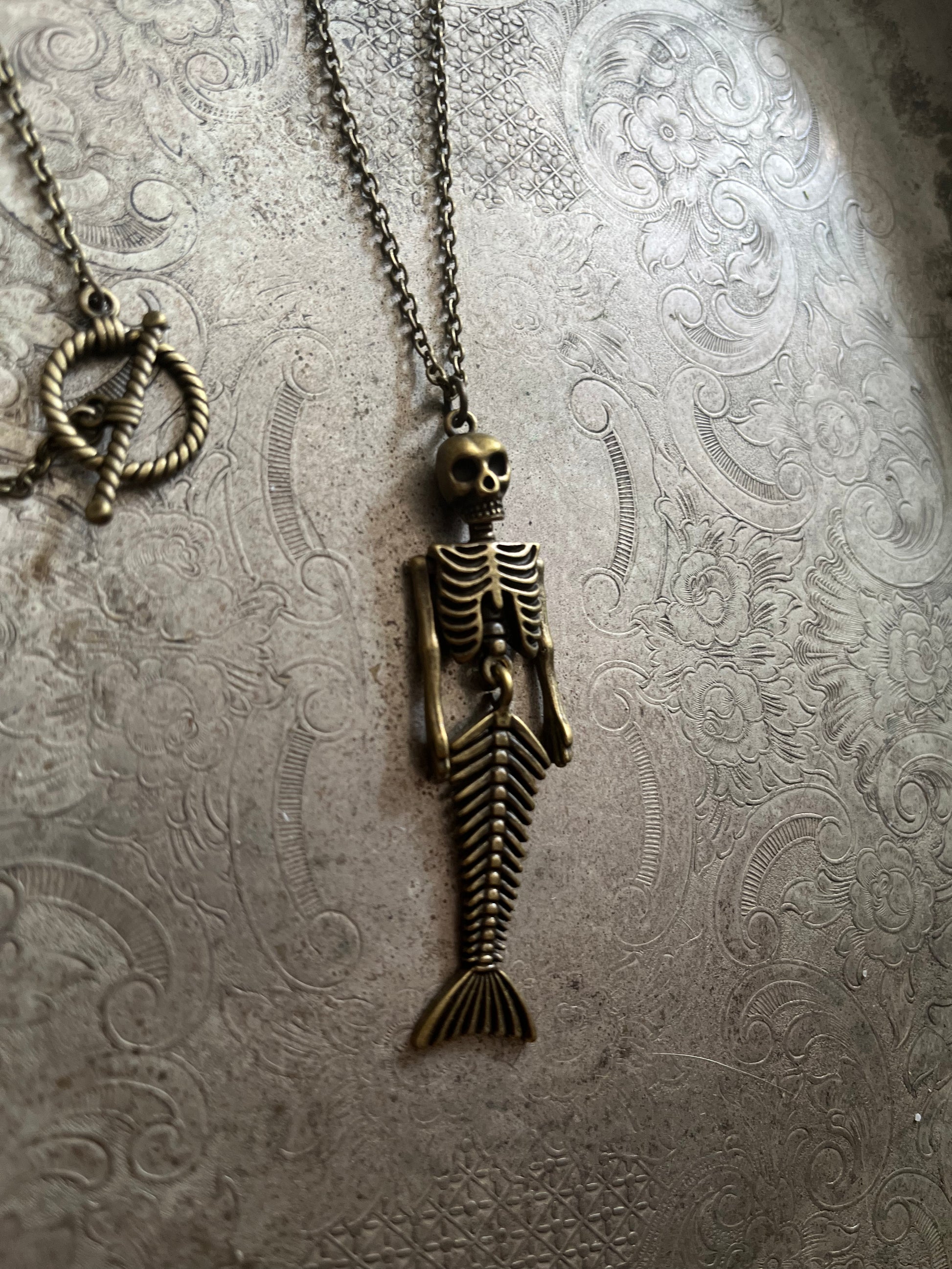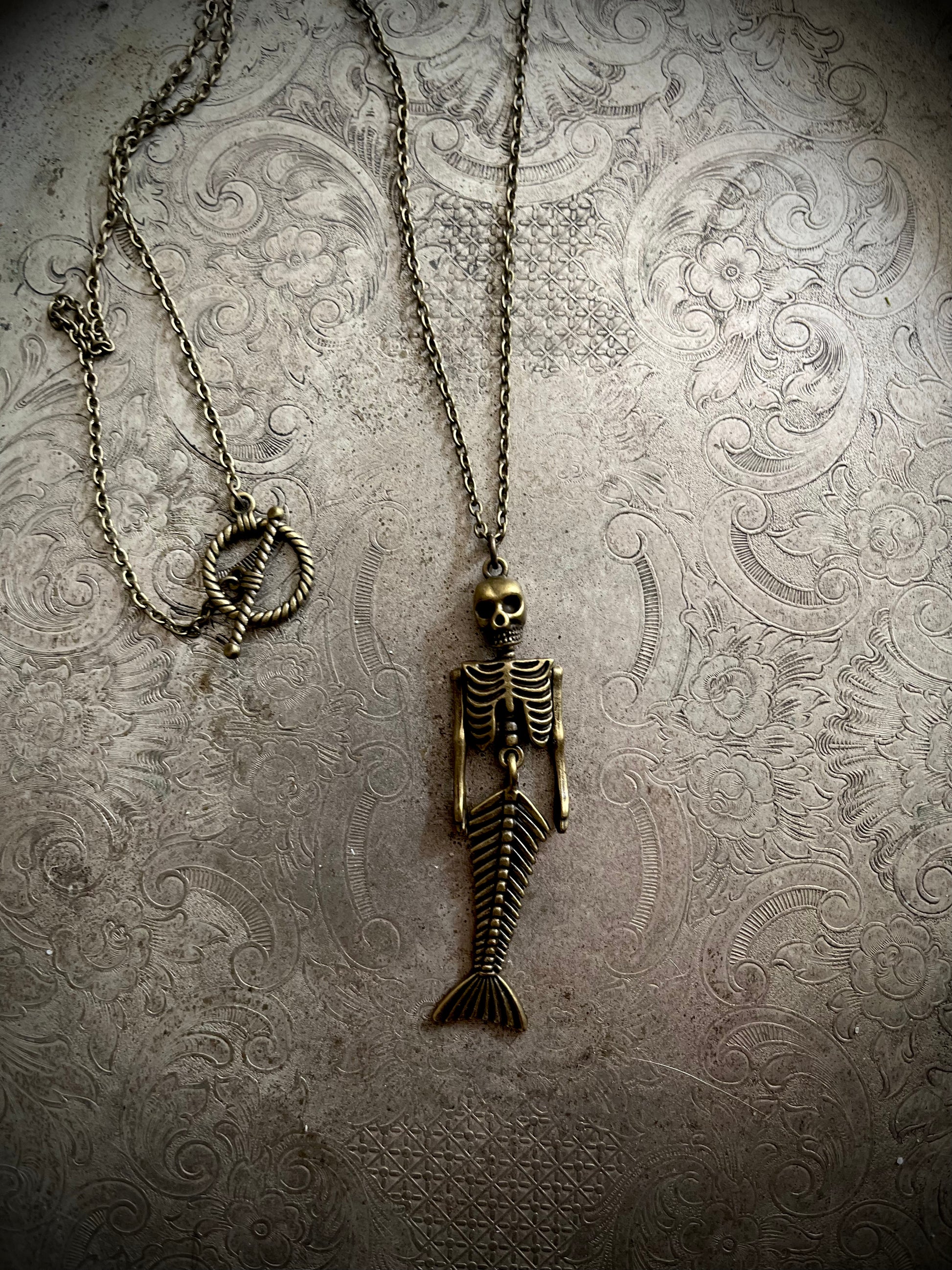 A Skeleton Mermaid antiqued Brass charm necklace.