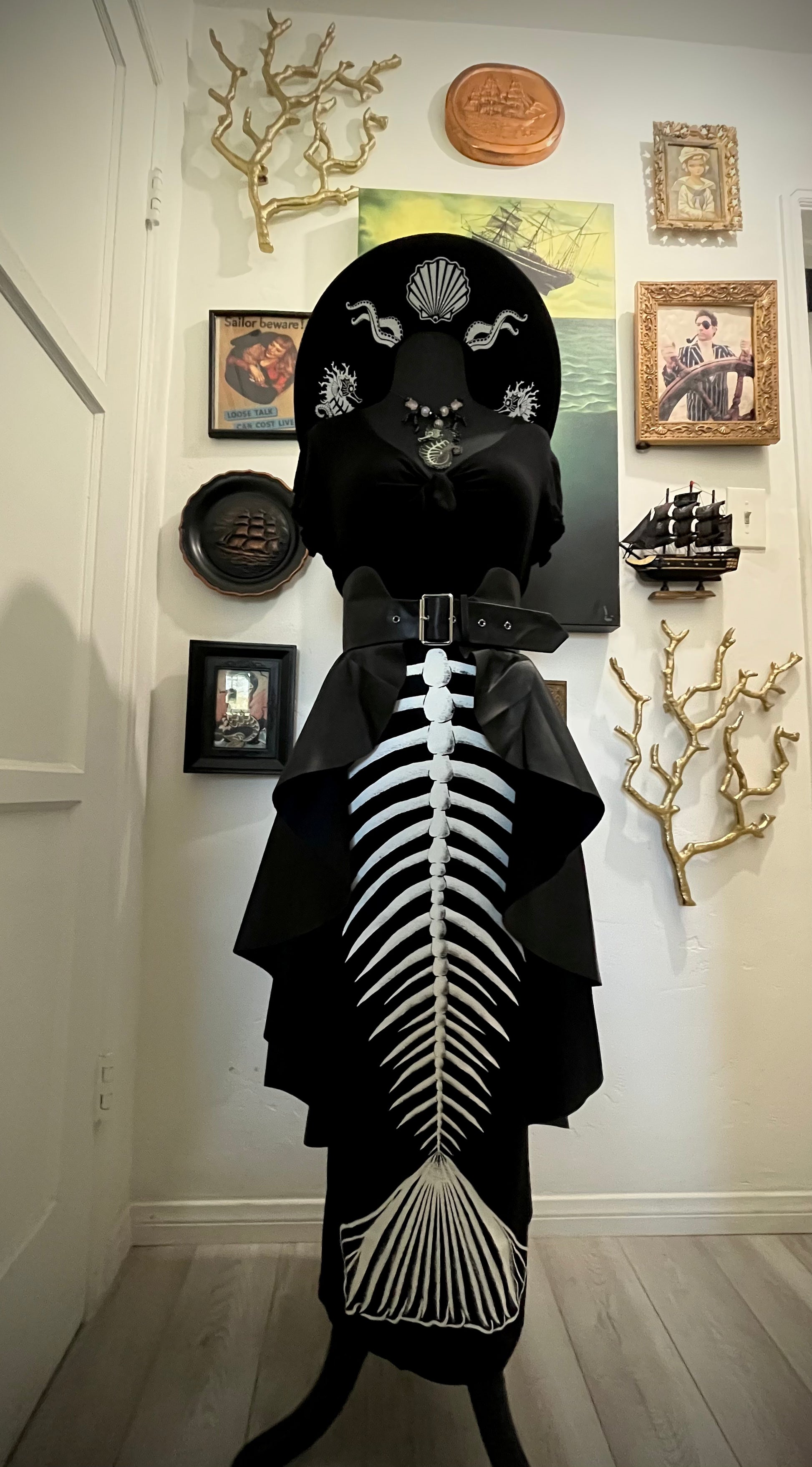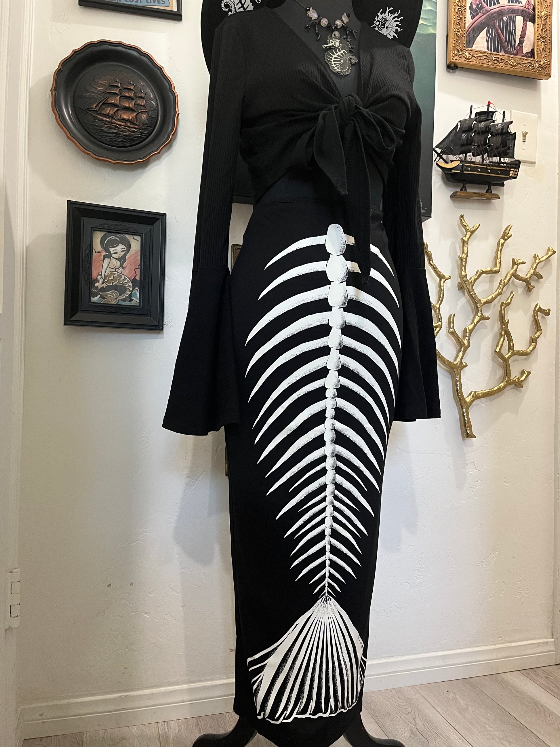 This skirt showcases a luminous print of a mermaid skeleton tail that glows in the dark in a flattering wiggle style with a side slit. Equipped with a side zipper, it is exceptionally comfortable and soft. It is remarkably stretchy, so size down for a tighter fit!