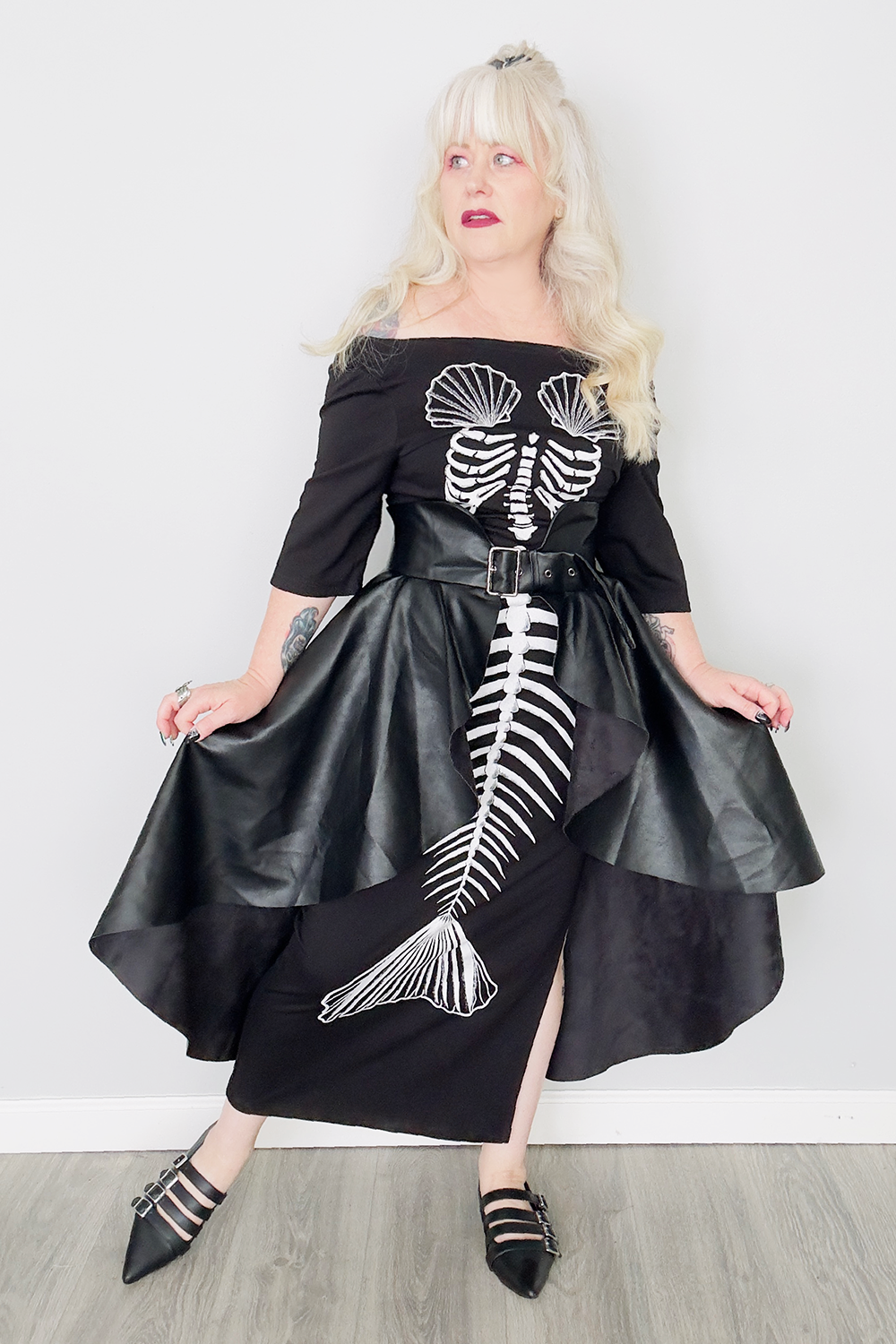 This stunning faux leather peplum belt is a must-have to complete your Ghastly Siren look! Slip it over the dress or wear it with the top and leggings for an unforgettable ensemble.
