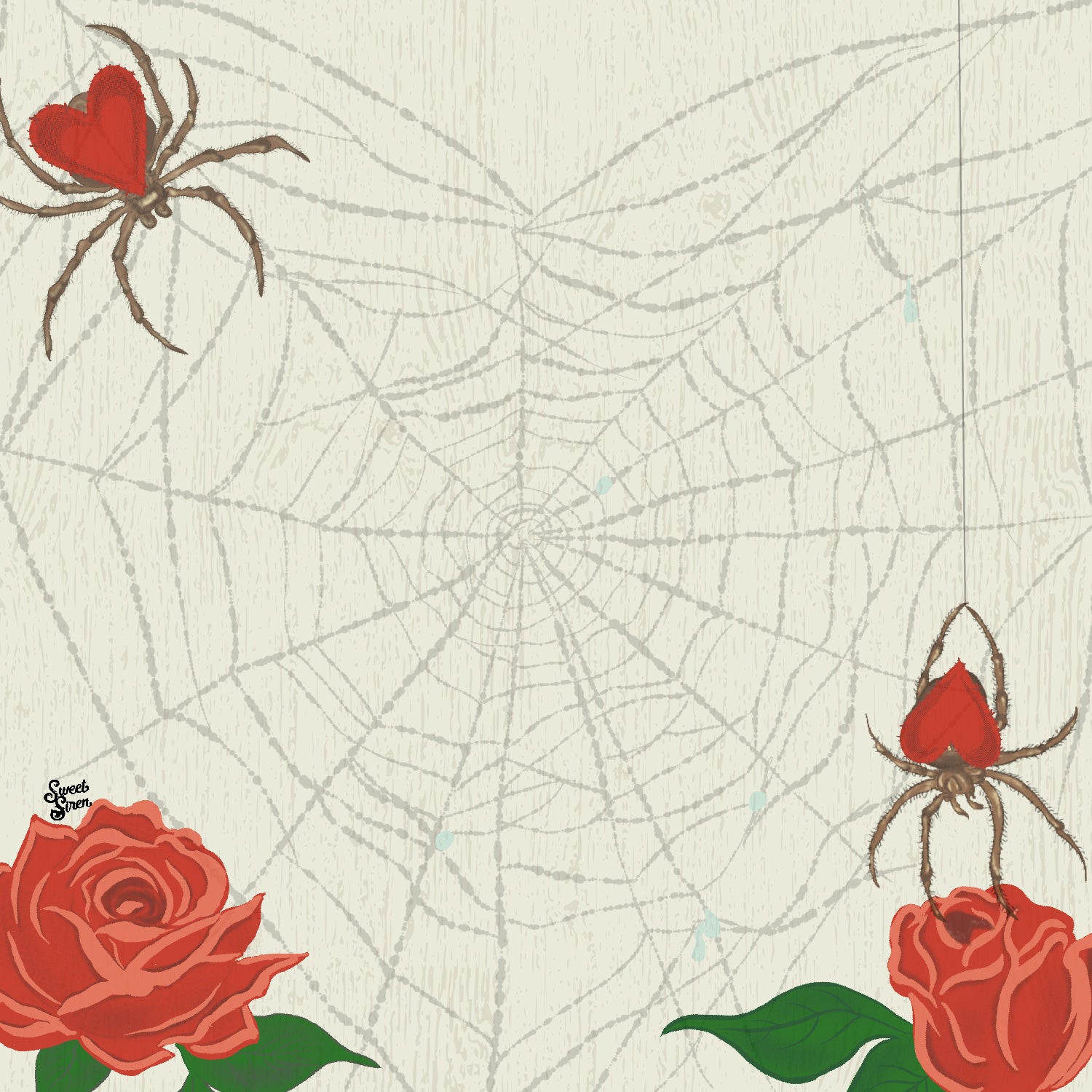A vintage inspired postcard with a heart shaped spider web, red roses and brown spiders with hearts.