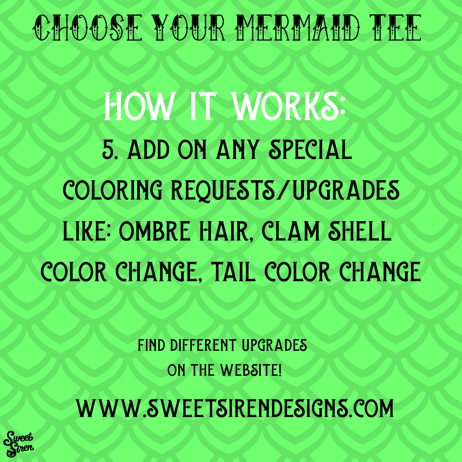 If you want more options like tail color change, ombre hair or sea shell color changes--you can upgrade and add those on! Just make a note during check out and I will email you back with a quote.