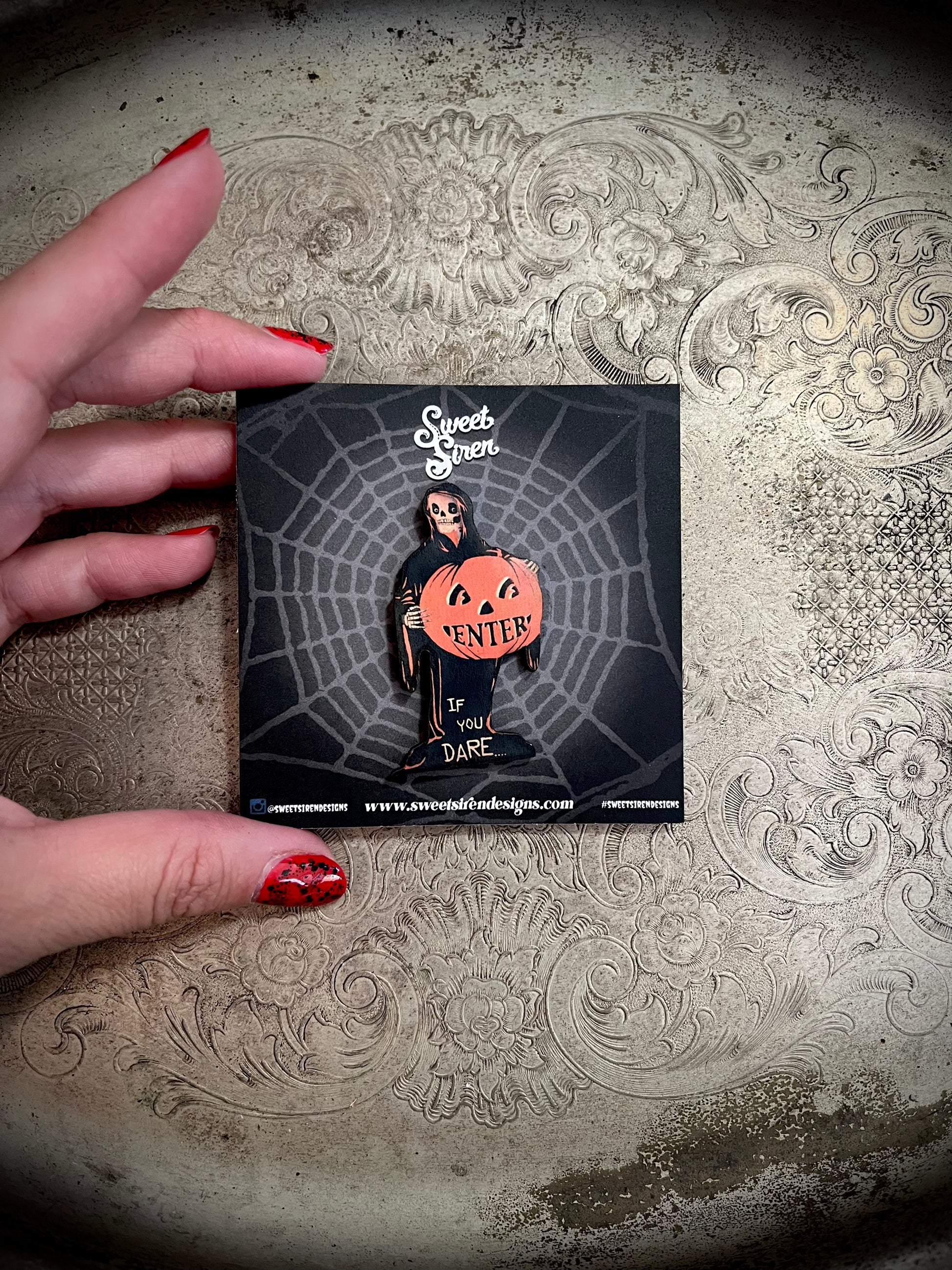 Enter if You Dare Tombstone wooden pin - printed paper on wood design.