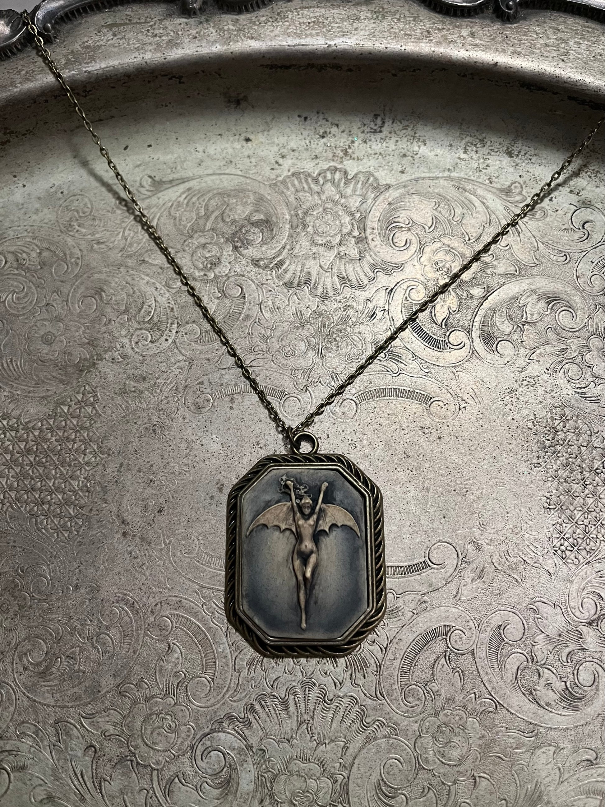 A gothic vampire spreading her bat wings in this icon resin cameo necklace with a antiqued brass setting. This piece is hand antiqued with an acrylic wash.