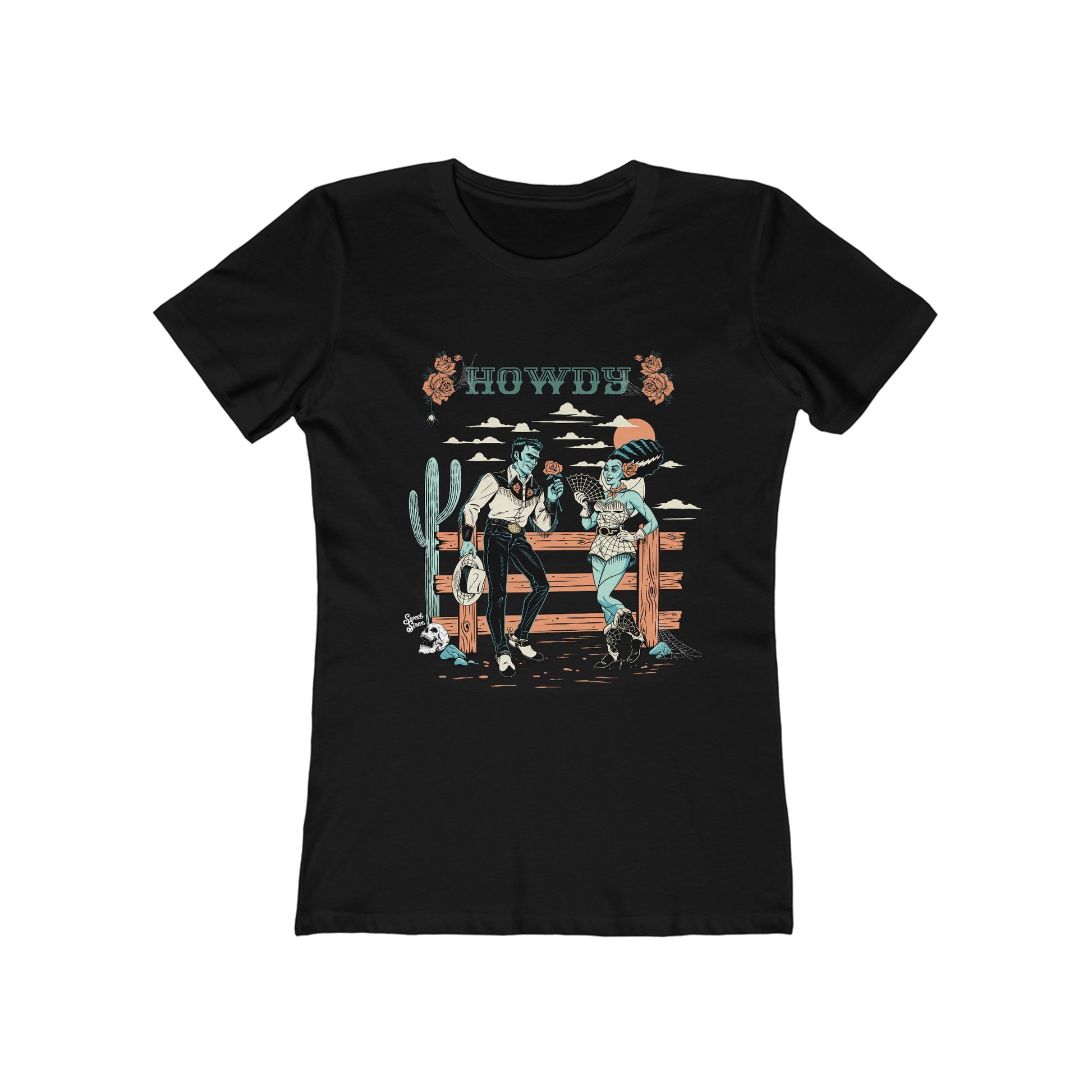 Frankenstein Monster and his Bride in retro western outfits with spiderwebs & roses.
