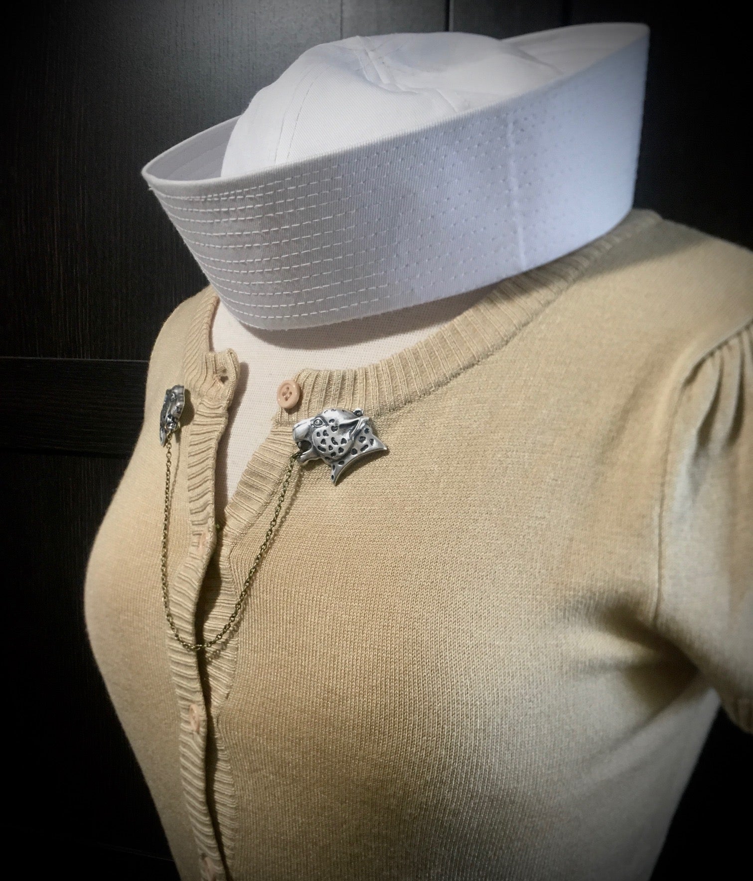 These can be worn on your shirt as pictured, or you can wear them a variety of other ways such as: collar pins, sweater guard pins, jacket pins, scarf pins - on a tee -lots of options!