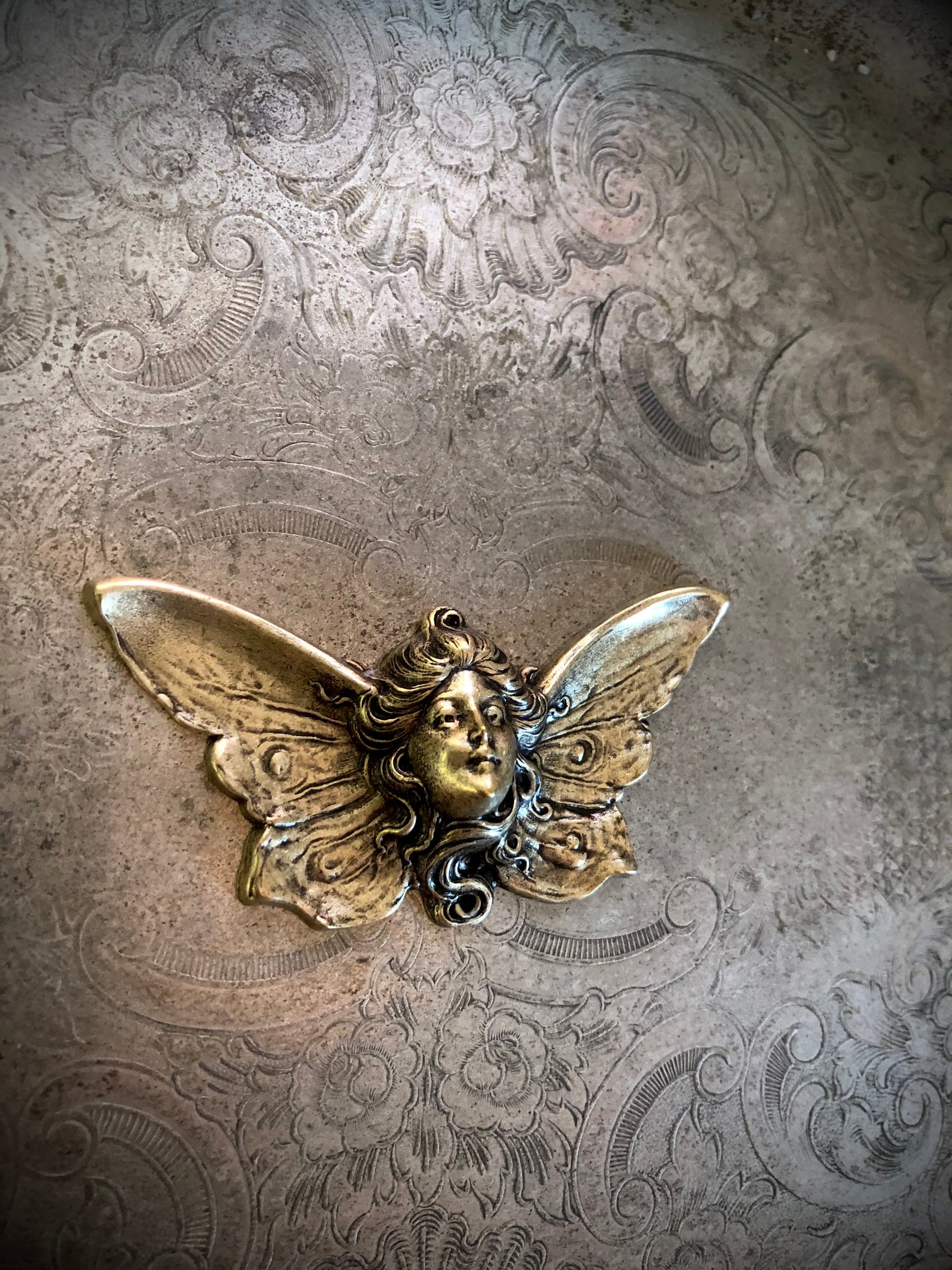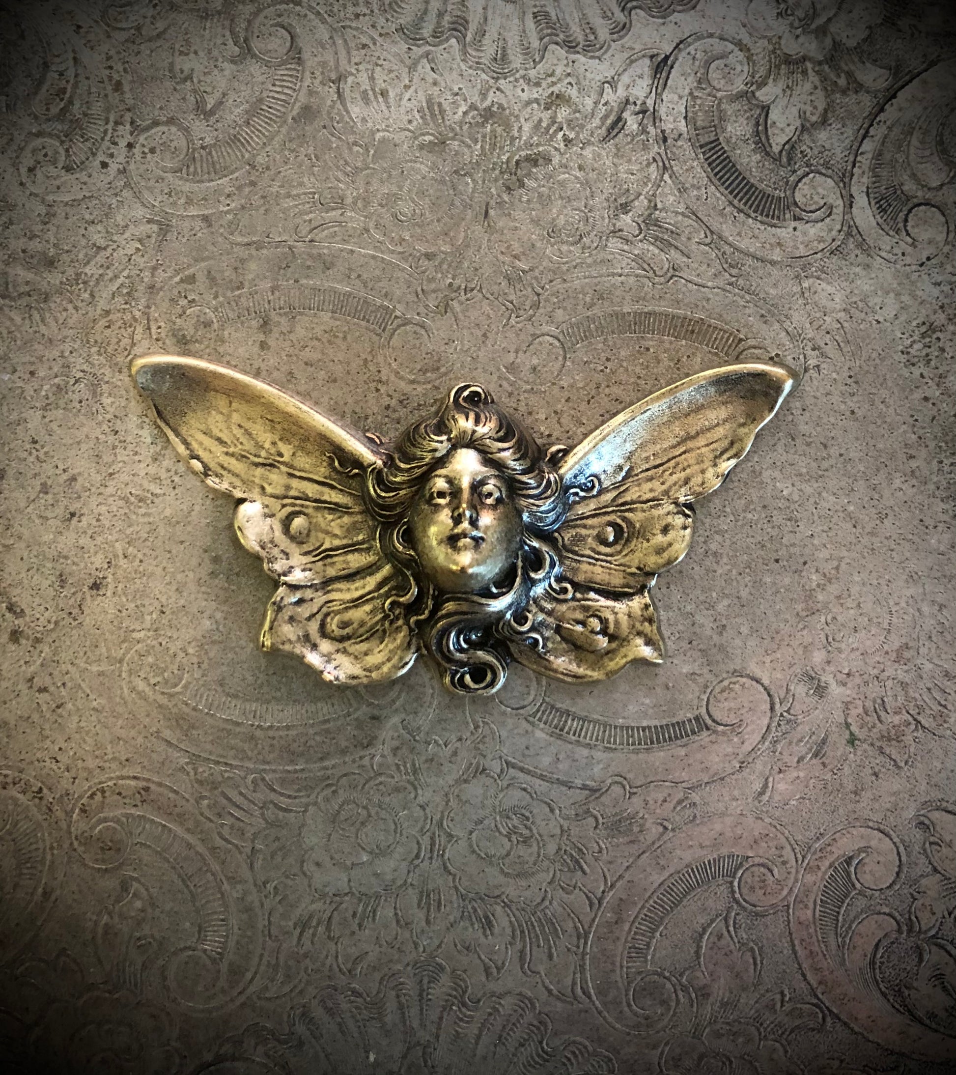The Madame Butterfly is a brass stamping approx 3 inches with 2 tie tack pins on the back.