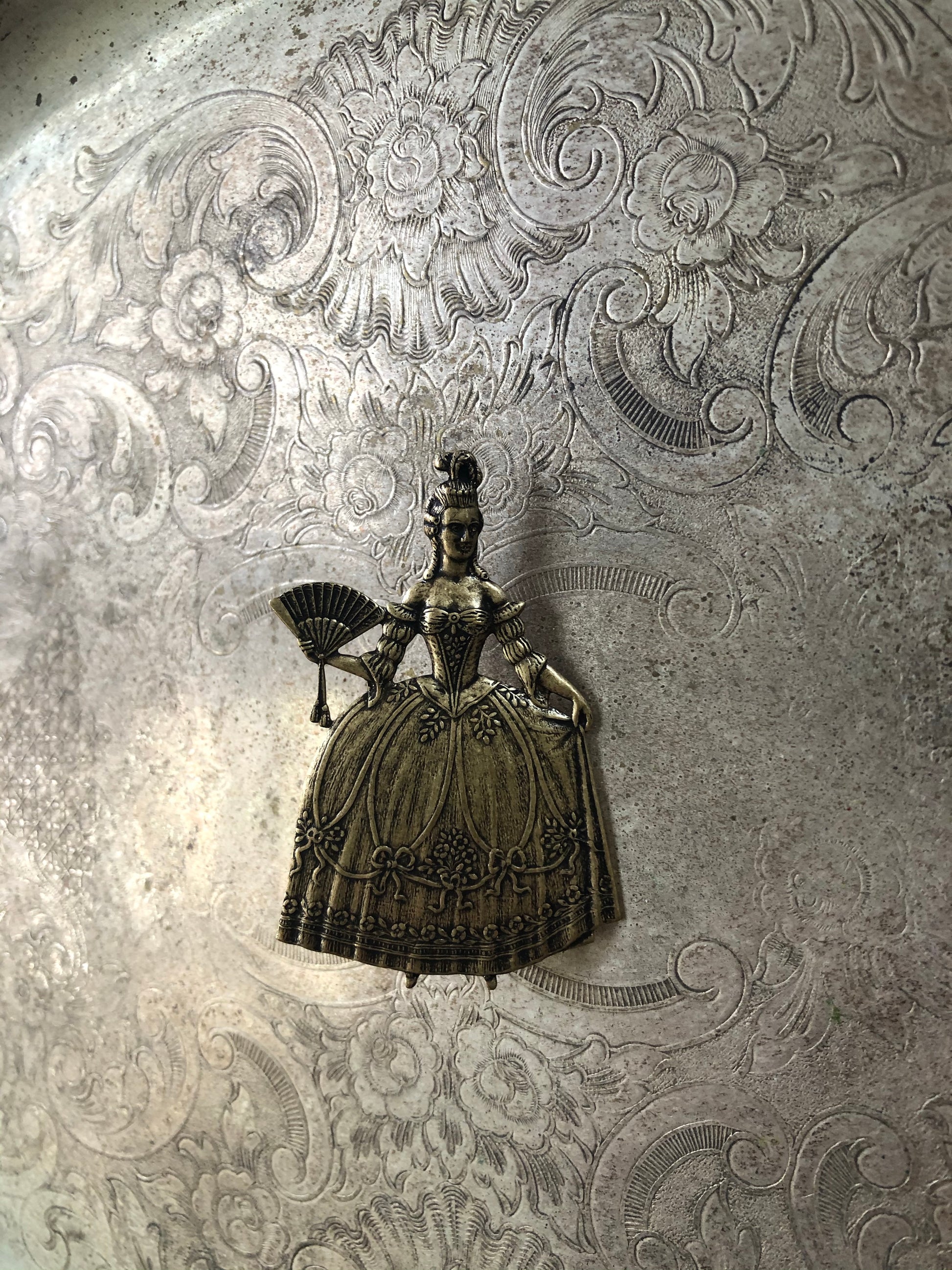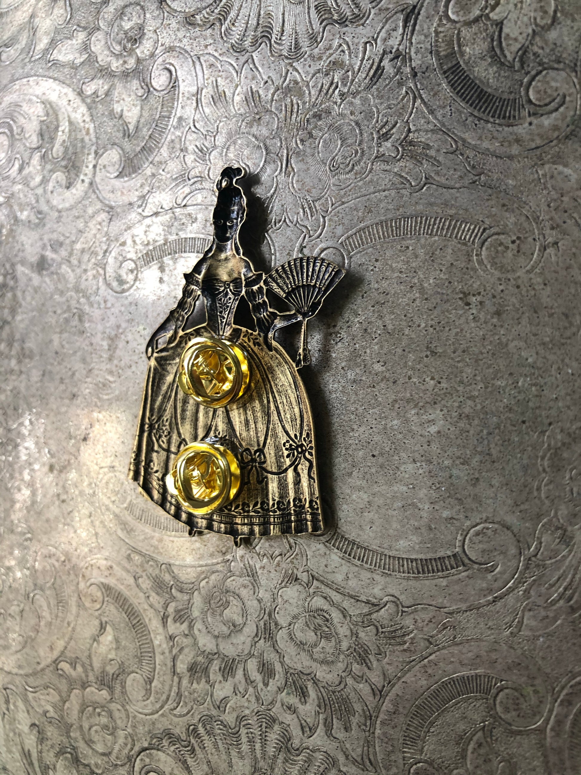 Marie Antoinette vintage inspired brass stamping with two tie tack pins on the back.
