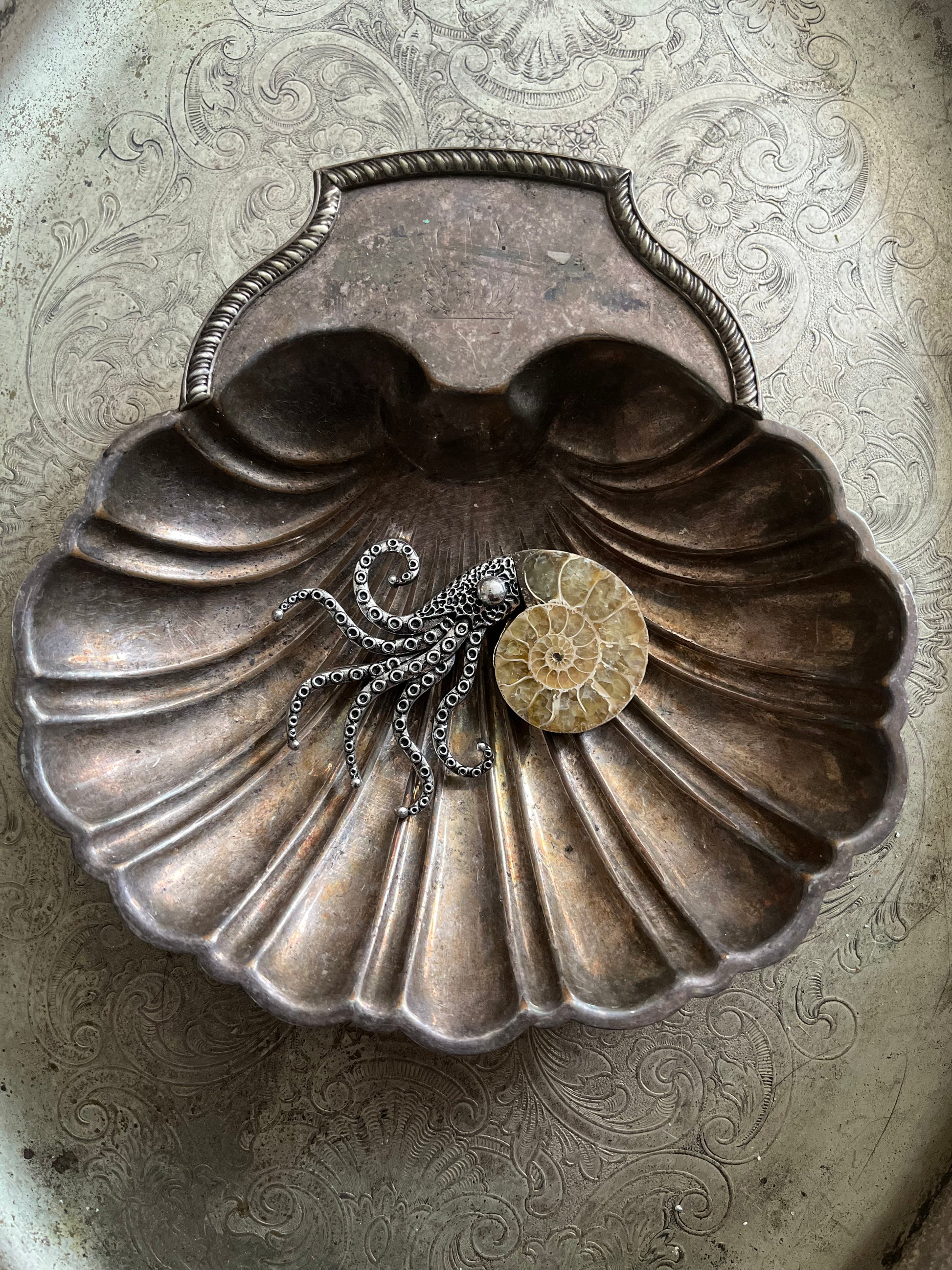 A real cut and buffed Nautical Shell piece in a silver coated tentacle brooch setting.