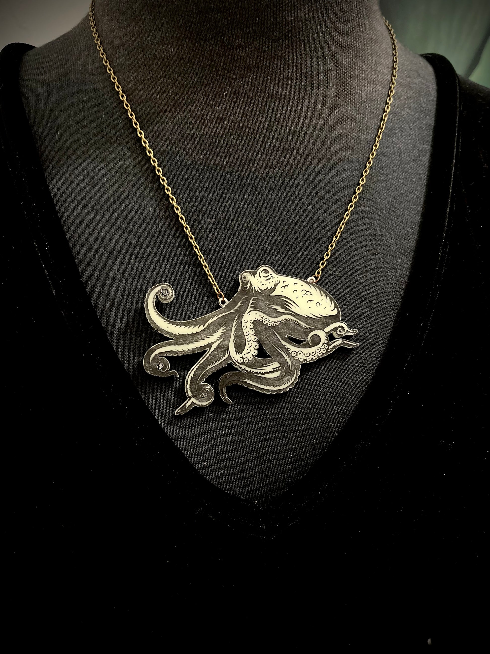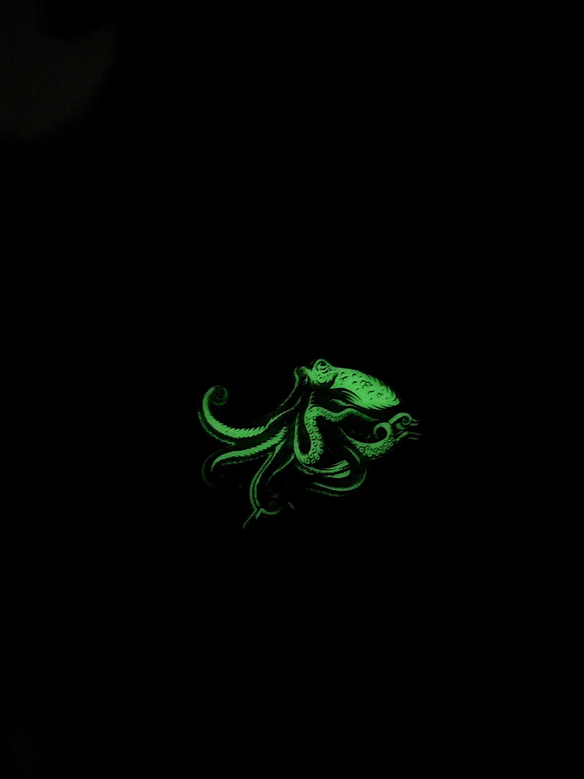 Glow in the dark acrylic Octopus with an etched design and hand painted black details.