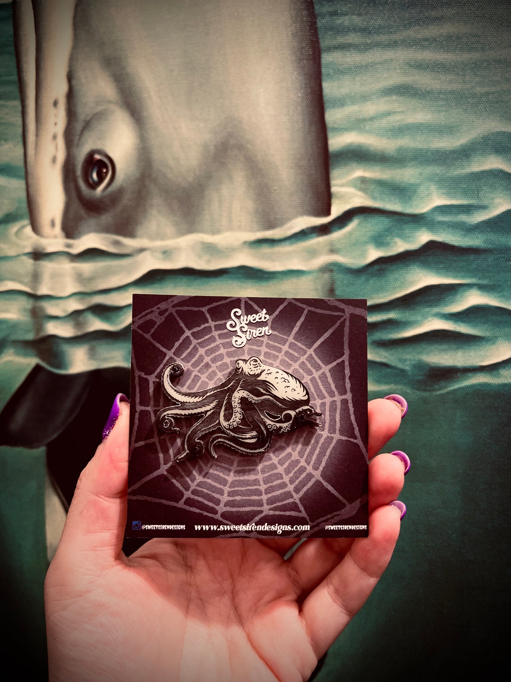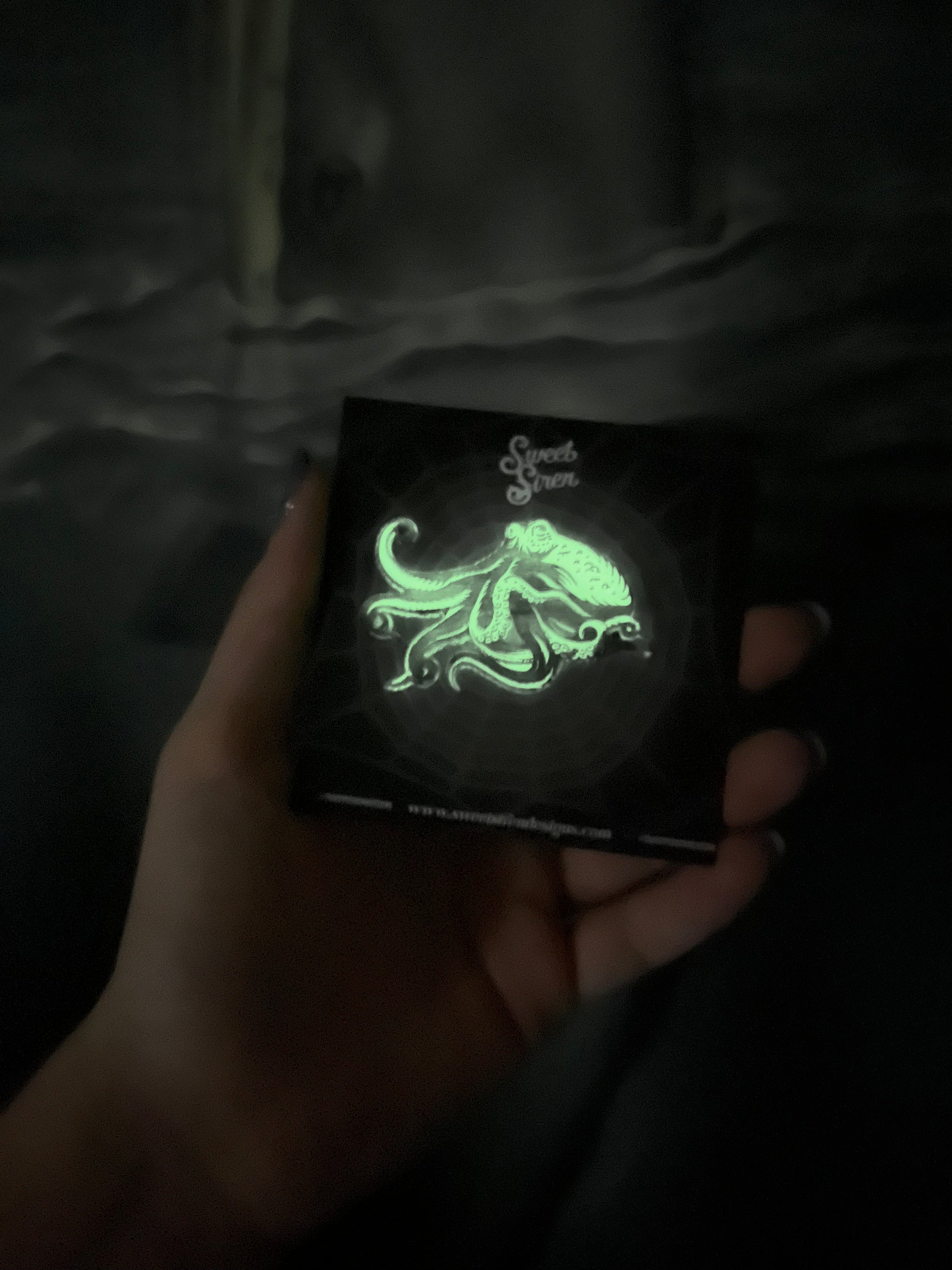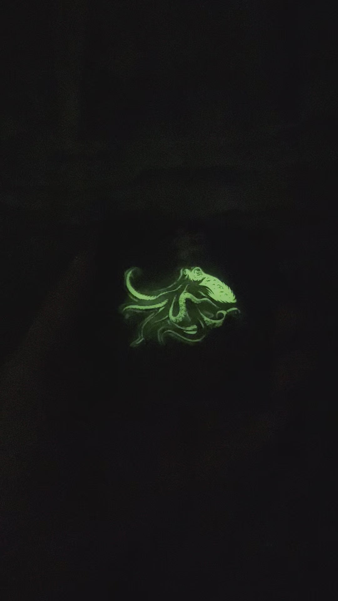 Glow in the dark acrylic with an etched design and hand painted black details.