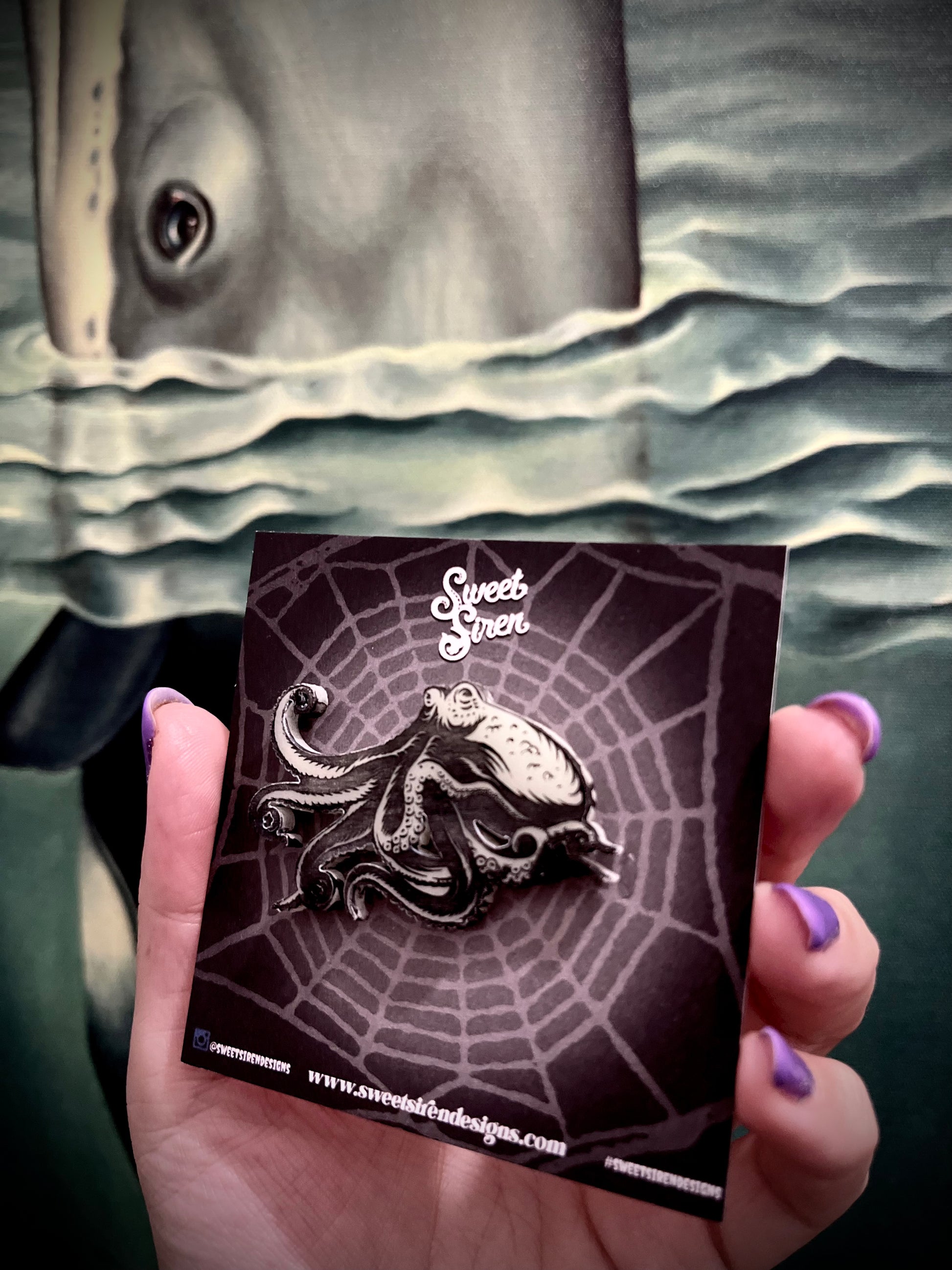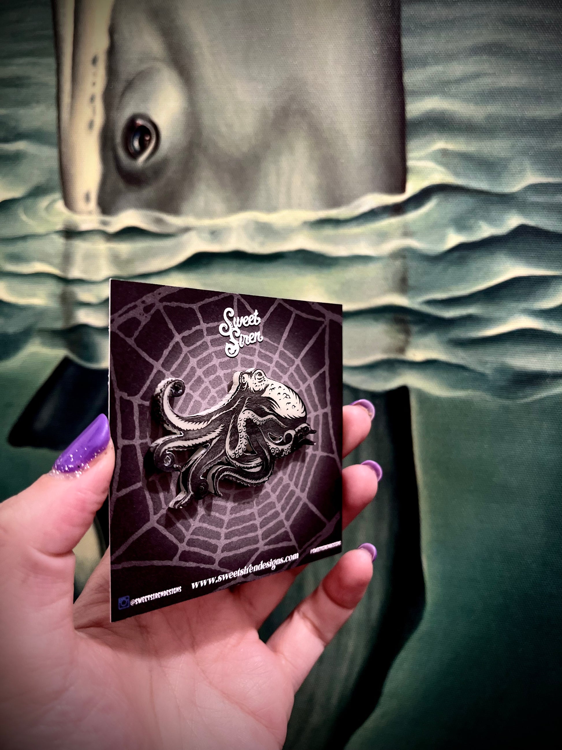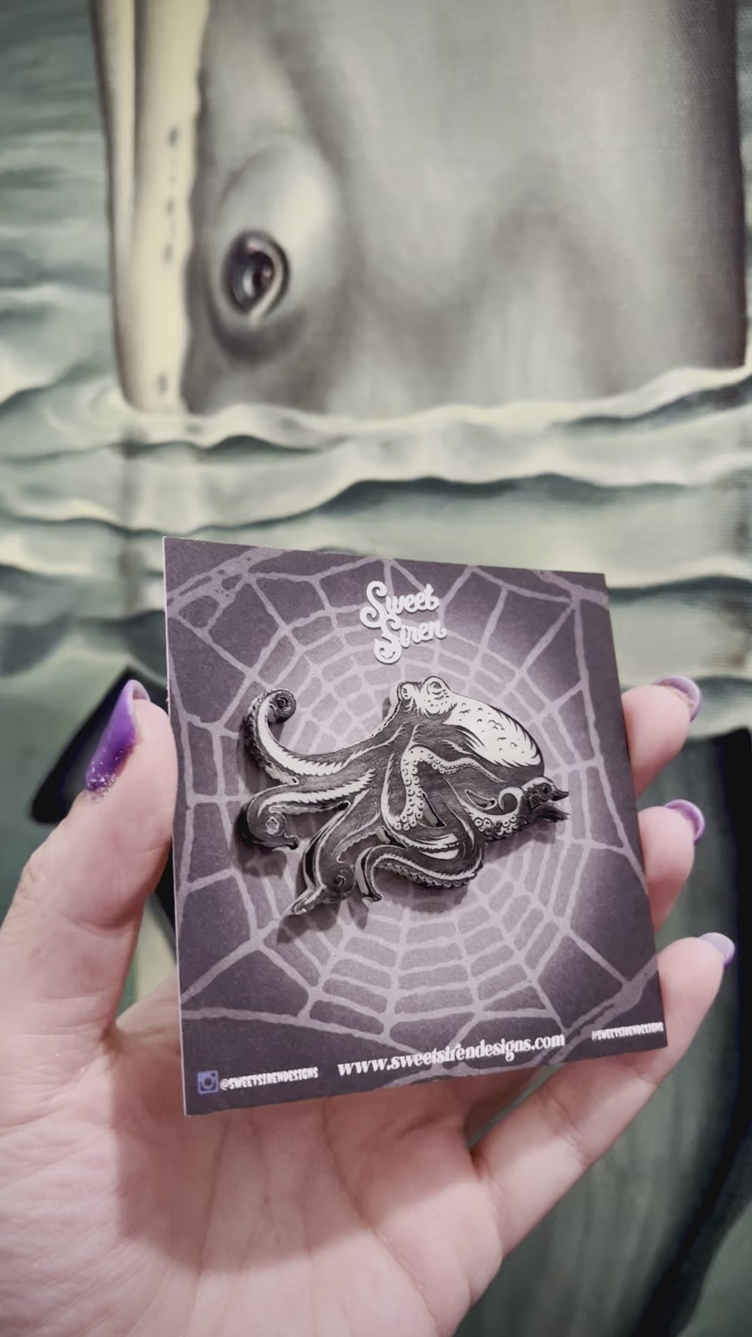 Glow in the dark acrylic with an etched design and hand painted black details.