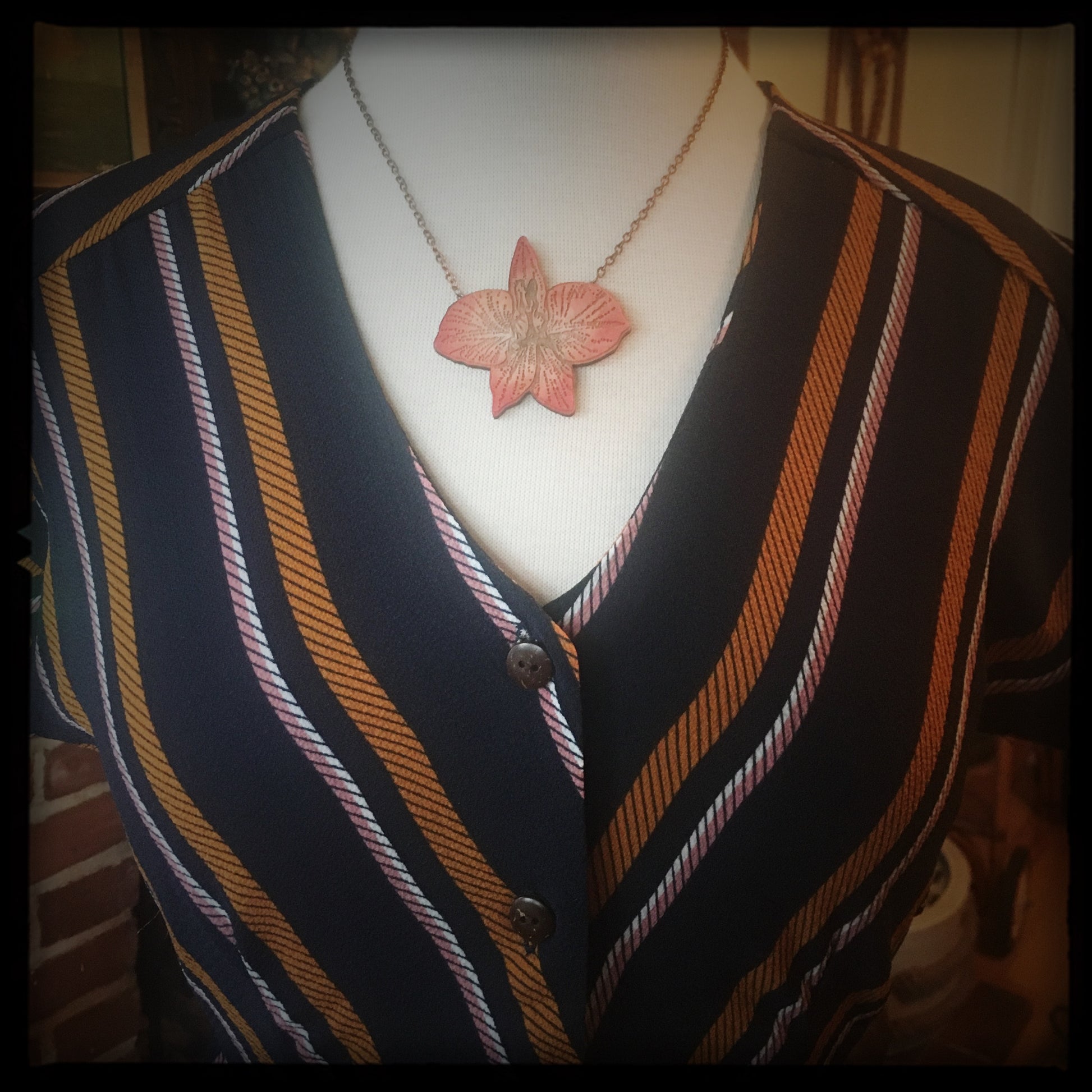 Chain is approx 18inchs, antiqued brass or copper with a lock and key toggle clasp. The Orchid is approx. 2 inches.