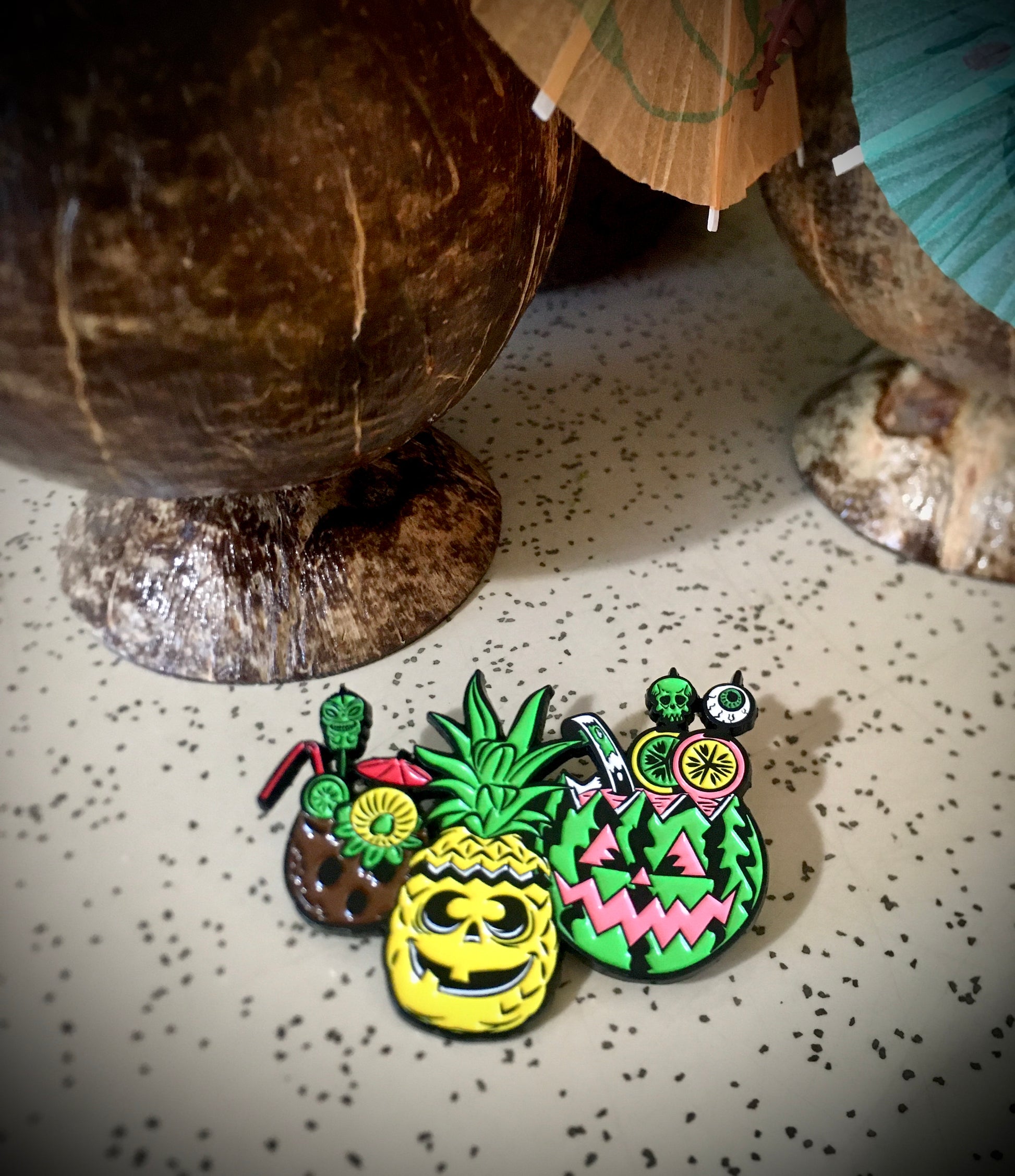 The Pineapple Jack-O-Lantern accompanied by a refreshing Coconut Ghost Tiki Drink topped with garnishes and special Tiki Monster Creature Swizzle stick, and lastly the Spooky Watermelon Punch Bowl!