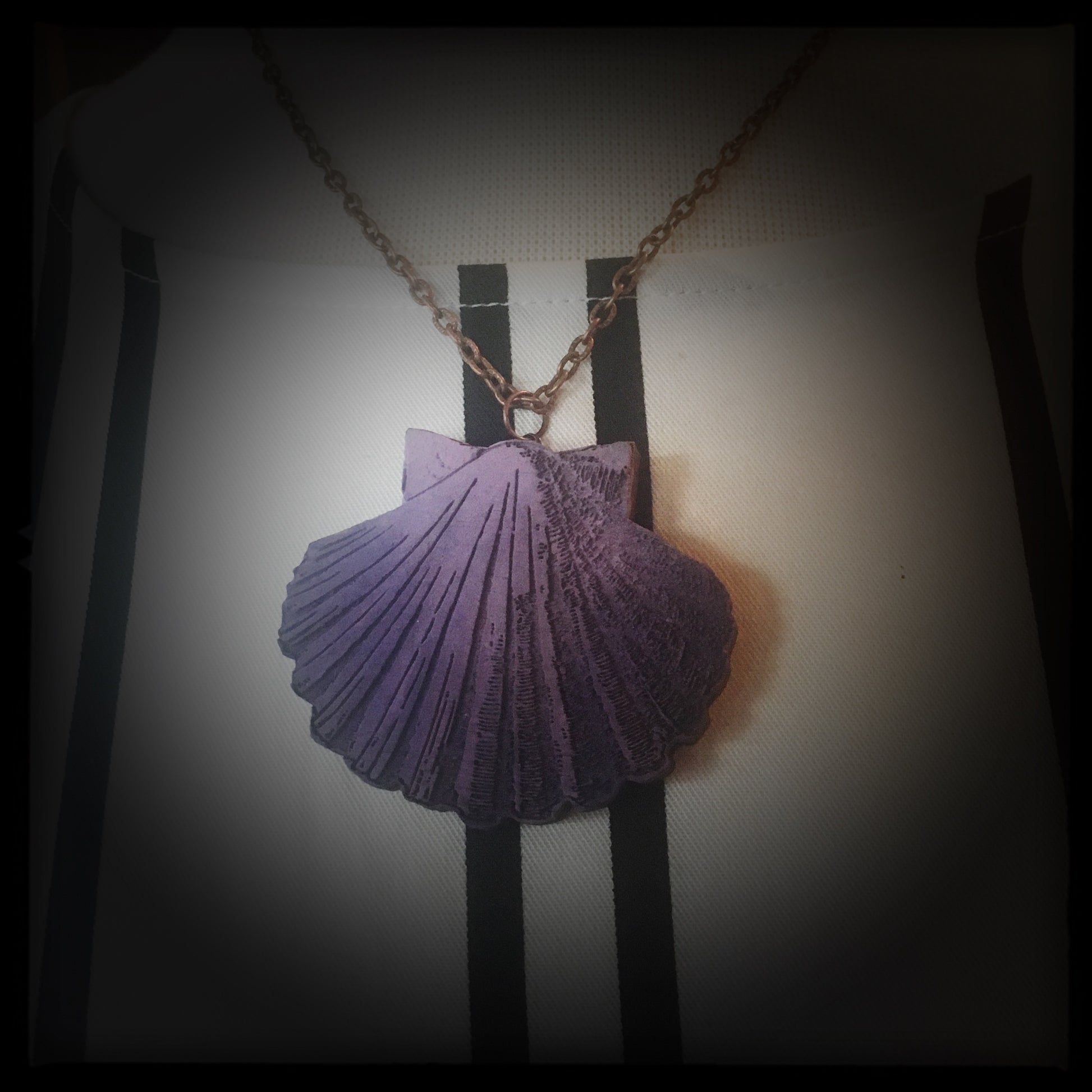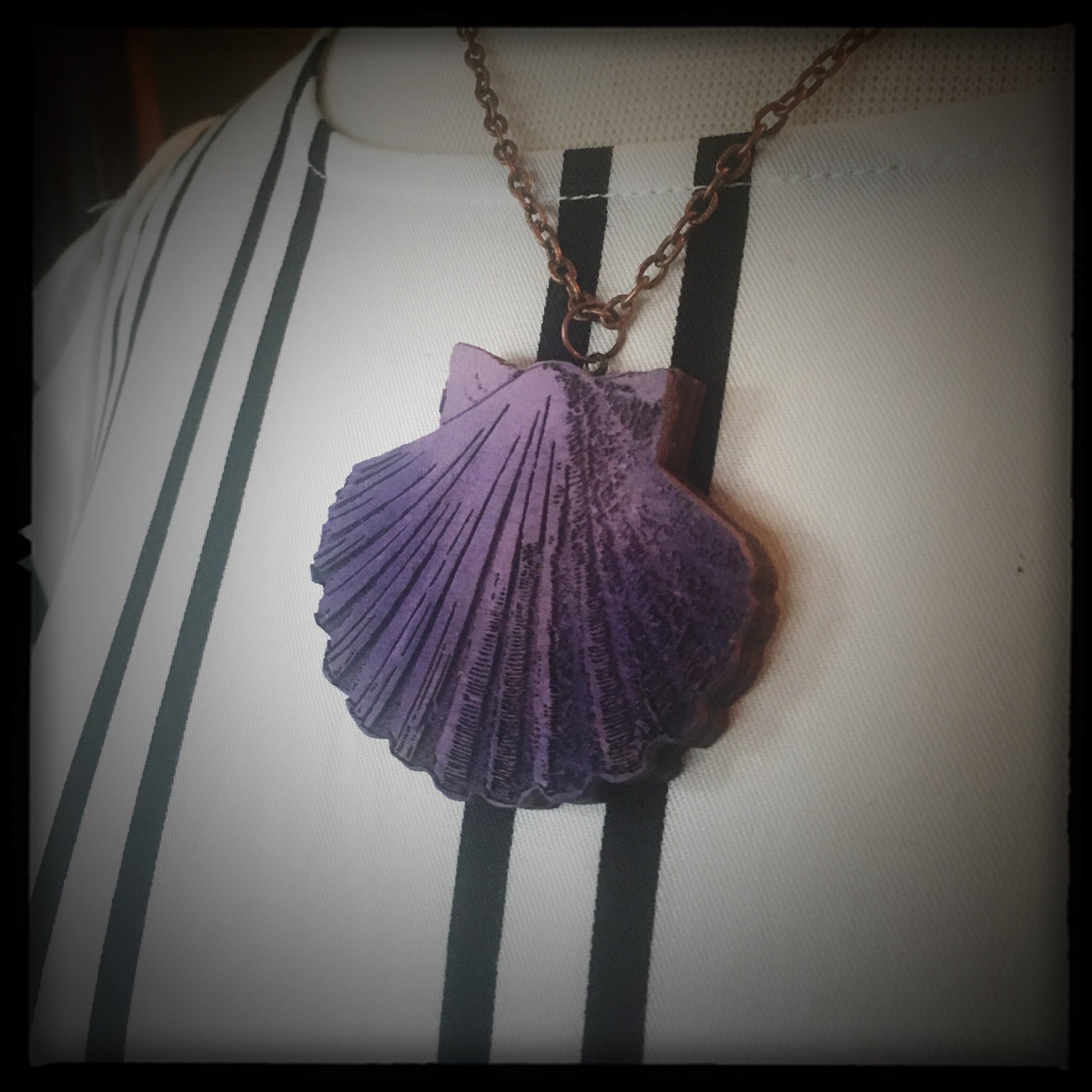 A purple hand painted wooden laser etched Sea Shell necklace.