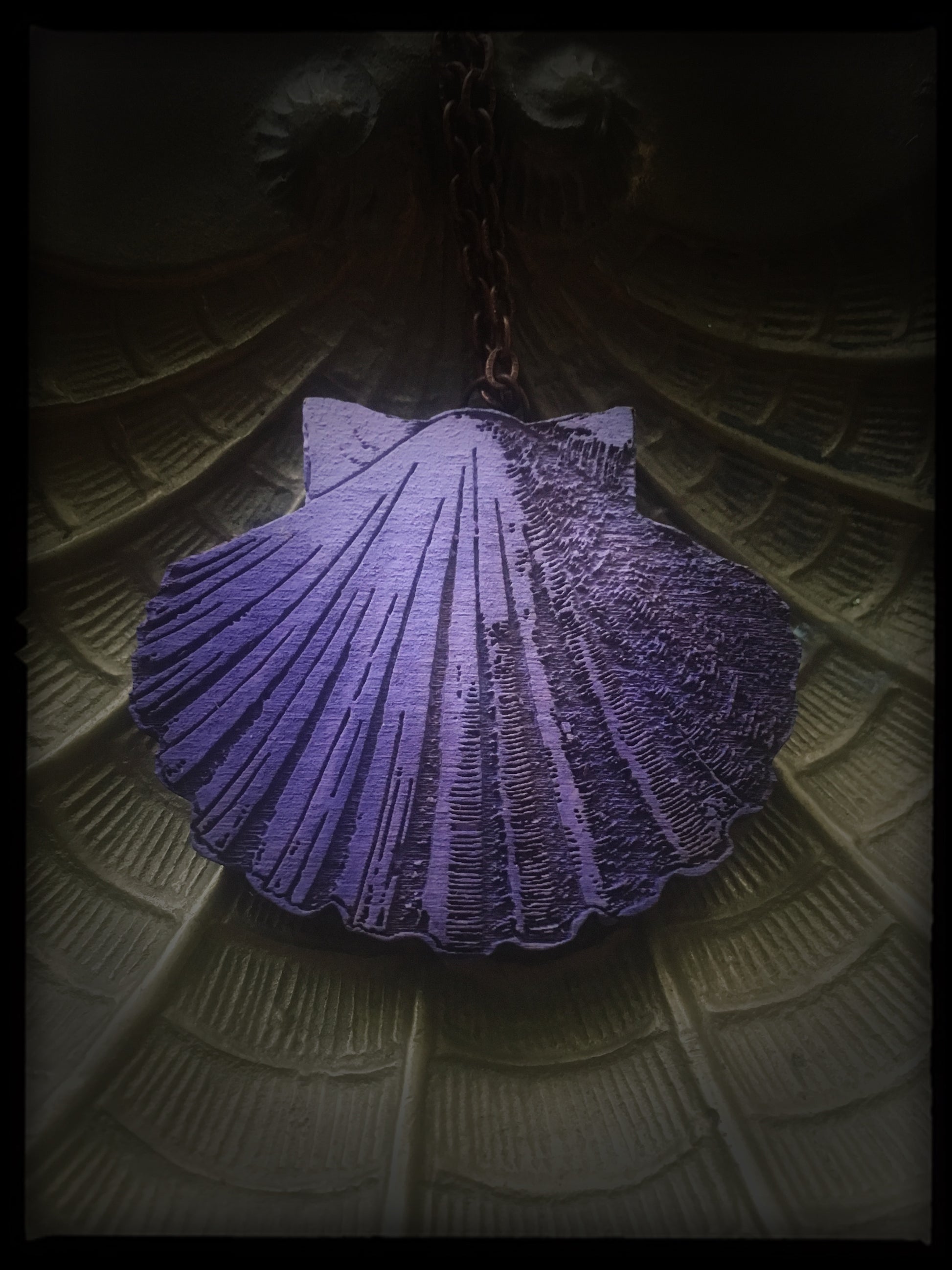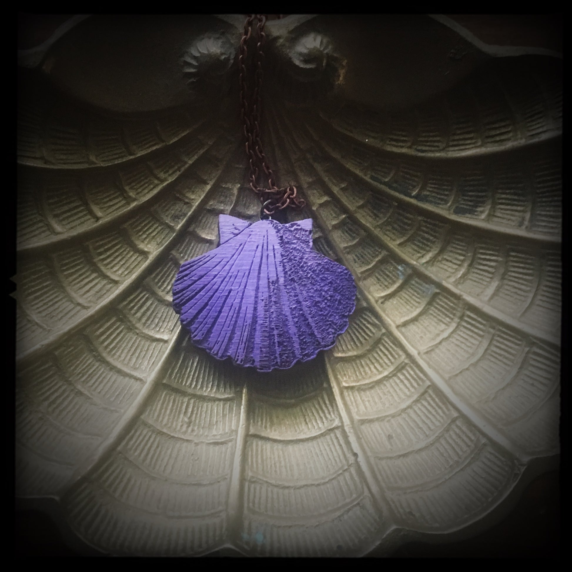 A purple hand painted wooden laser etched Sea Shell necklace.