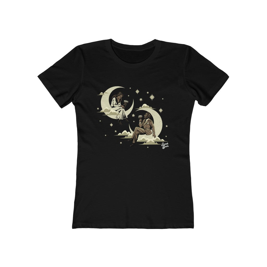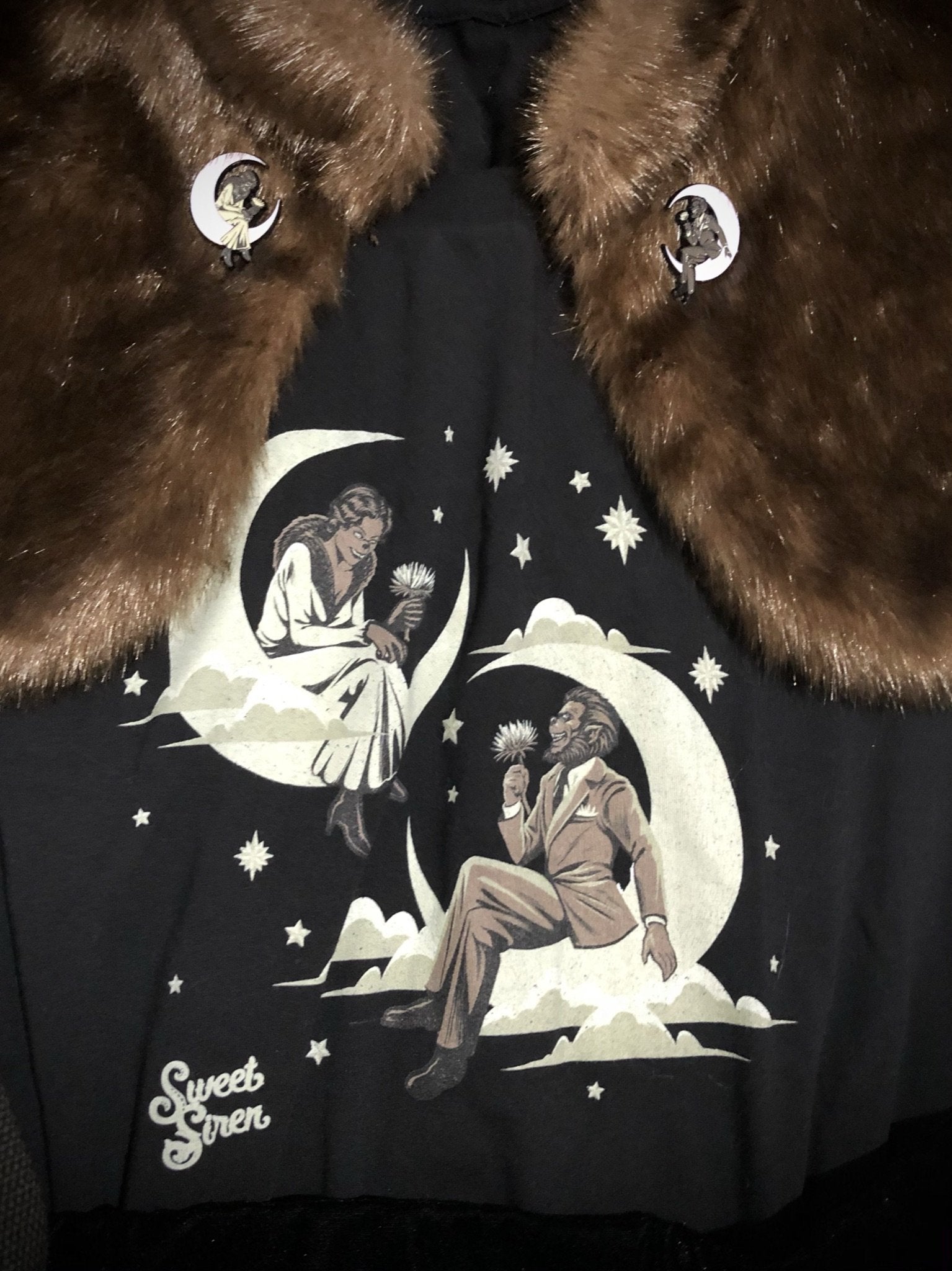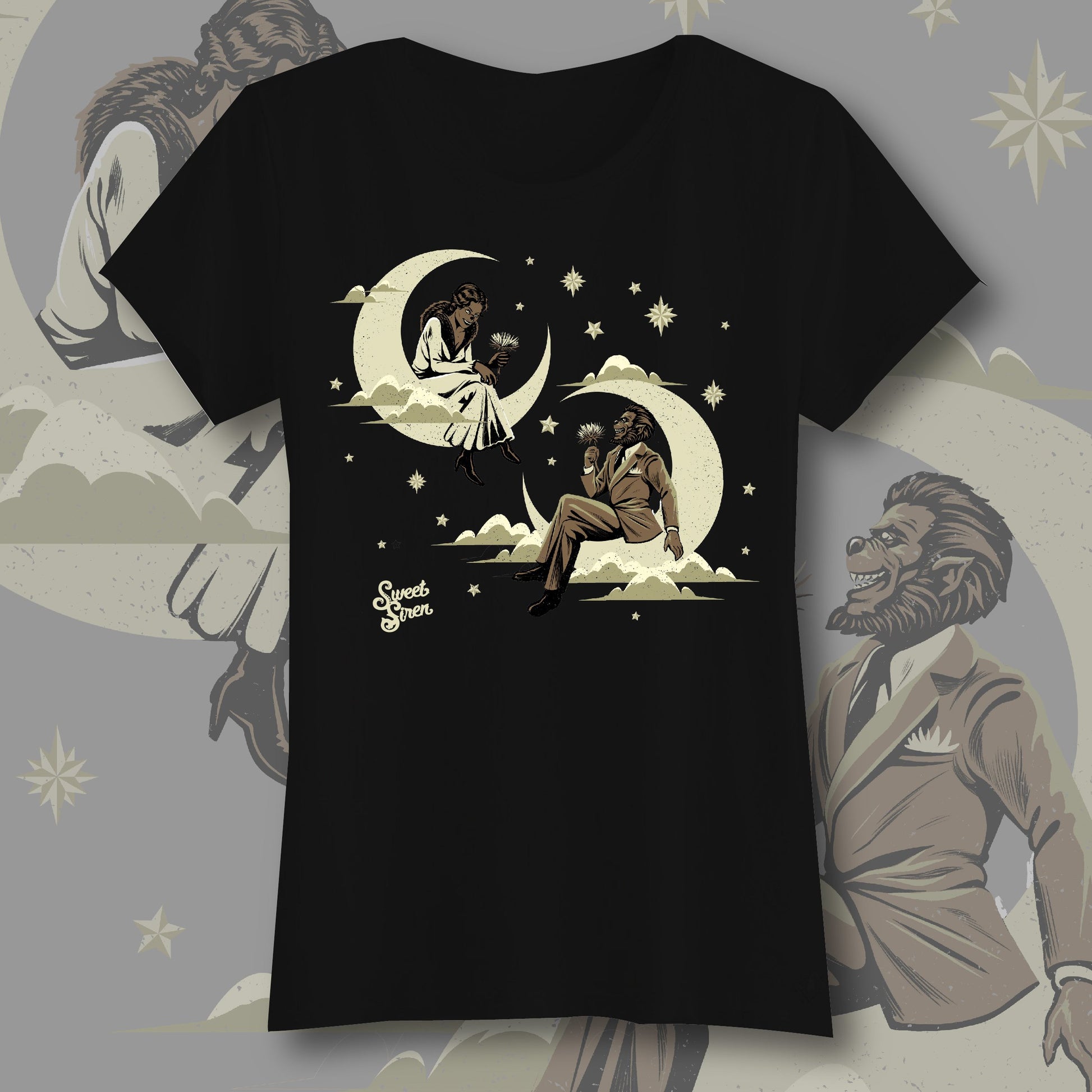 A lady werewolf and a werewolf man are gazing at each other on the crescent moons. Each holding a moon flower- called Queen of the Night.