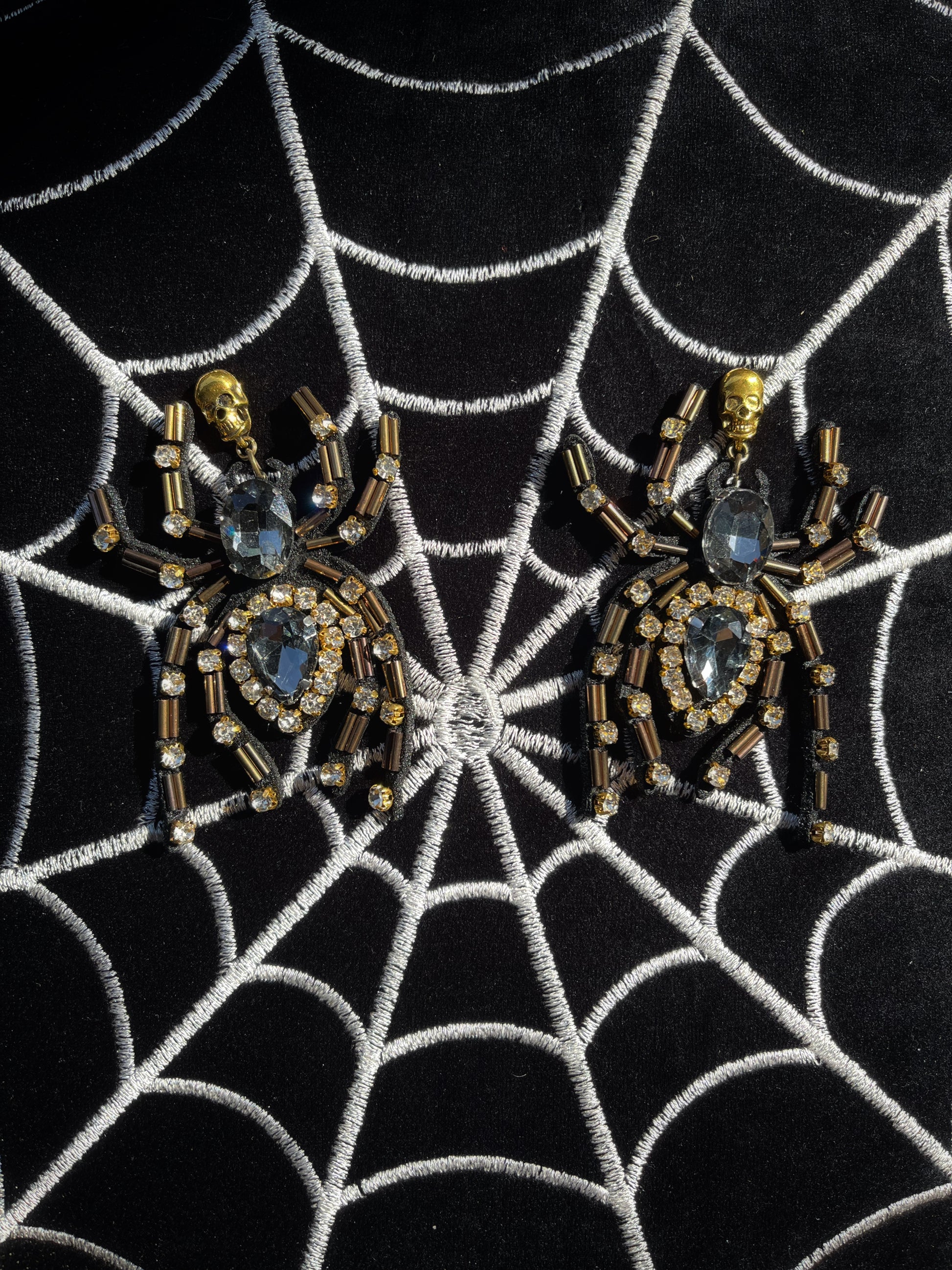 Sparkling embroidered rhinestone and beaded Spider Earrings.