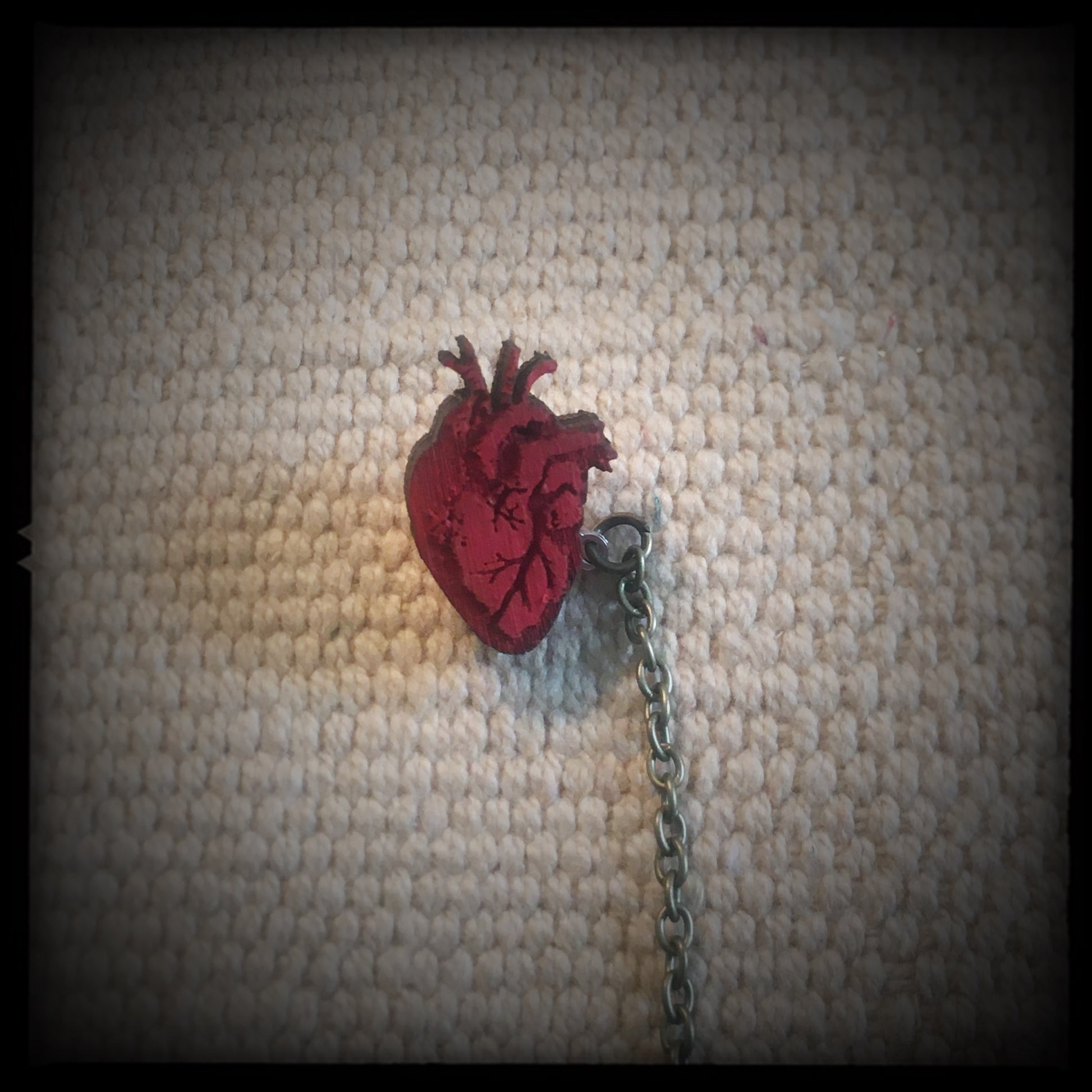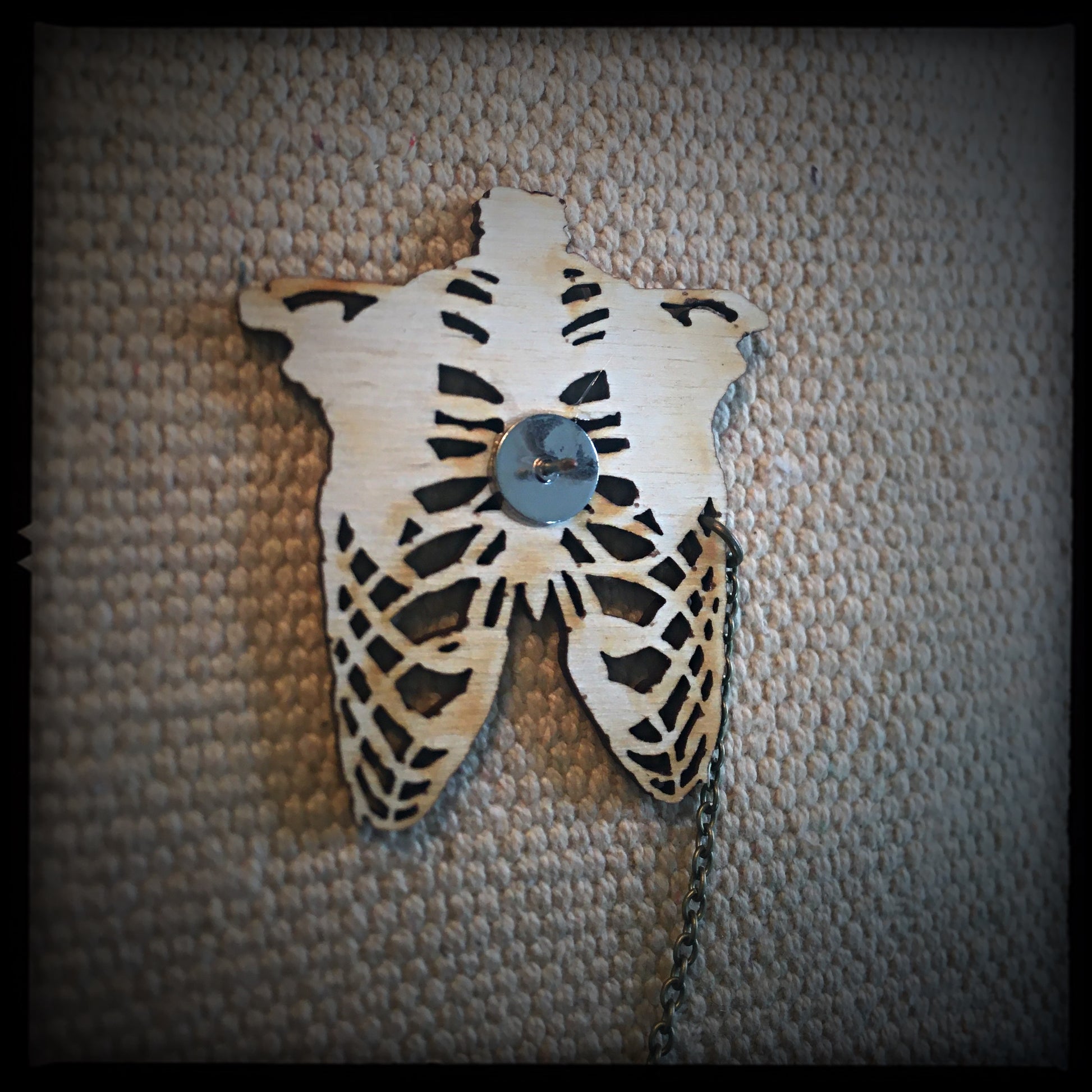 Laser etched wooden Rib Cage with a hand painted Human Heart - with a copper chain.