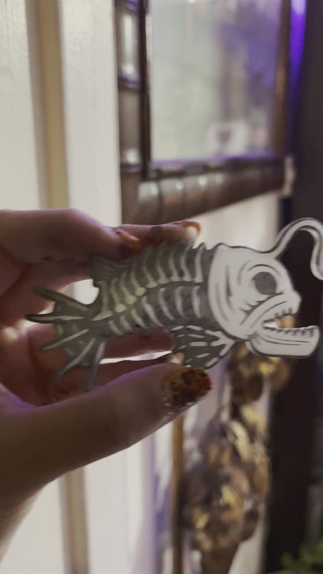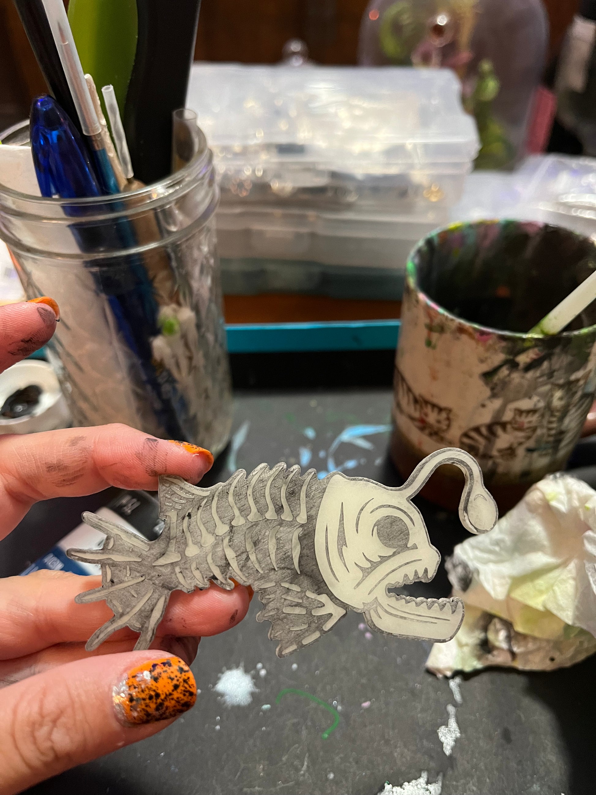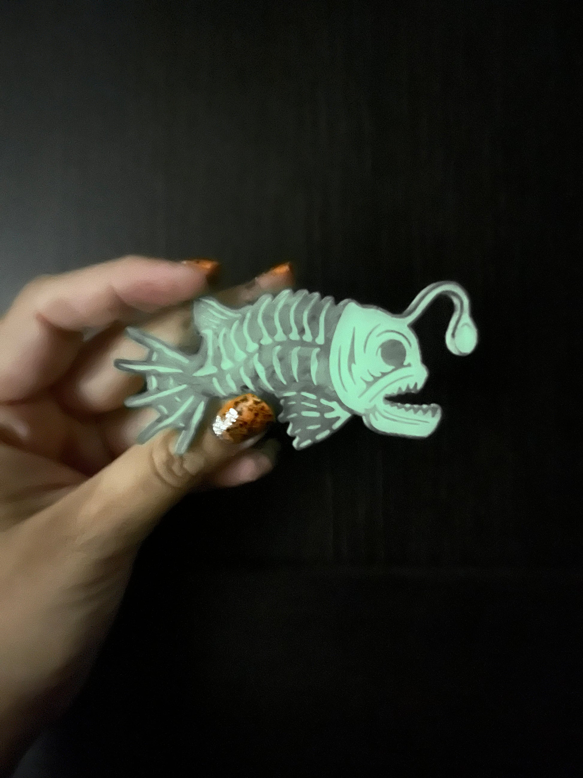 Glow in the dark acrylic Angler Fish with an etched design and hand painted black details.
