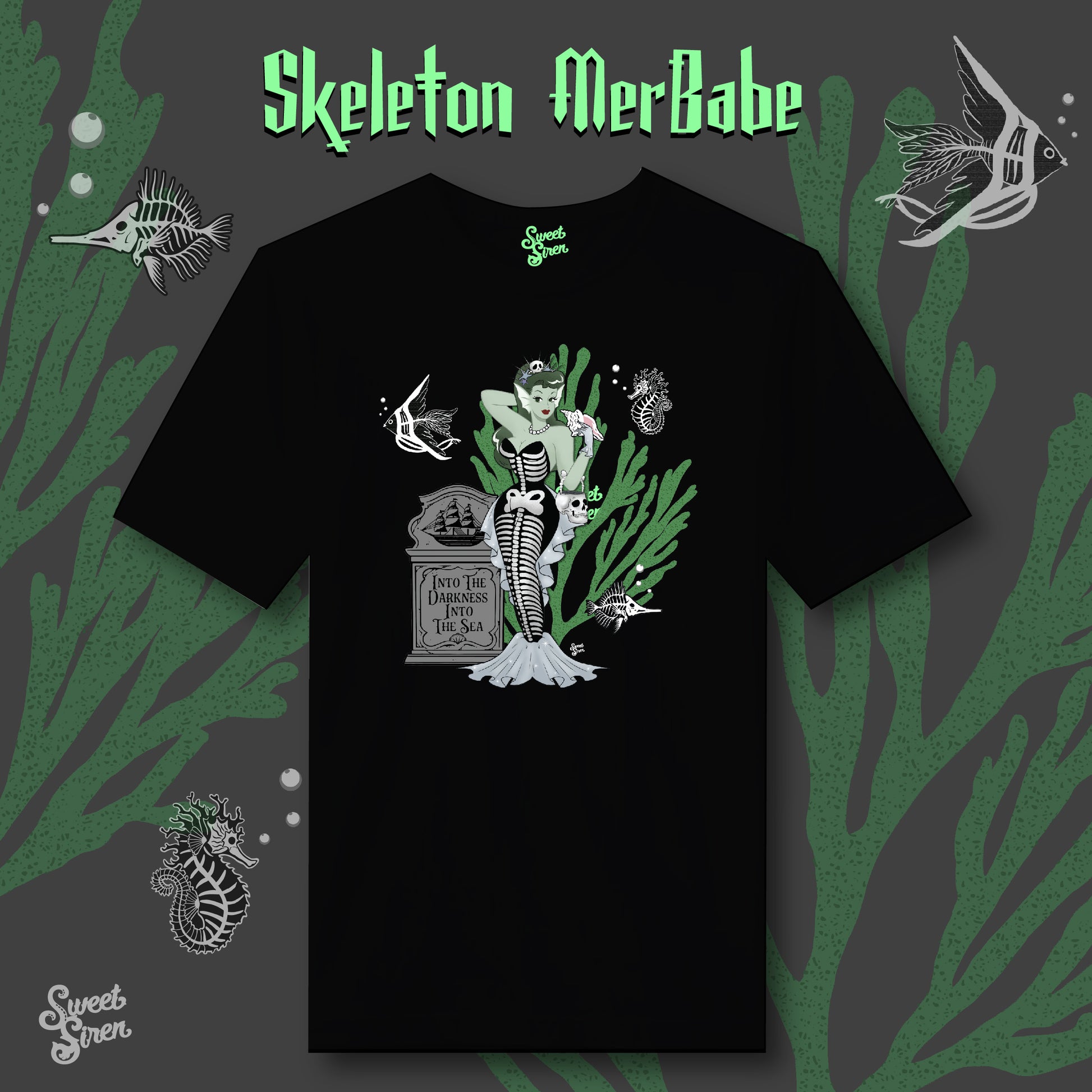 This Skeleton Merbabe is inspired by vintage costumes and skeleton mermaids with some equally undead sea creatures.