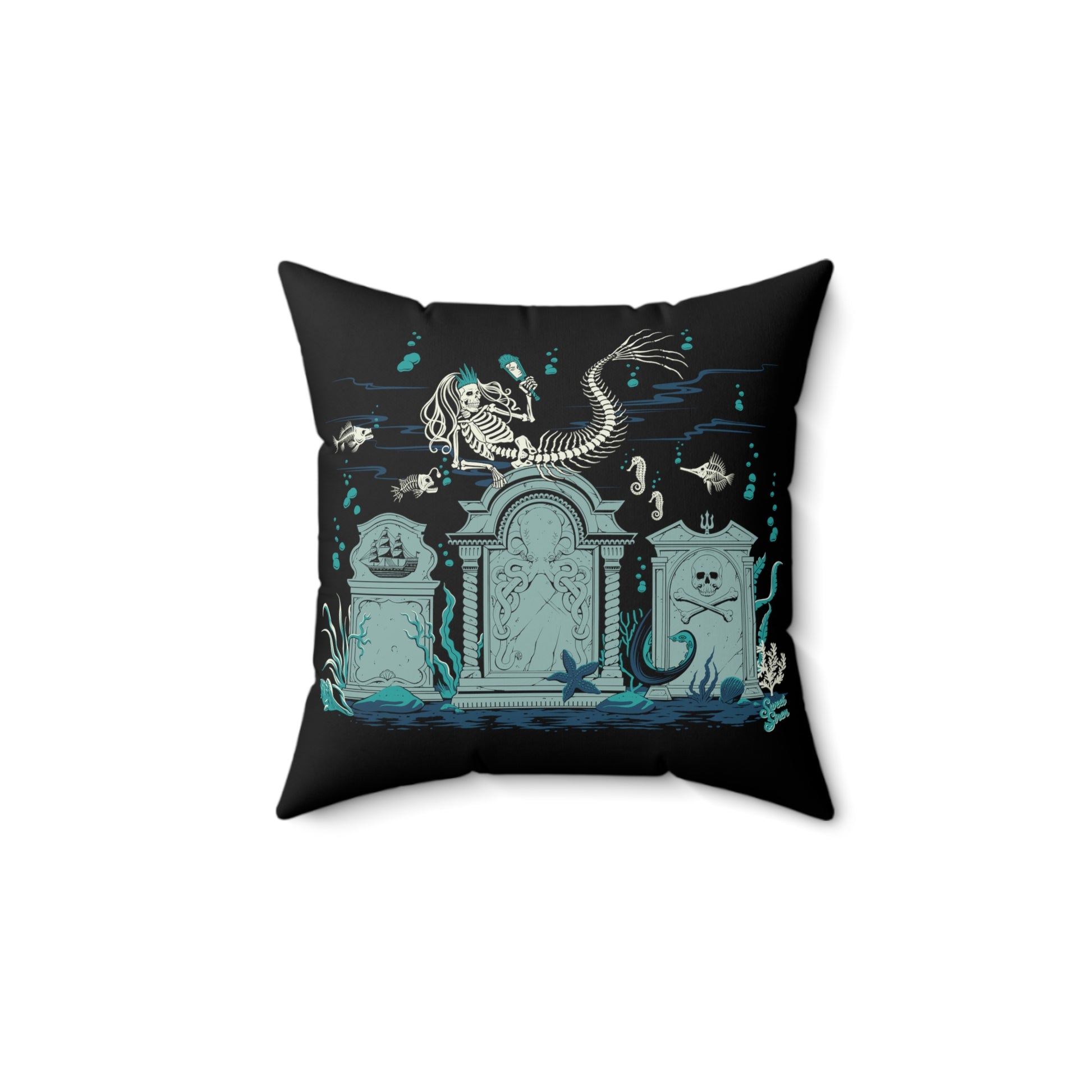 Skeleton Mermaid Graveyard - FULL Pillow - Black