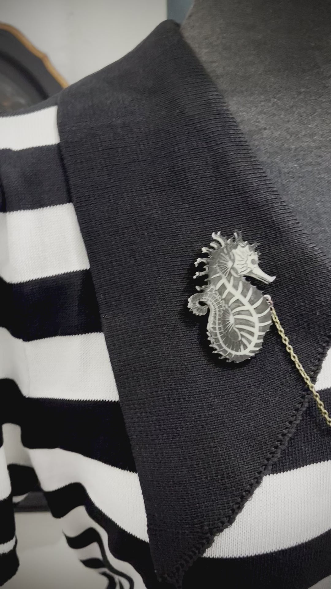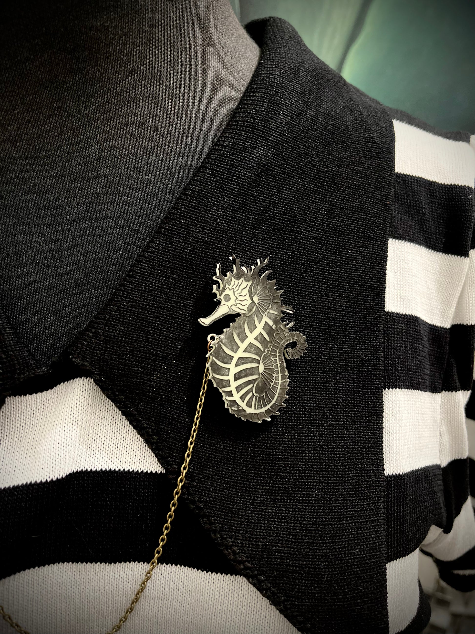 Glow in the dark acrylic Skeleton Seahorse s with an etched design and hand painted black details, connected with an antiques brass chain.