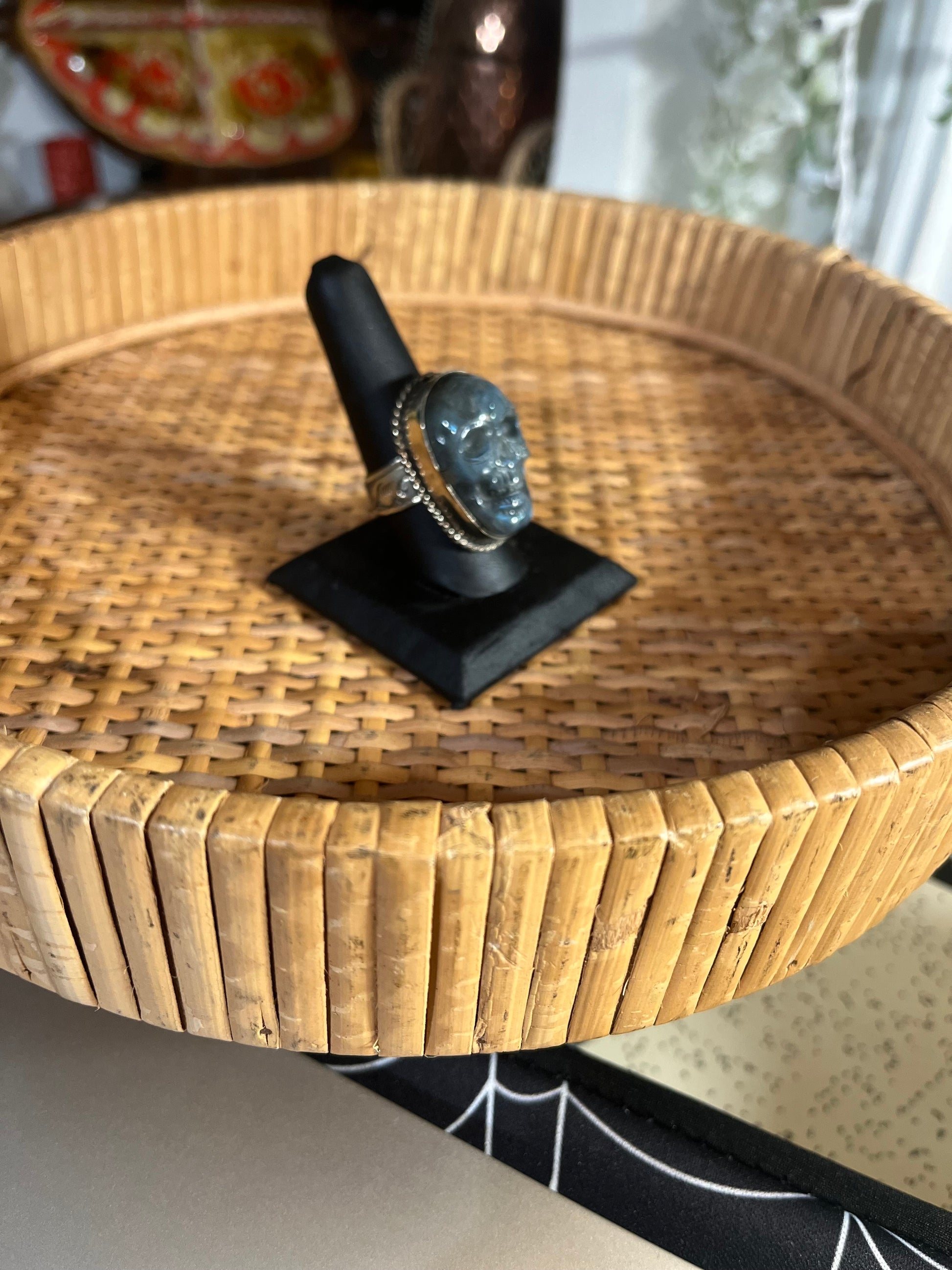 This listing is for a labradorite carved skull ring.