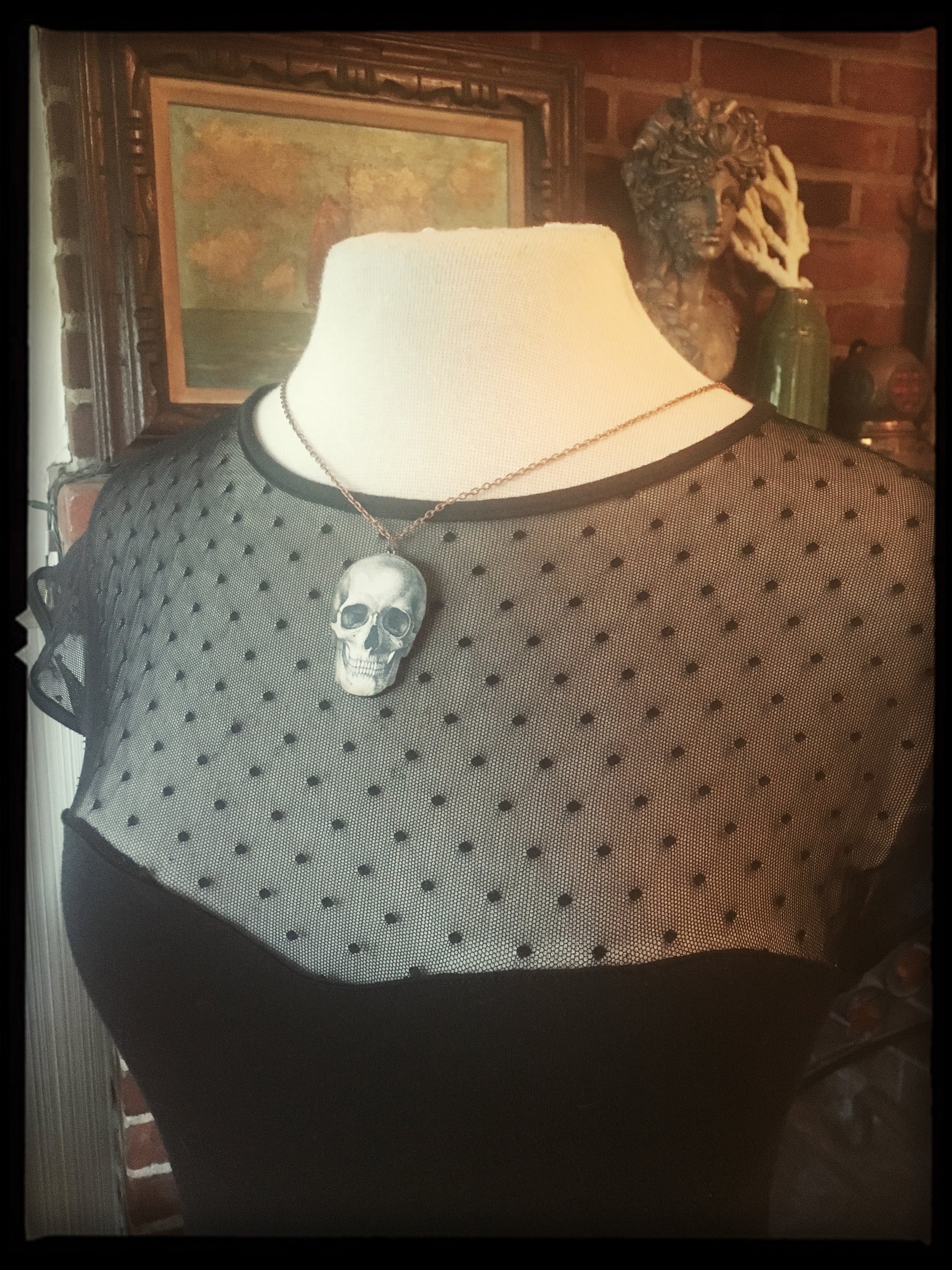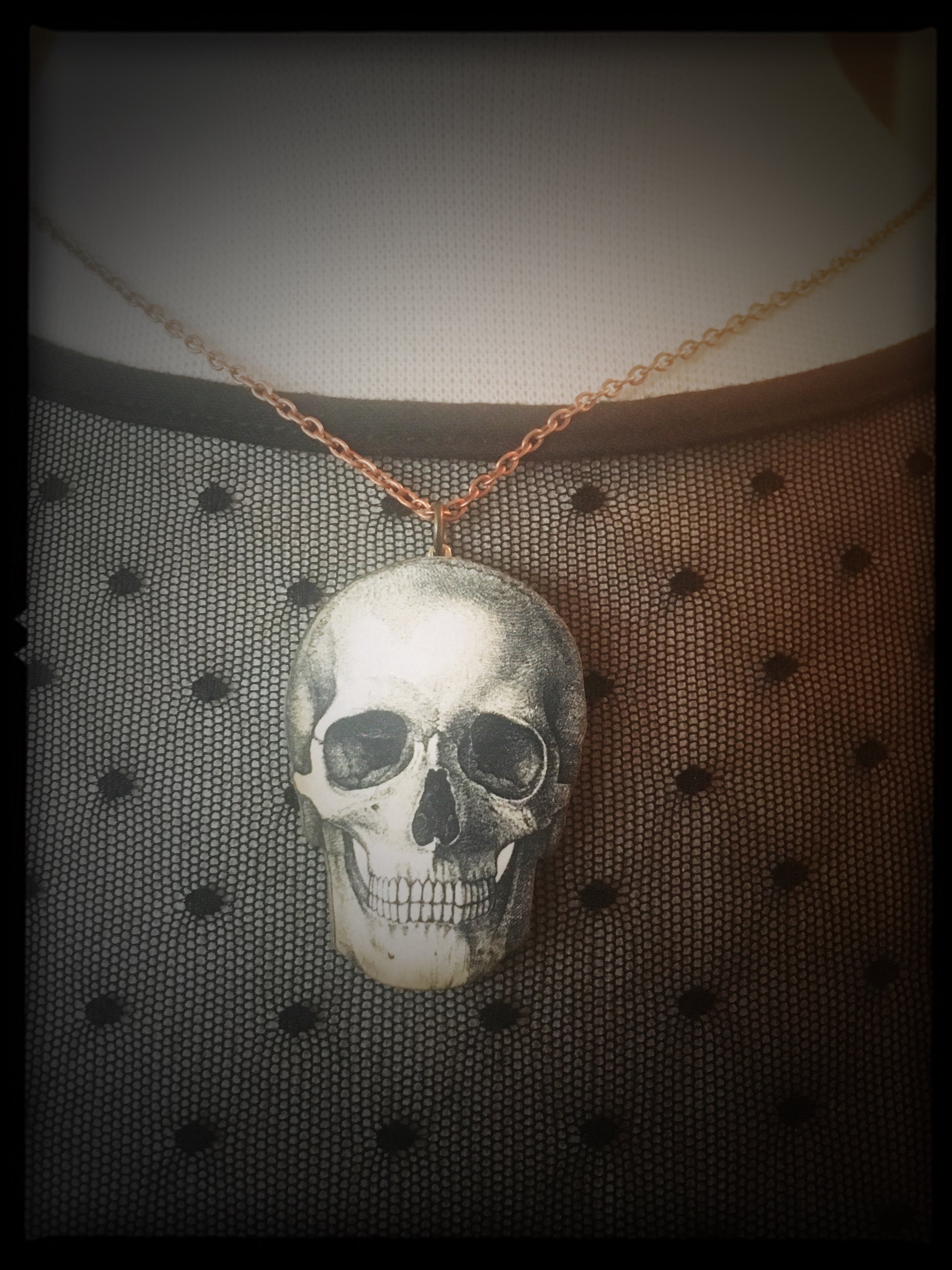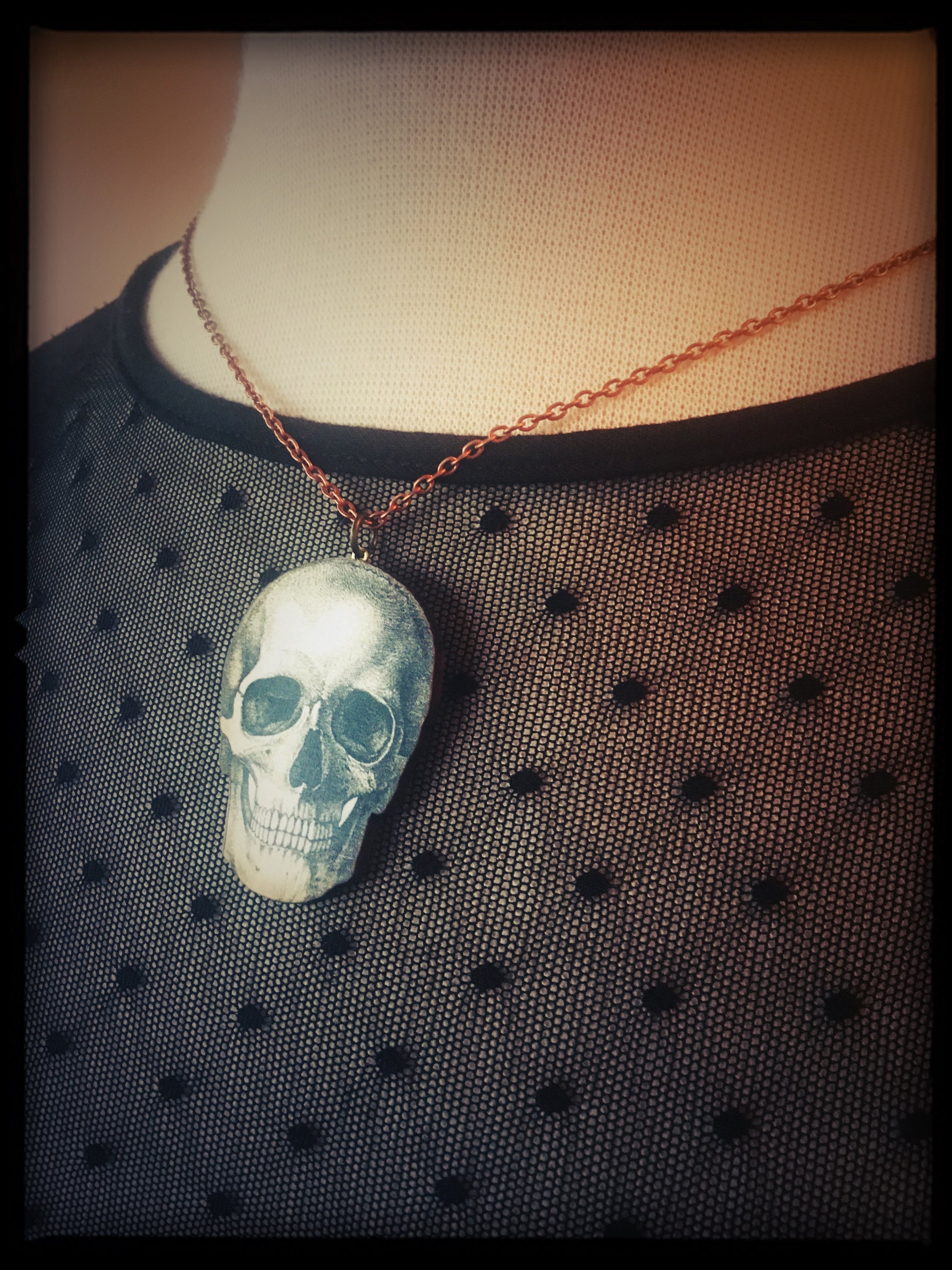 Laser cut wooden Skull necklace made from 1/8ich Birch wood, and it is 3 1/2 inches in length. This is a printer paper on wood design.