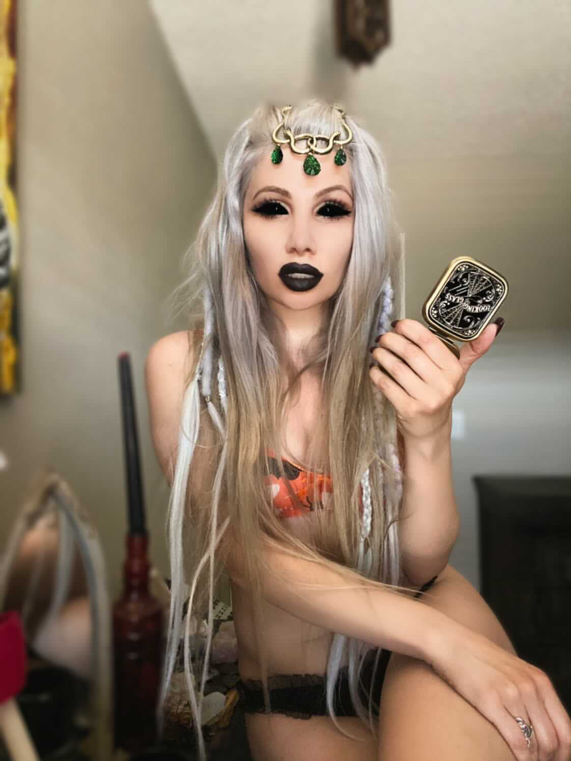 Snake Charmer vibes with this necklace~ Brass snakes with 3 green plastic cabochons.