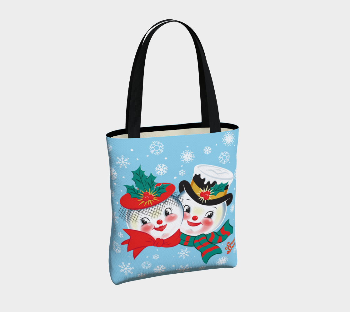 An adorable bundled up dapper snow “couple” with snowflakes falling all around them.