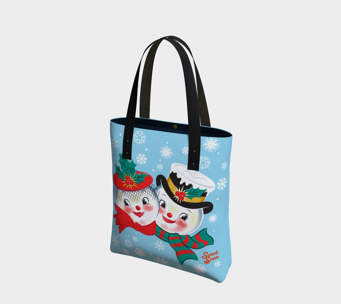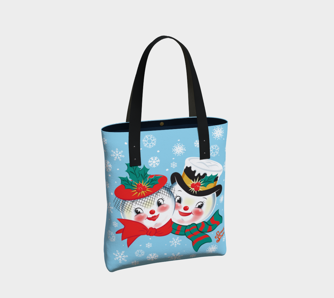 An adorable bundled up dapper snow “couple” with snowflakes falling all around them.