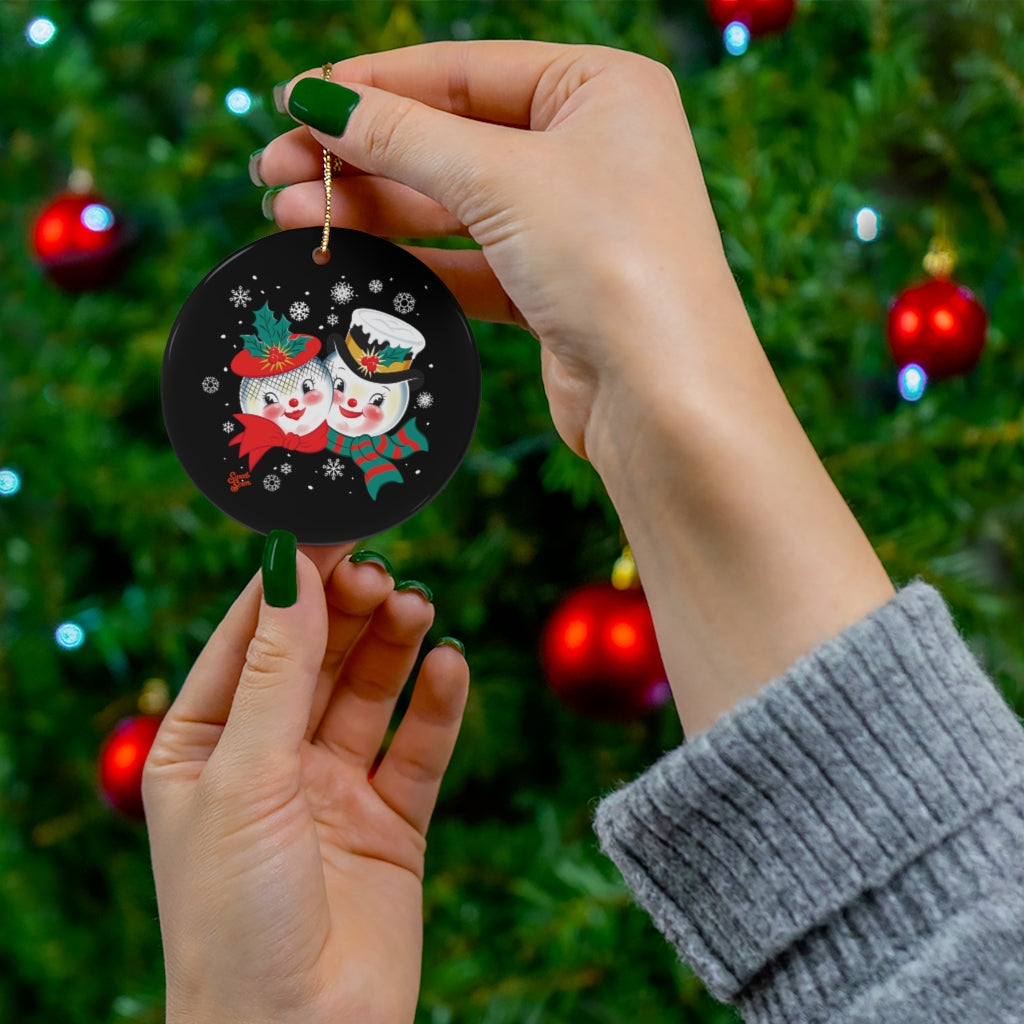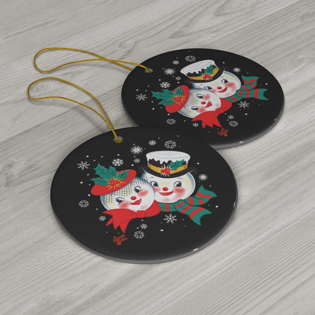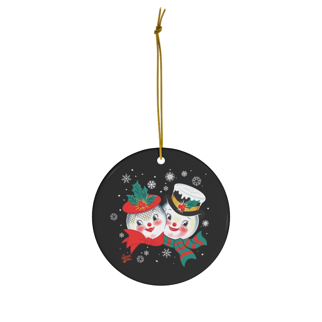 An adorable bundled up dapper snow “couple” with snowflakes falling all around them.