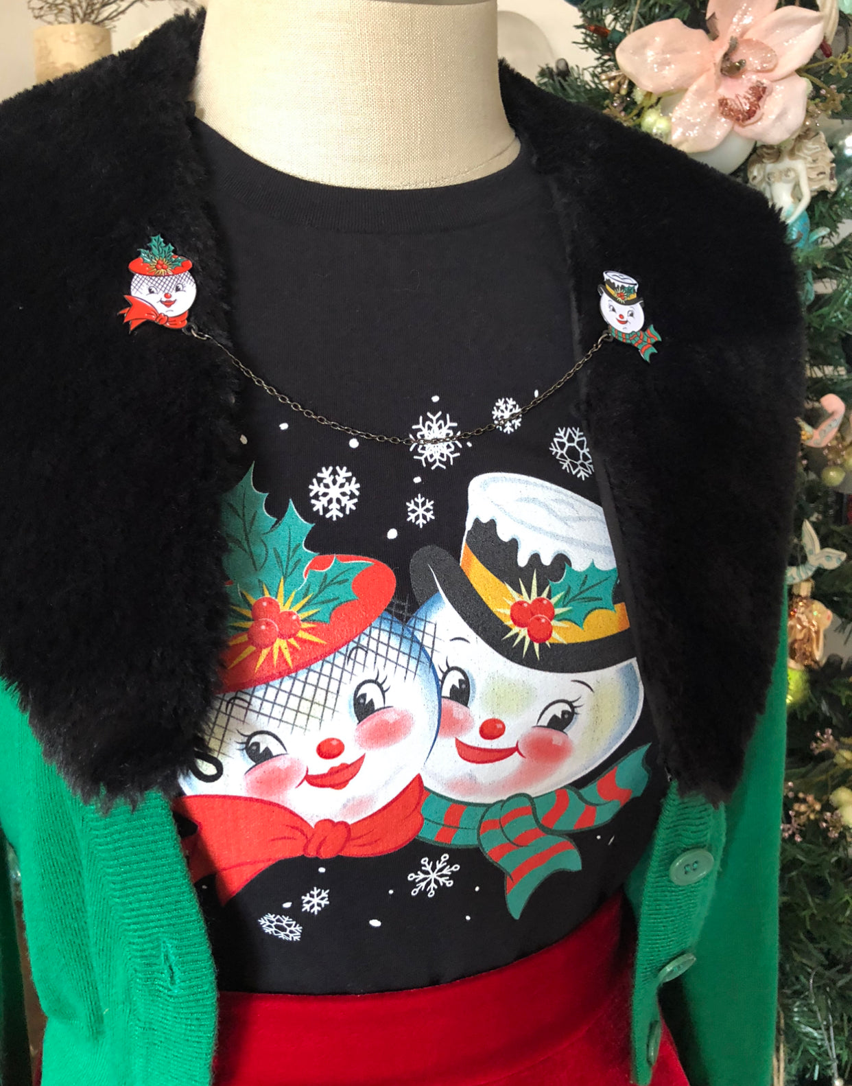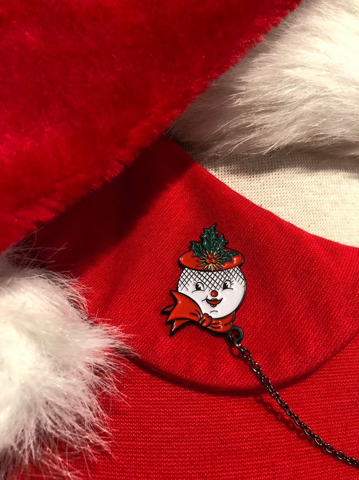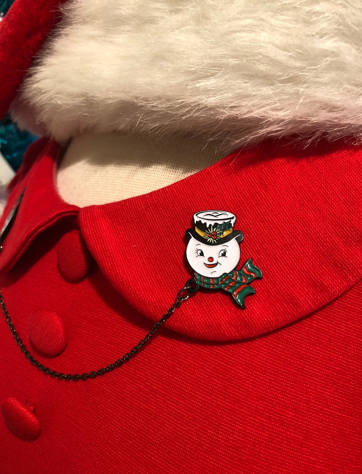 An adorable bundled up dapper snow “couple” with retro inspired accessories on - each it's own single enamel pin with a chain connecting them.
