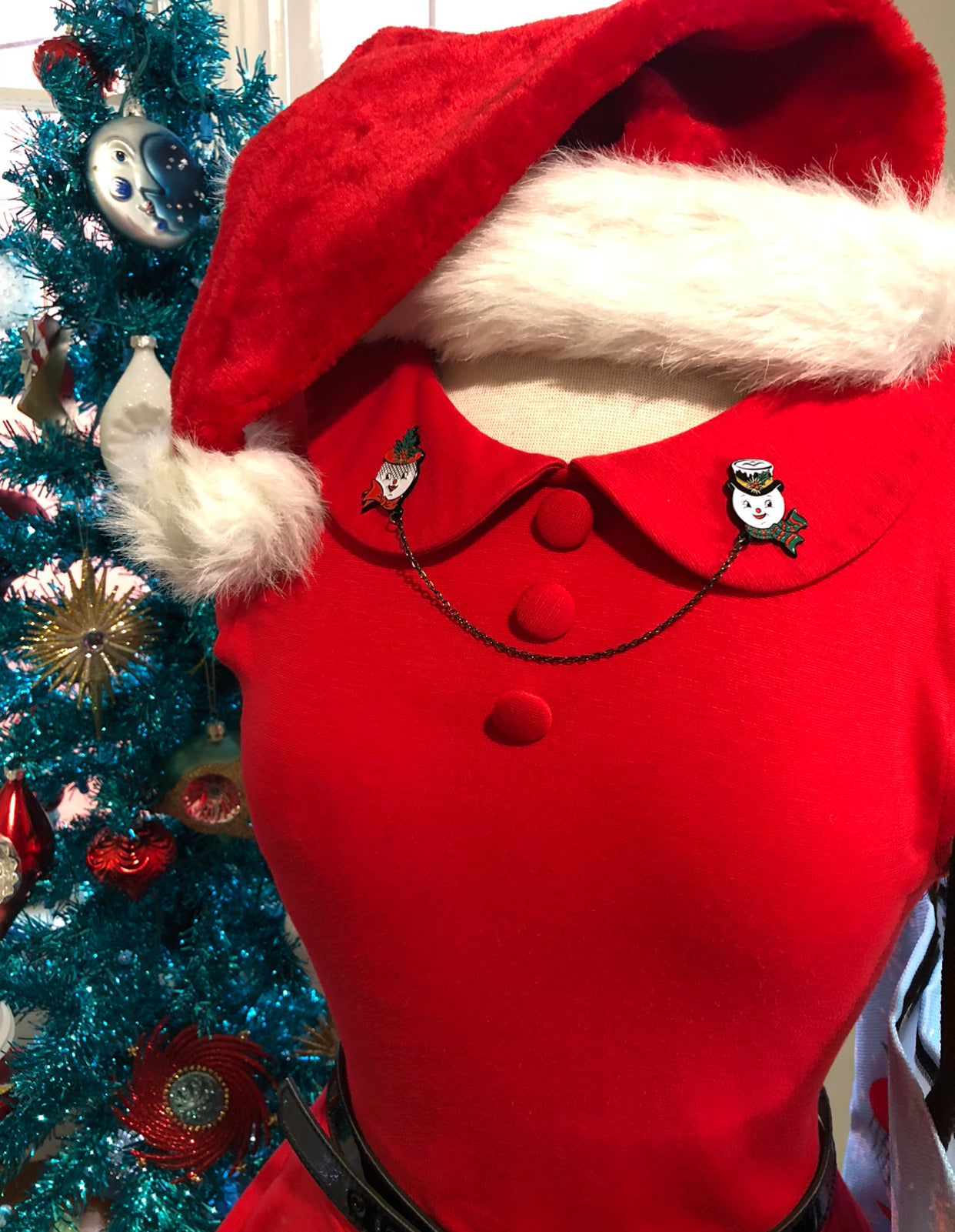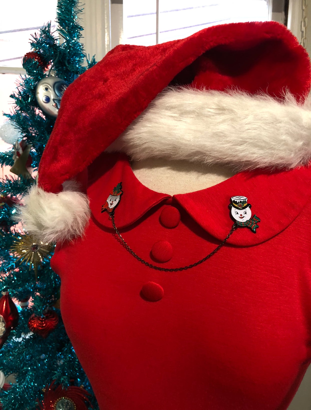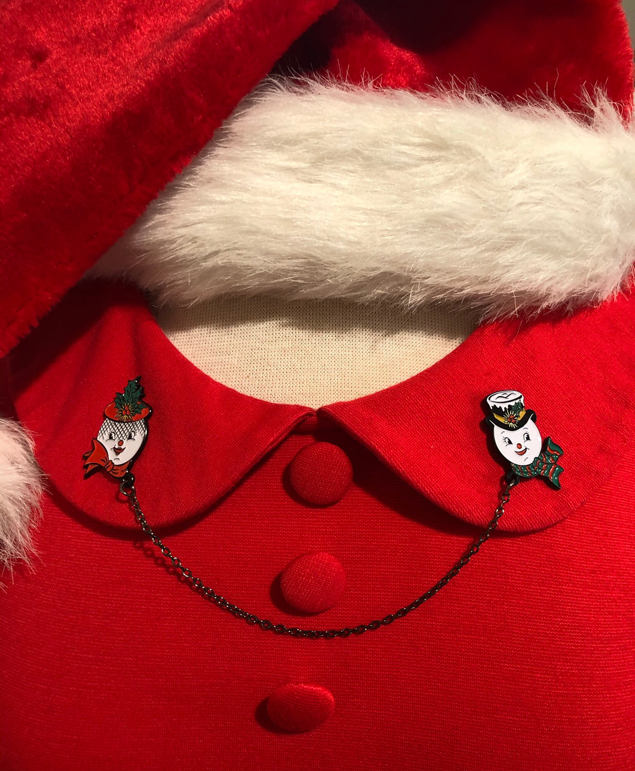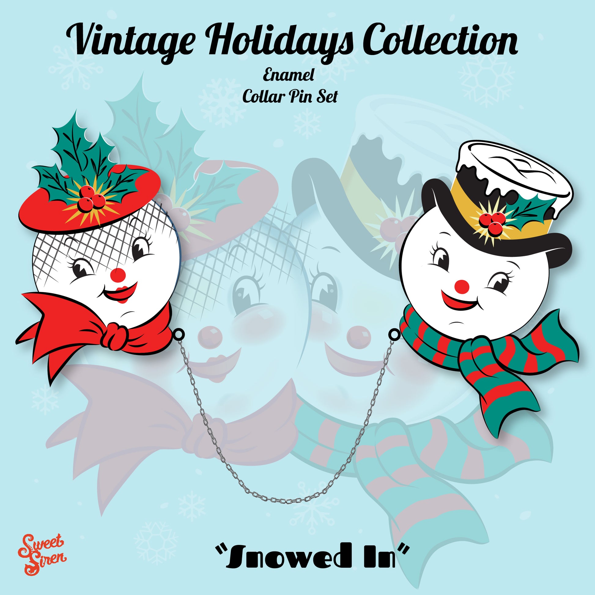 An adorable bundled up dapper snow “couple” with retro inspired accessories on - each it's own single enamel pin with a chain connecting them.