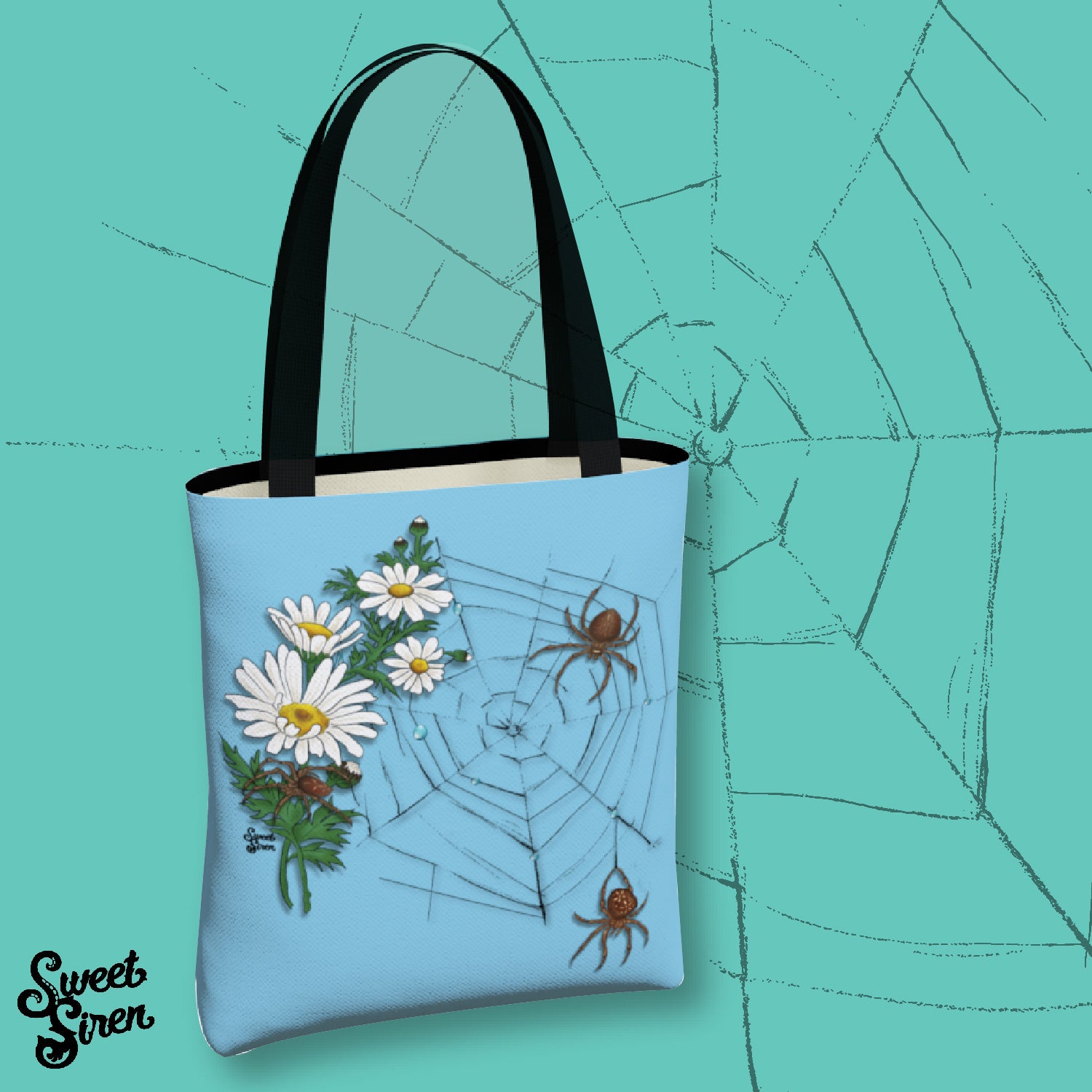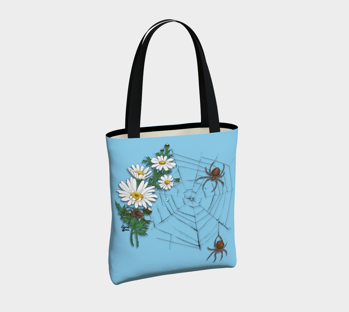 A Spring bunch of daisies blossoming with a dewy spider web attached to it hosting some busy spiders.