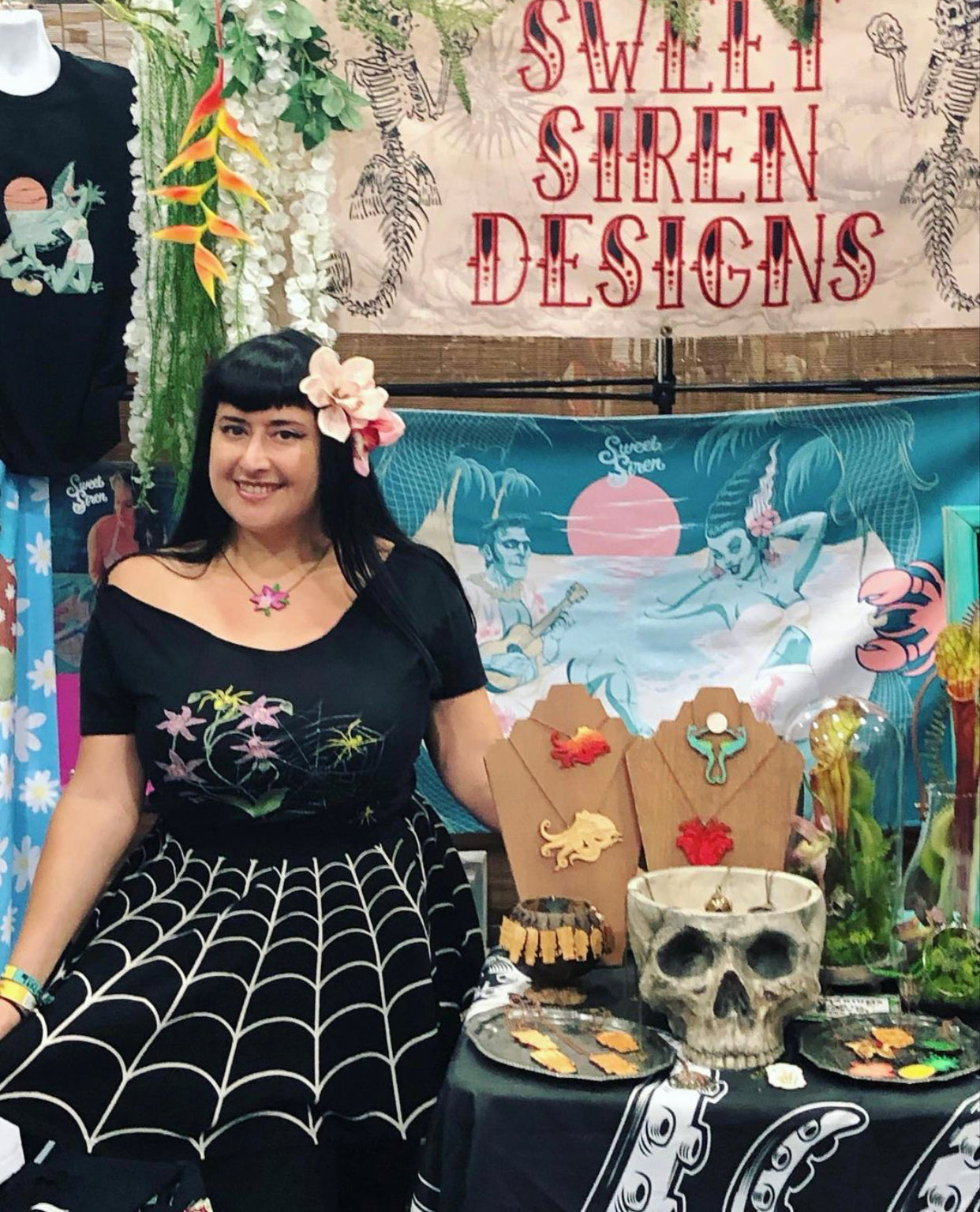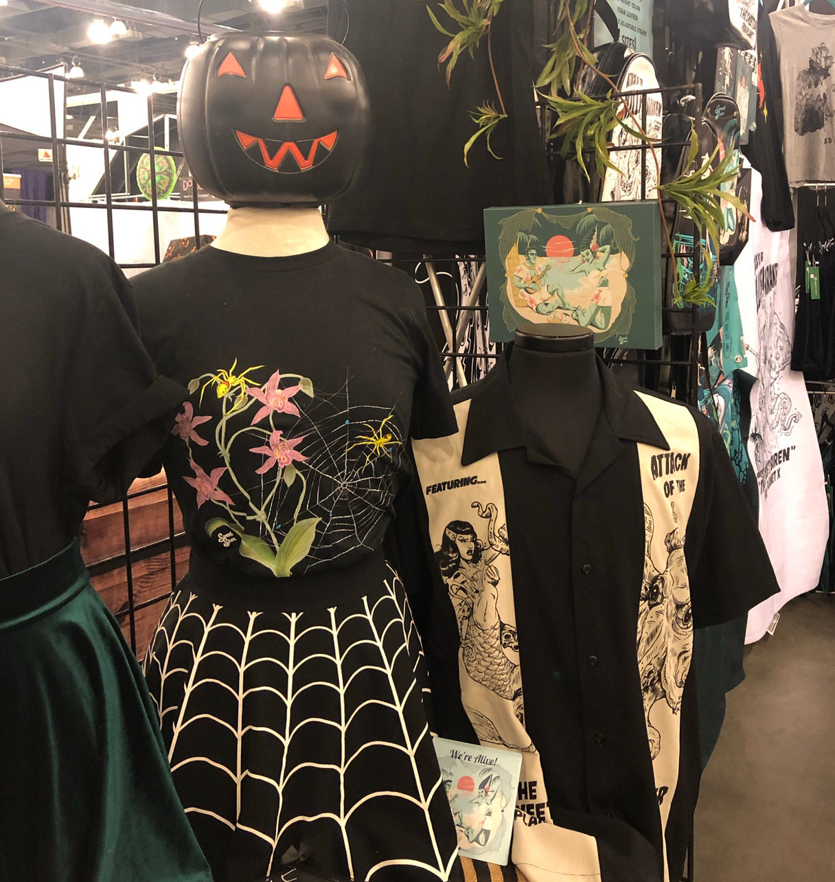 You'll cast a web of intrigue wearing the kreepsville 666 web skater skirt, flared skirt with wide elastic waistband, 95% cotton, 5% spandex with discharge print. Made in the USA.