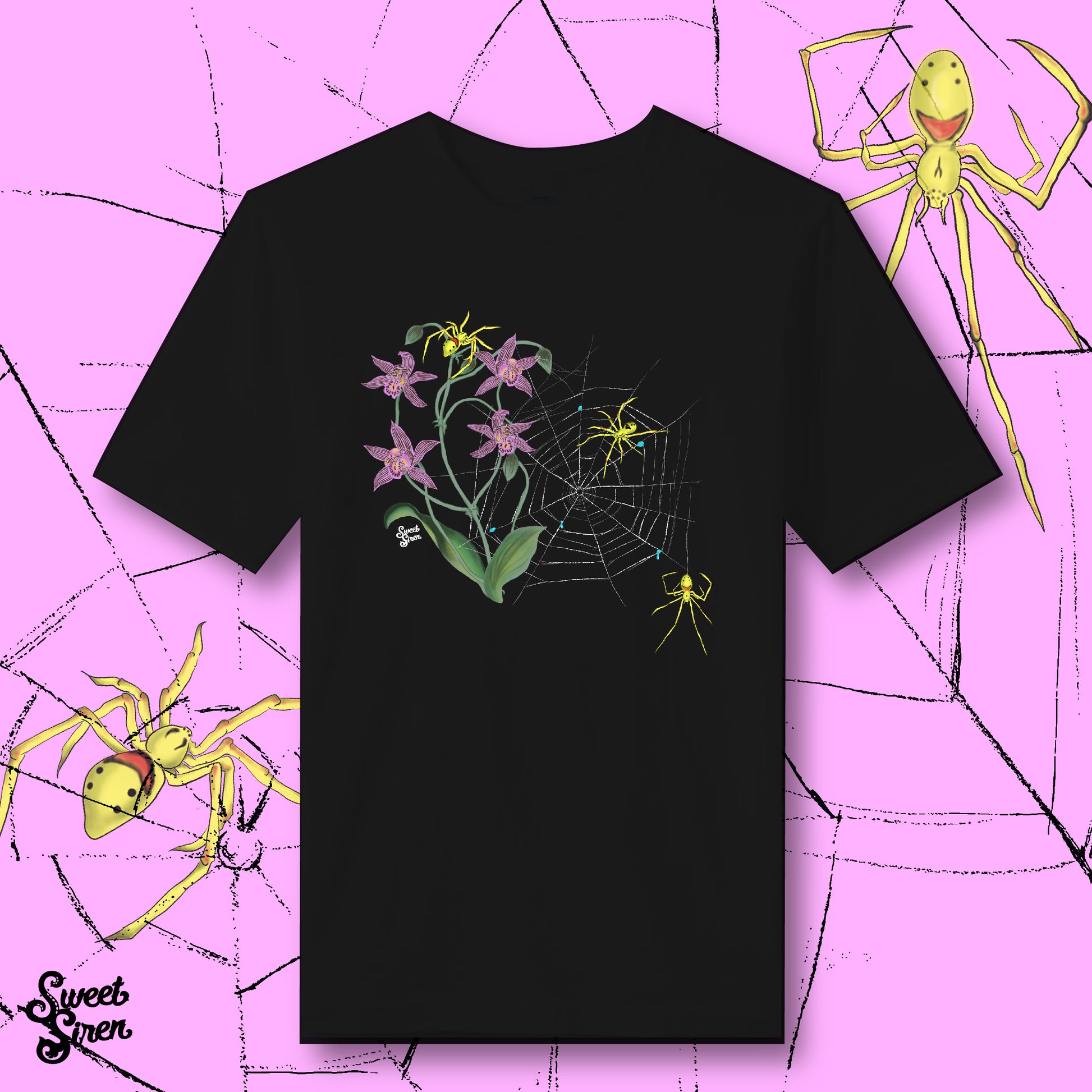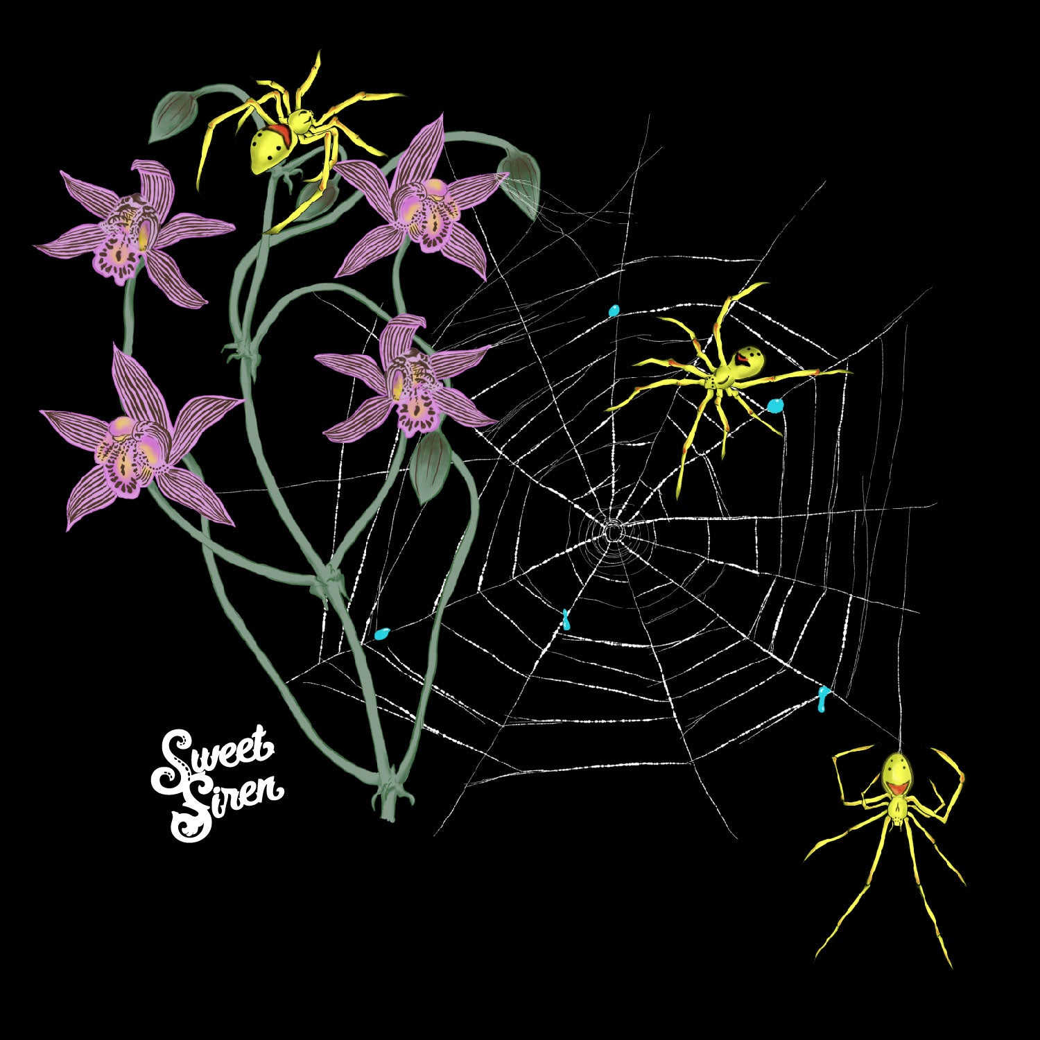 This Spider web design welcomes the season shift to Summer time, with tropical purple Orchid flowers and a bright beautiful yellow spider called the Theridion Grallator - AKA “the Hawaiian Happy Face Spider”, which as you may have guessed lives on the Hawaiian Islands.