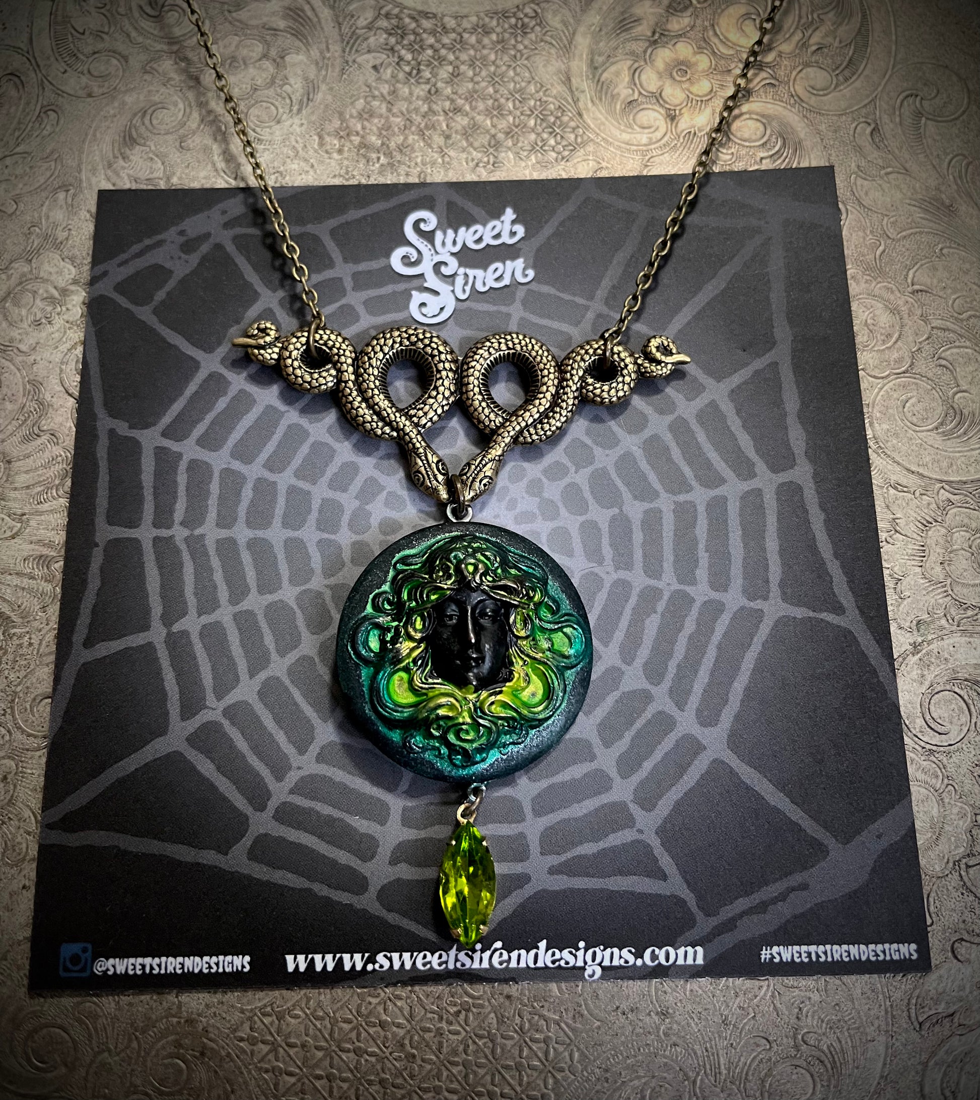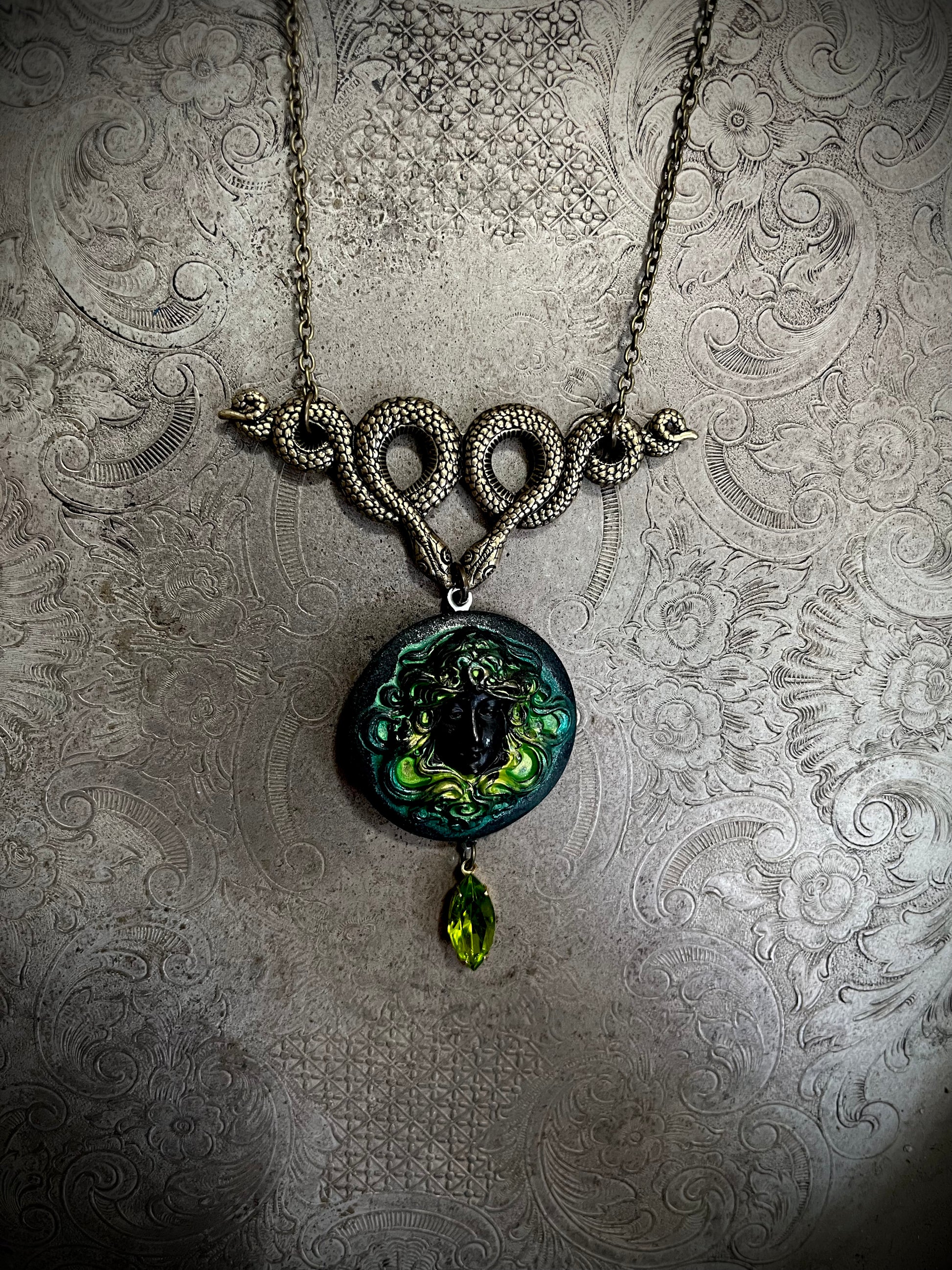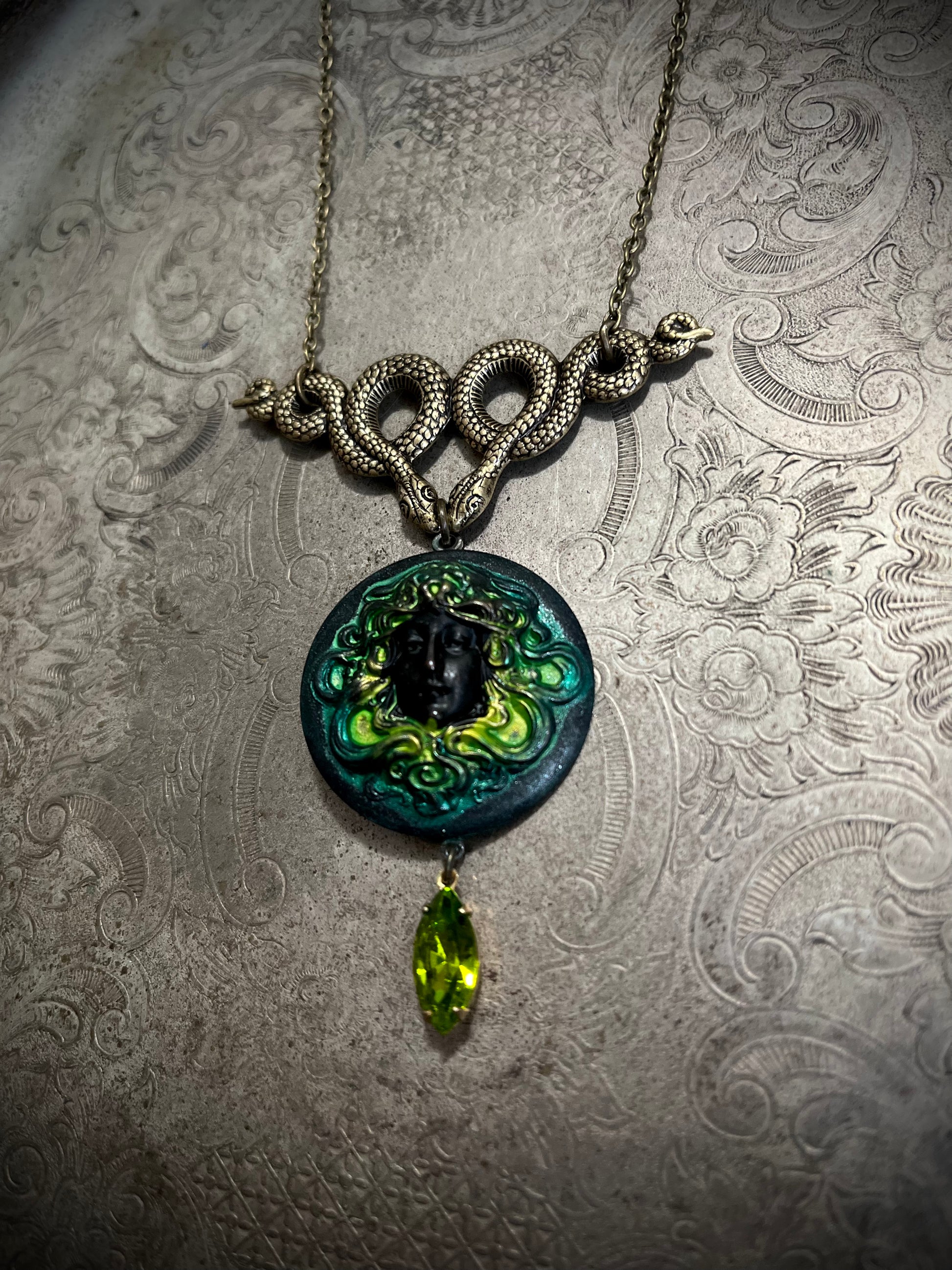 A hand painted brass stamping with antiqued blackened brass snakes and a green tear drop jewel.