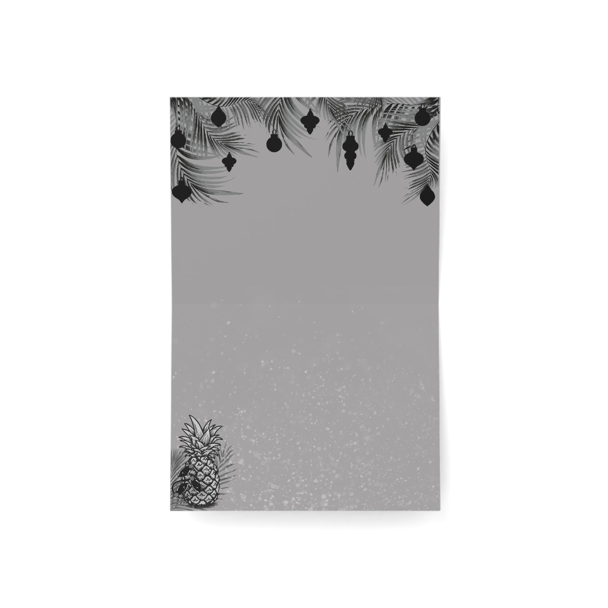 INSIDE CARD: Black palm leaves, dark holiday ornaments, goth pineapple with string lights and snow.
