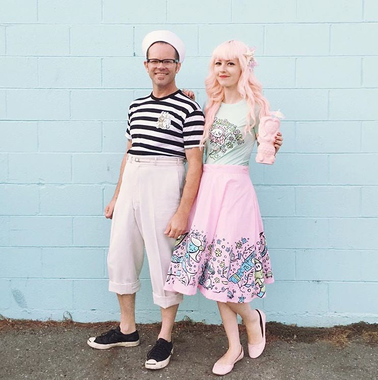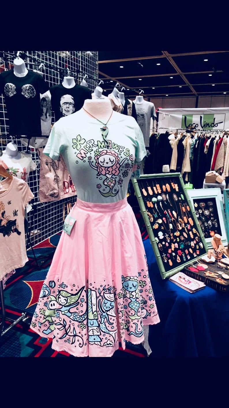 A bubbly, bright and fun swing skirt with a full front and back border print of Tiki Tony mermaids in action!