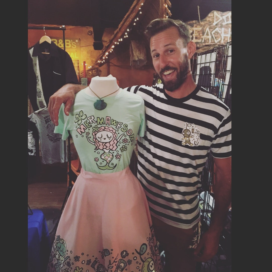 A soft, stretchy black and white striped Tiki Tony Diver tee that can fit any size!