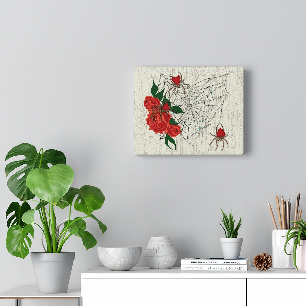 A vintage inspired postcard with a heart shaped spider web, red roses and brown spiders with hearts.