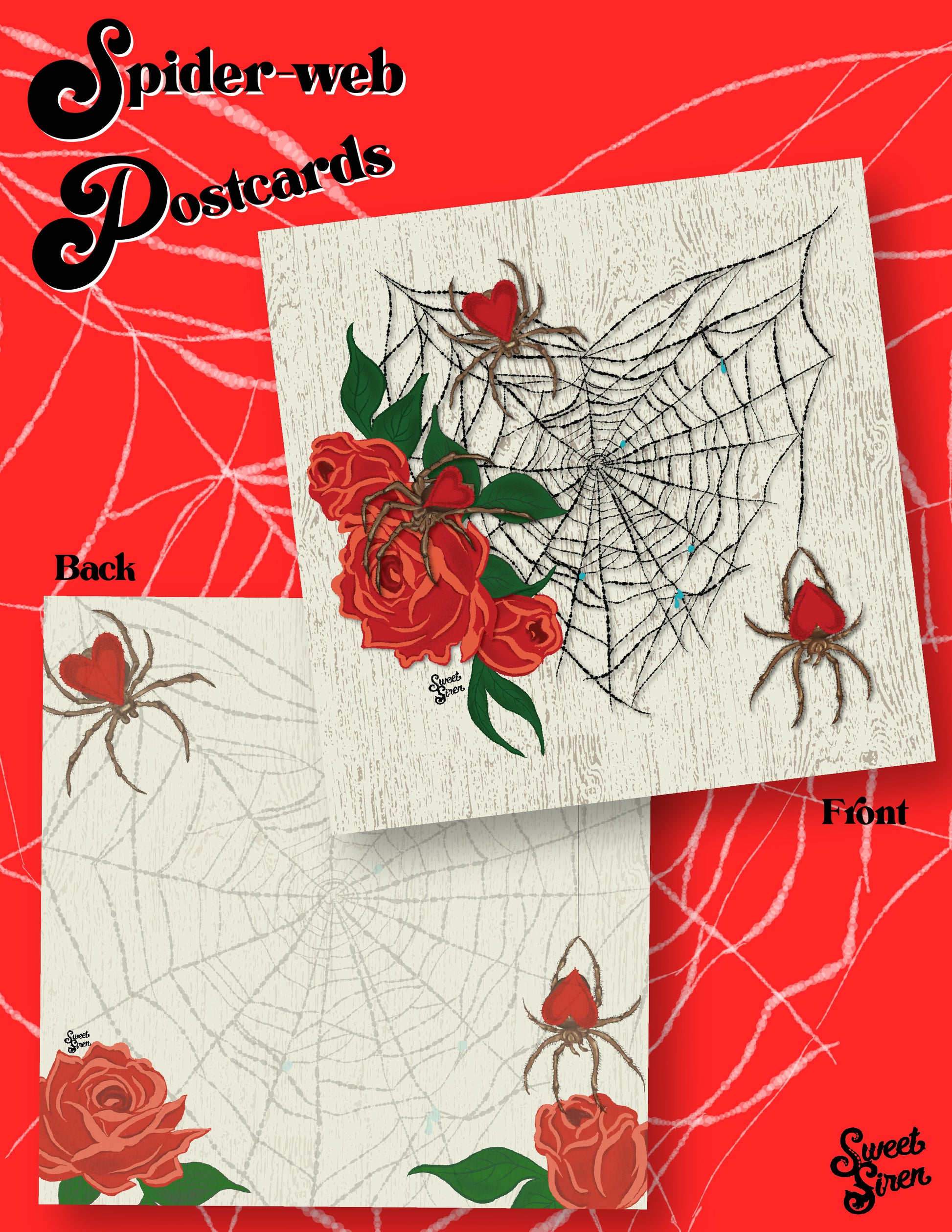 A vintage inspired postcard with a heart shaped spider web, red roses and brown spiders with hearts.
