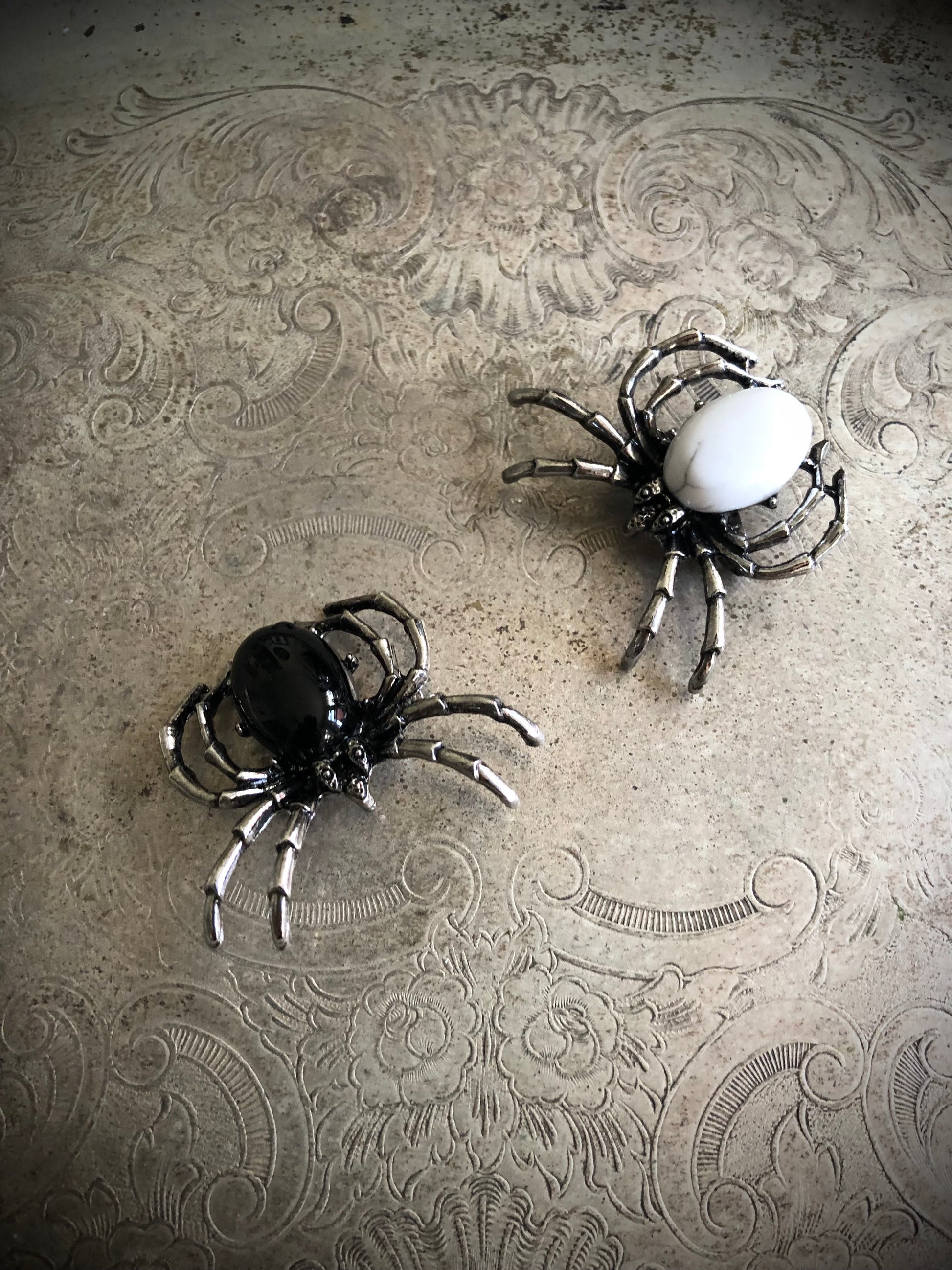 This little Spider brooch has a white Howlite stone body and antiques sliver plated brass findings.